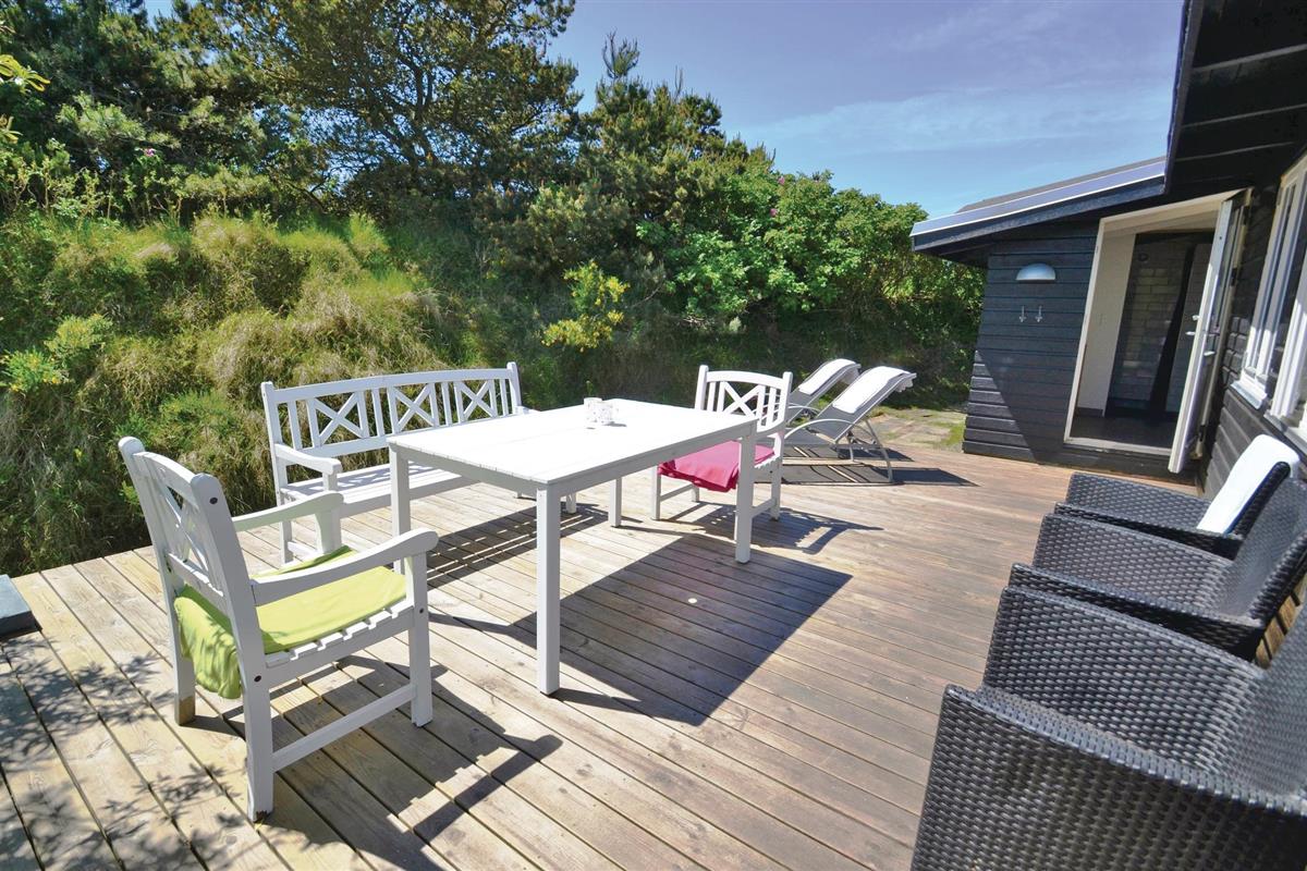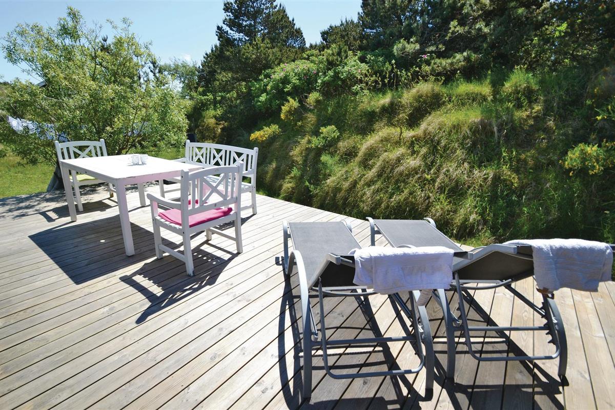 Het mooie terras ligt goed beschut aan de zuidkant van het huis. Hier is geen wind en, als het Deense weer het toelaat, de hele dag zon.
