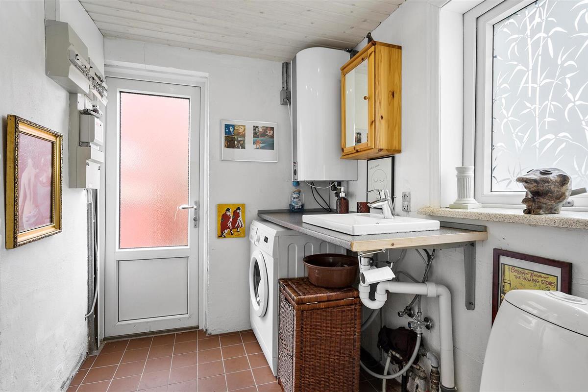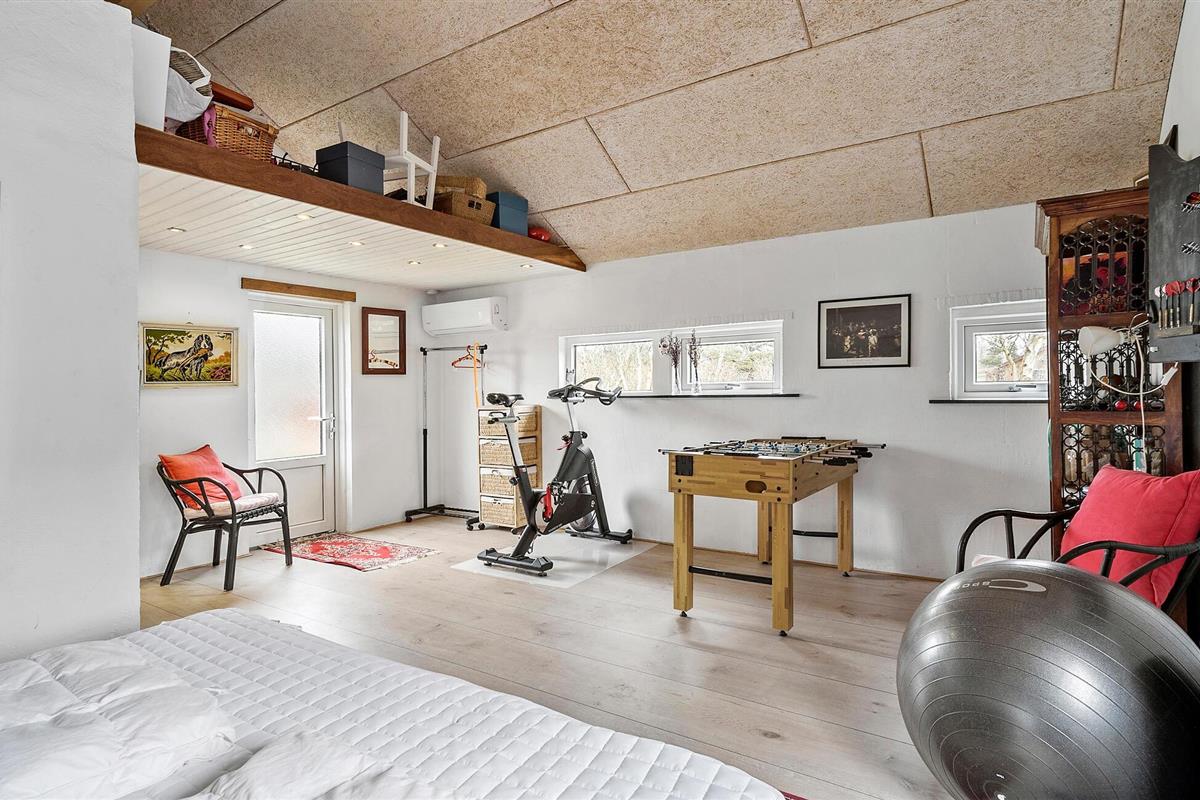 Vanuit de woonkamer heb je toegang tot een grote, lichtovergoten serre met een prachtig uitzicht op de tuin en de bomen daarachter. Knus hier met een boek dat je nog wilde lezen of ontspan op de ligstoelen in de zon met een koele verfrissing. Ondertussen kunnen de kinderen zich vermaken met een bal op het gazon of in de oude rubberboot, die is omgebouwd tot een charmante zandbak. Binnen zorgt de voetbaltafel voor vermaak.