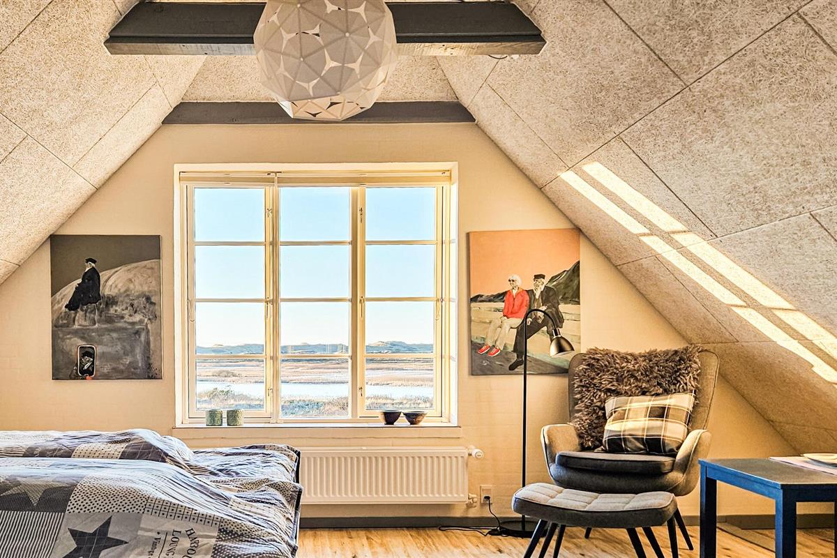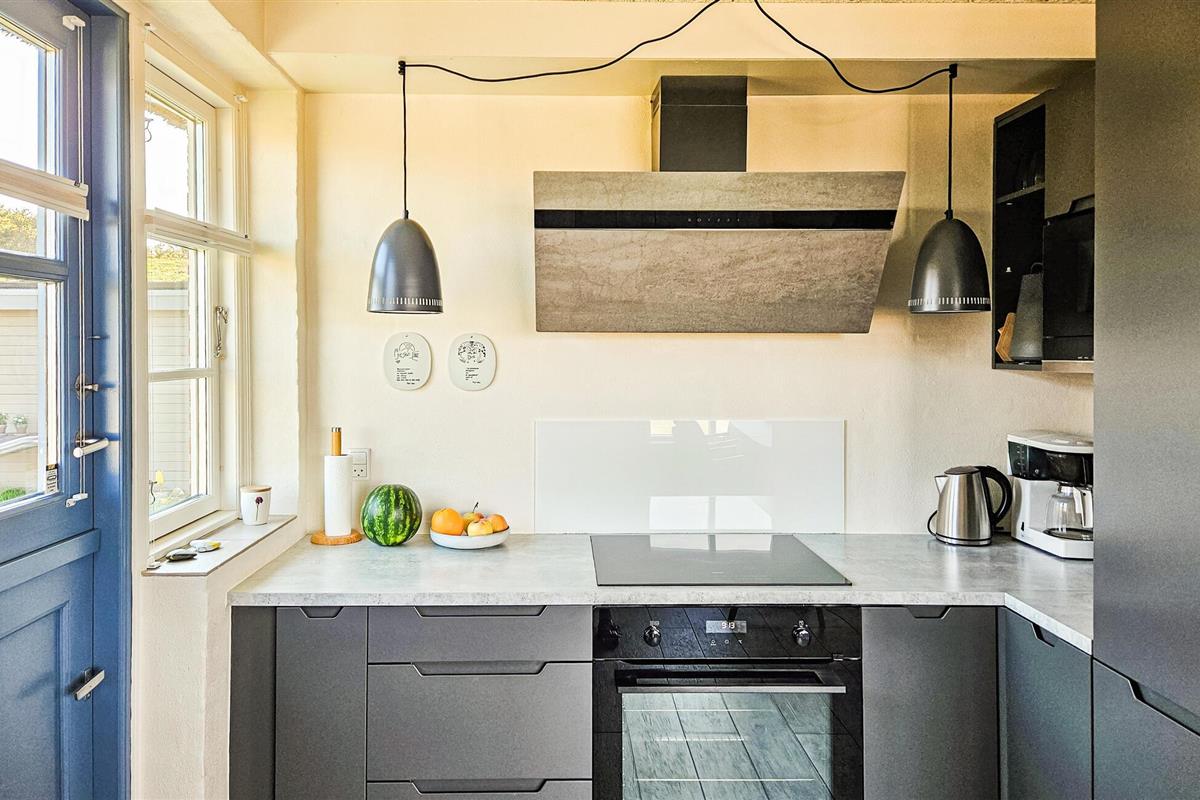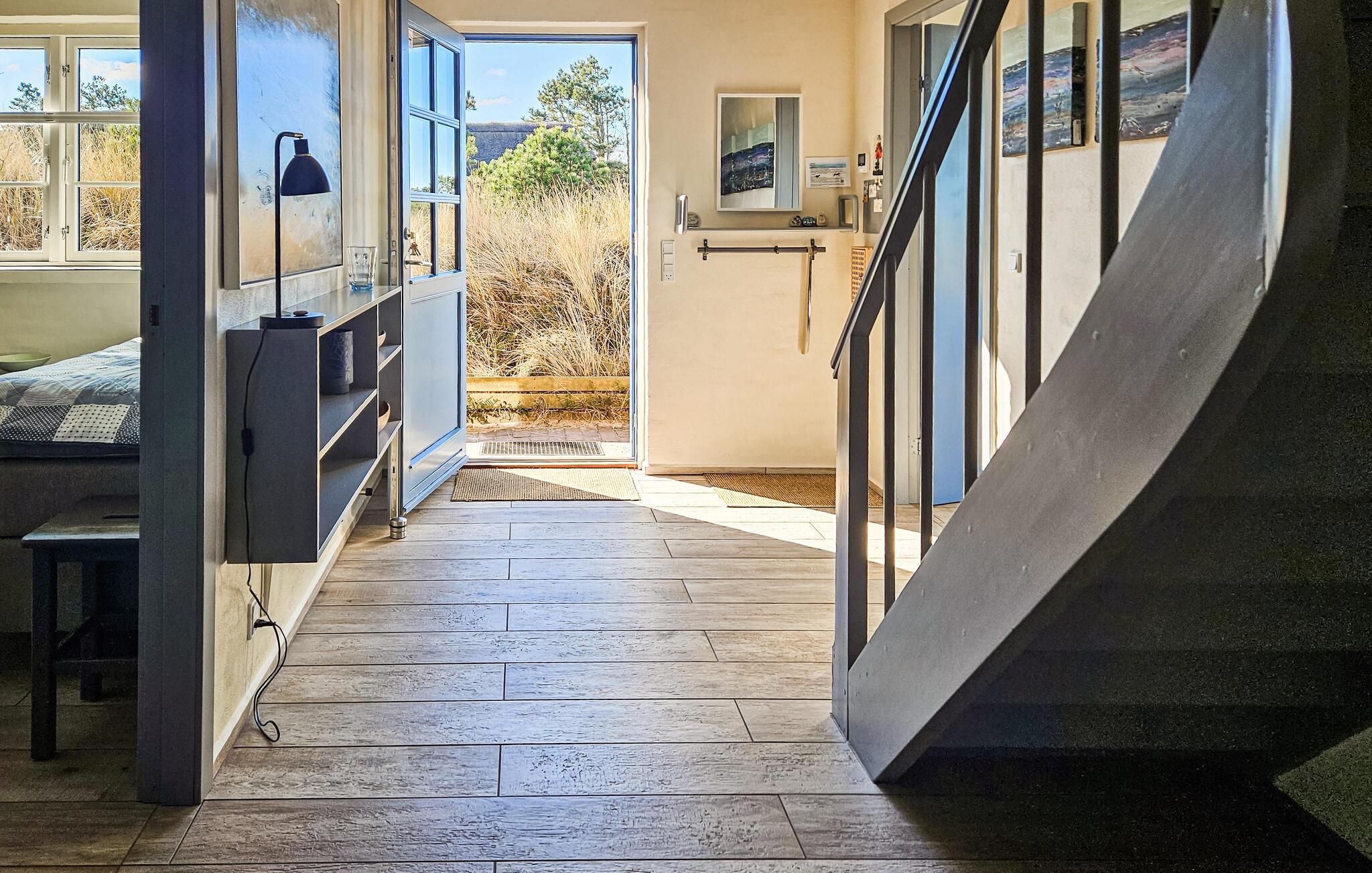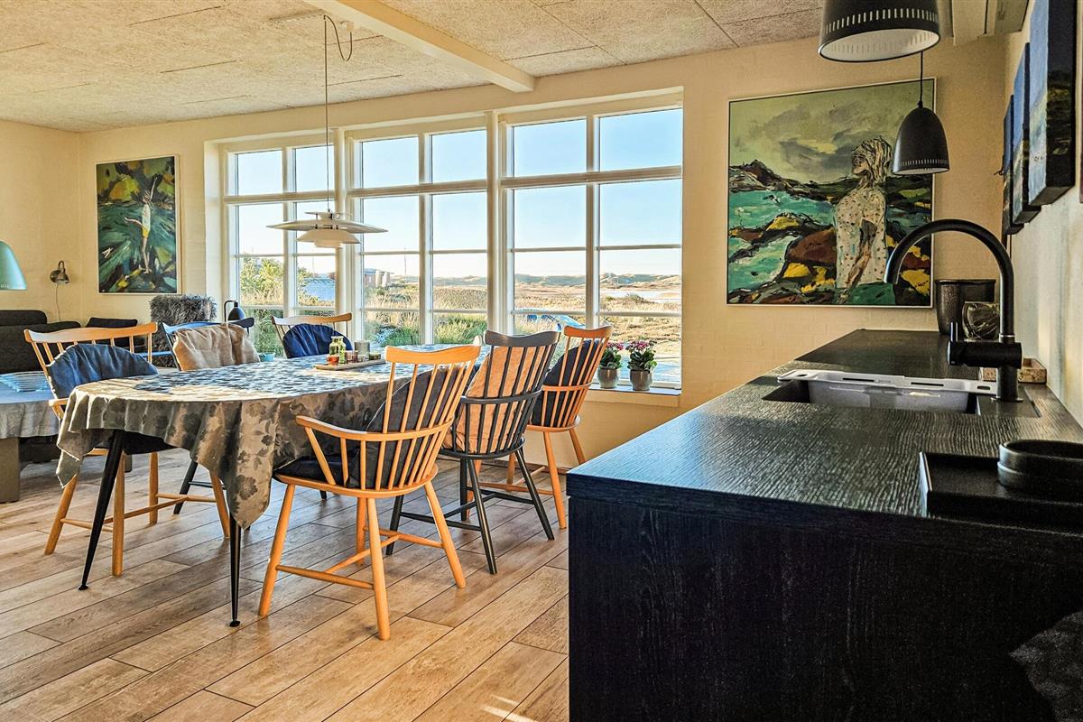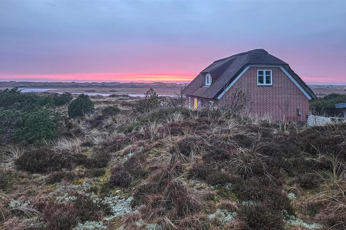 Het charmante huis met rieten dak, idyllisch gelegen in de duinen, nodigt je uit om even uit het dagelijkse leven te stappen en te genieten van de schoonheid van de Deense westkust. Kom binnen in de gezellige woonkamer met zijn mooie decoraties en geniet van de warme, uitnodigende sfeer. De grote ramen bieden overdag een uniek uitzicht aan de eettafel, en 's avonds kun je genieten van de bijzonder mooie avondlucht boven Nymindestrømmen. Maak het jezelf gemakkelijk in de gezellige fauteuils of op de bank en geniet van het uitzicht. De praktische keuken staat tot je beschikking om heerlijke maaltijden te bereiden. De aangrenzende eethoek met panoramische ramen biedt een heerlijke plek om samen te eten terwijl je uitkijkt over de duinen.