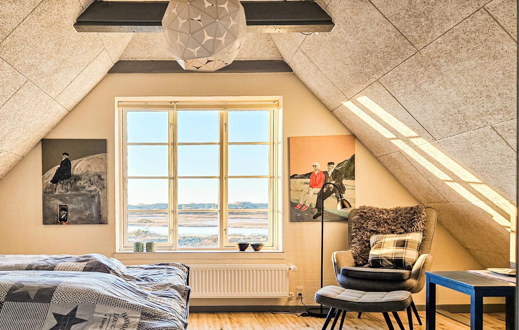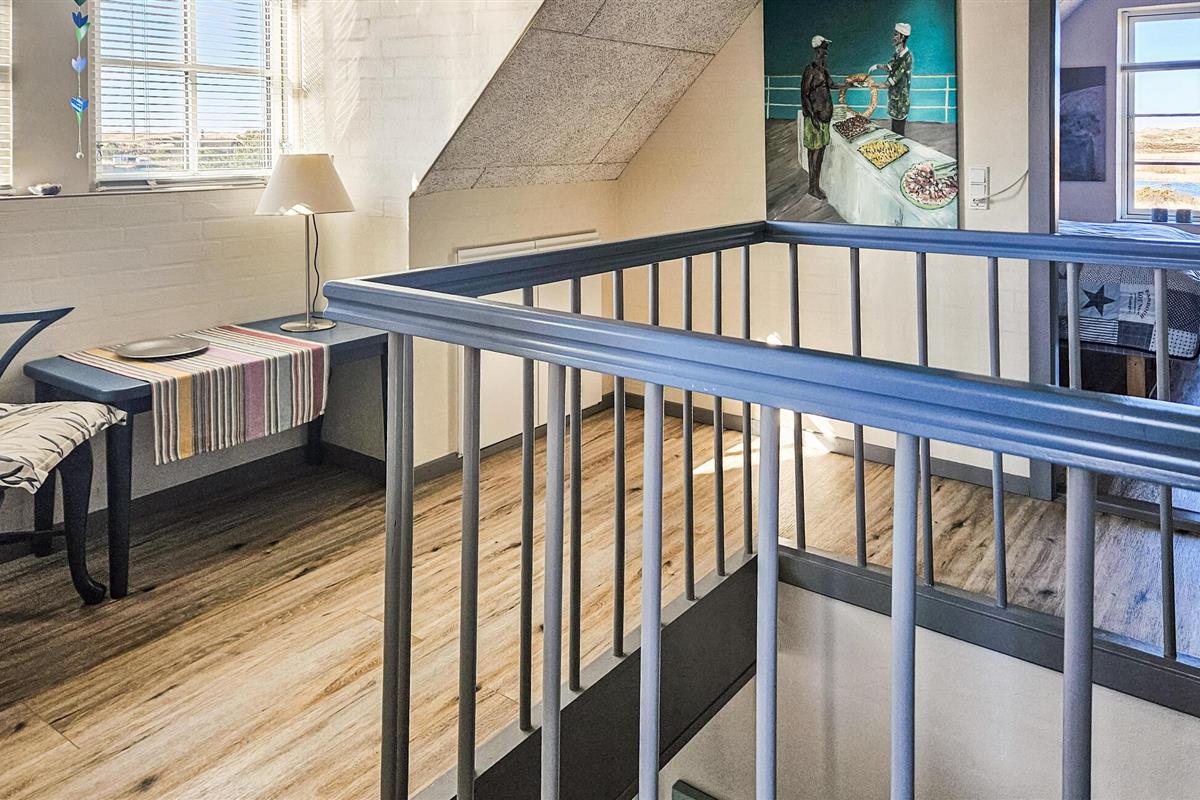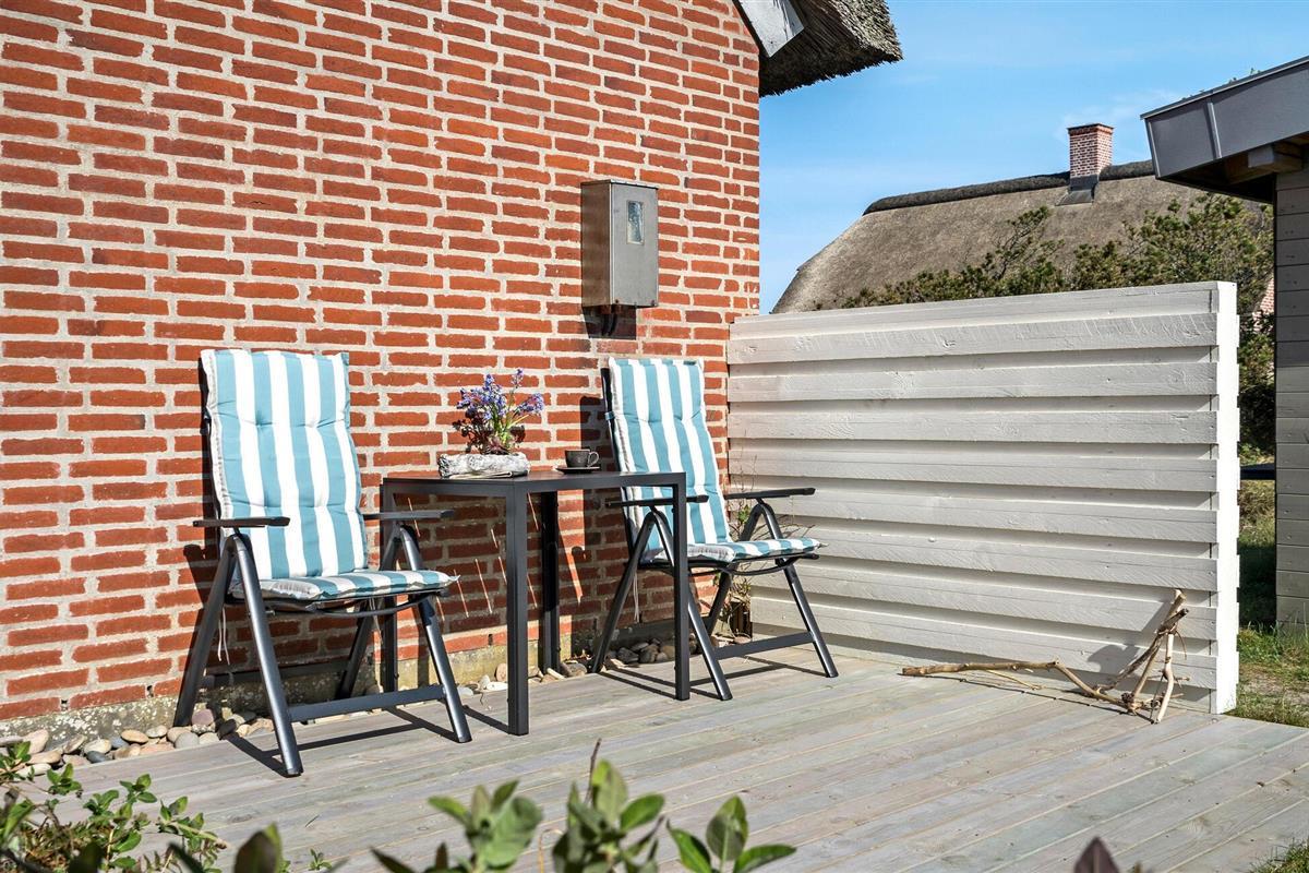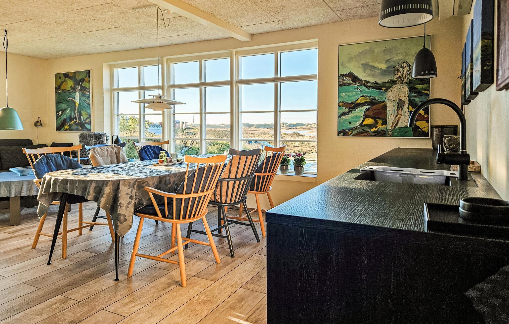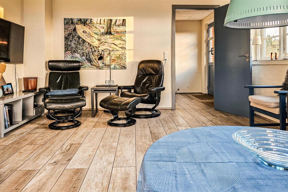 Het charmante huis met rieten dak, idyllisch gelegen in de duinen, nodigt je uit om even uit het dagelijkse leven te stappen en te genieten van de schoonheid van de Deense westkust. Kom binnen in de gezellige woonkamer met zijn mooie decoraties en geniet van de warme, uitnodigende sfeer. De grote ramen bieden overdag een uniek uitzicht aan de eettafel, en 's avonds kun je genieten van de bijzonder mooie avondlucht boven Nymindestrømmen. Maak het jezelf gemakkelijk in de gezellige fauteuils of op de bank en geniet van het uitzicht. De praktische keuken staat tot je beschikking om heerlijke maaltijden te bereiden. De aangrenzende eethoek met panoramische ramen biedt een heerlijke plek om samen te eten terwijl je uitkijkt over de duinen.