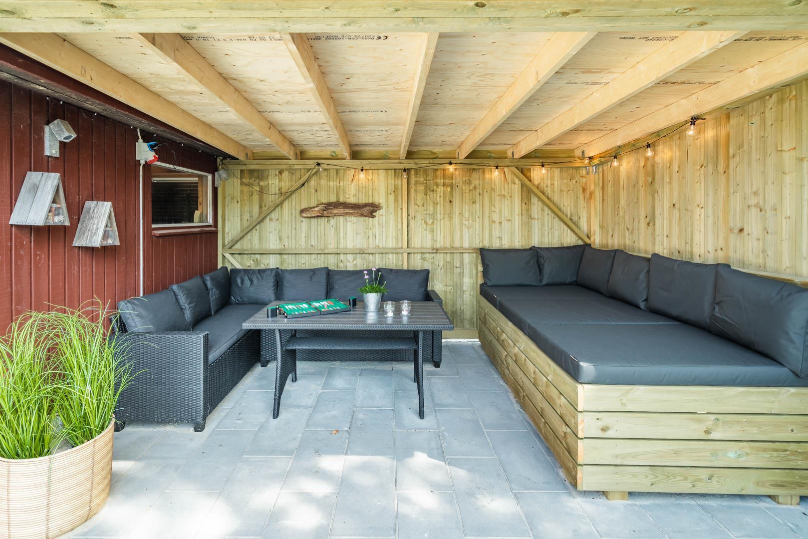 Ein besonderer Mittelpunkt ist die überdachte Terrasse, die sich wunderbar für gemeinsame Mahlzeiten an der frischen Luft eignet. Ob Frühstück im Sonnenschein, ein Grillabend mit Freunden oder entspannte Stunden bei einem Glas Wein – hier lässt es sich zu jeder Tageszeit genießen.