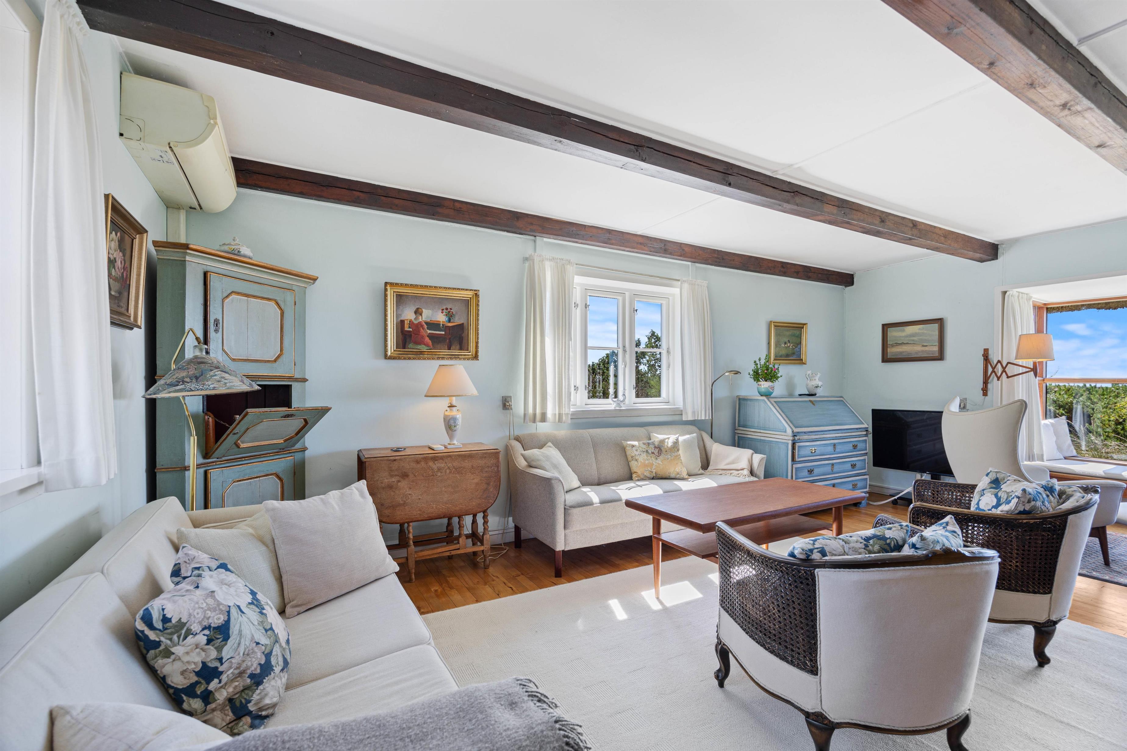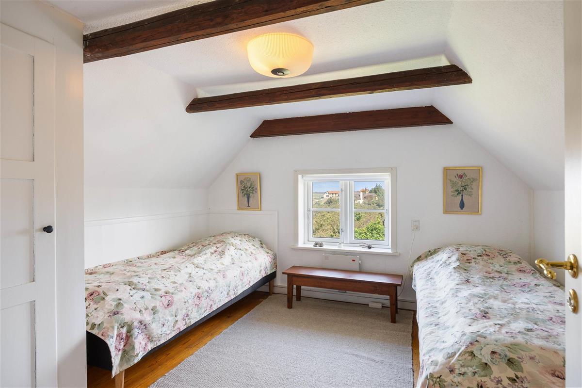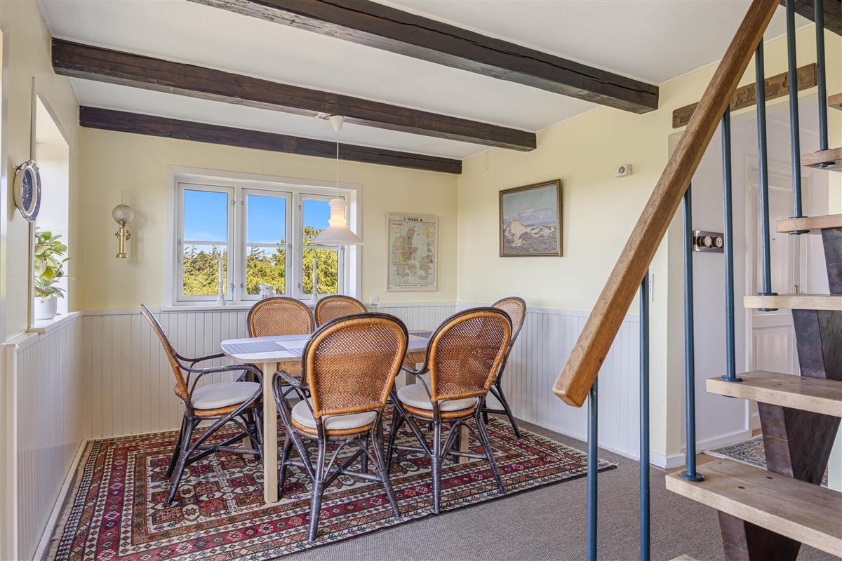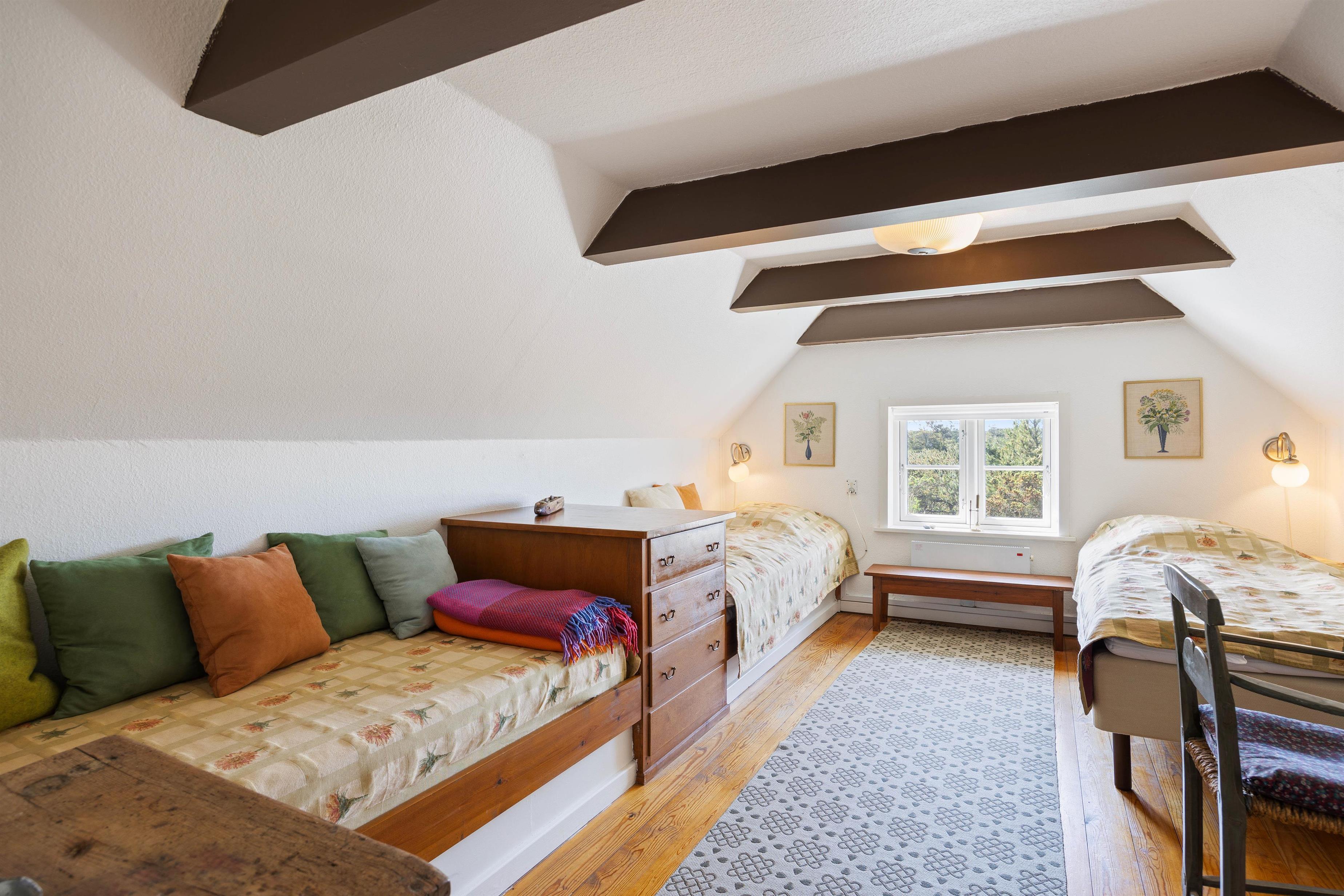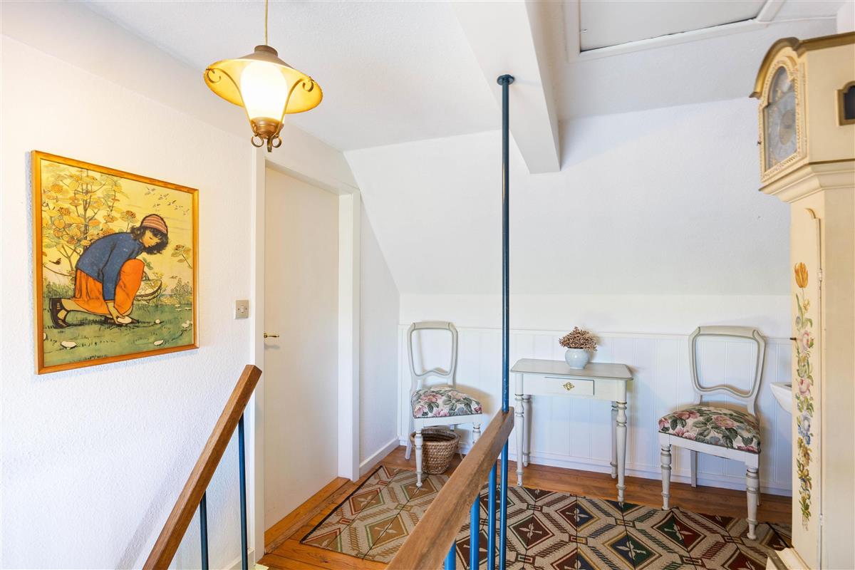The 125 square metres of living space are spread across two floors, featuring exposed ceiling beams throughout. Please note that the first floor has low ceiling heights. The ground floor comprises separate kitchen, dining room and living room. The dining room offers a perfect gathering spot for meals and perhaps some puzzle-solving afterwards.