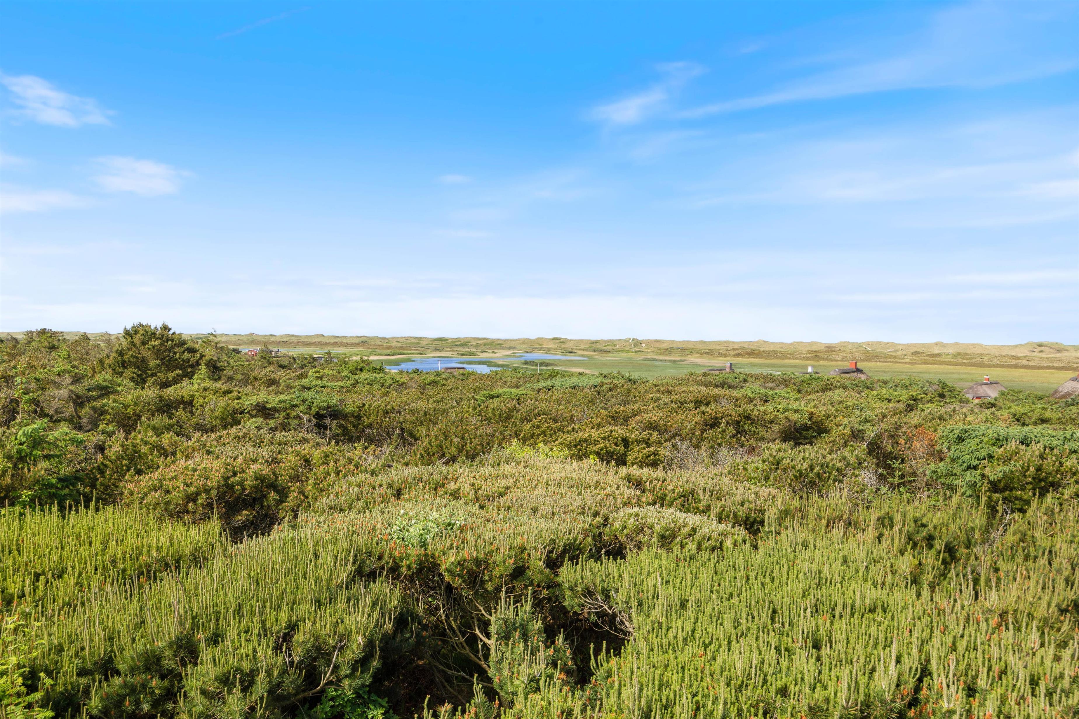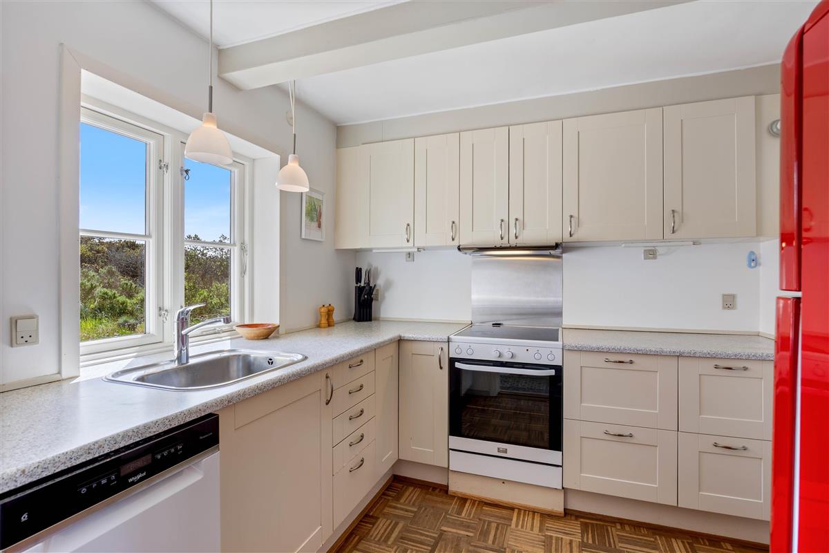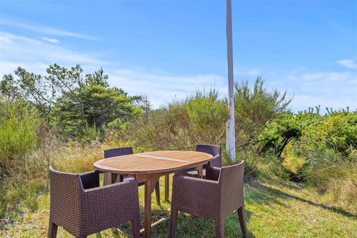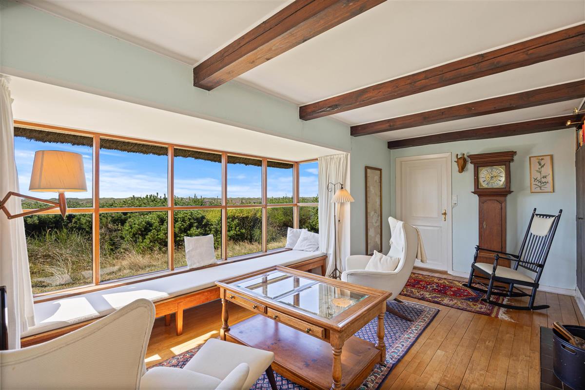 In the living room with its wood-burning stove, you can enjoy a cup of coffee and a good book from the window seat or one of the armchairs. From here, you'll have lovely views across the North Sea dunes. The heat pump provides efficient temperature control throughout the holiday home.