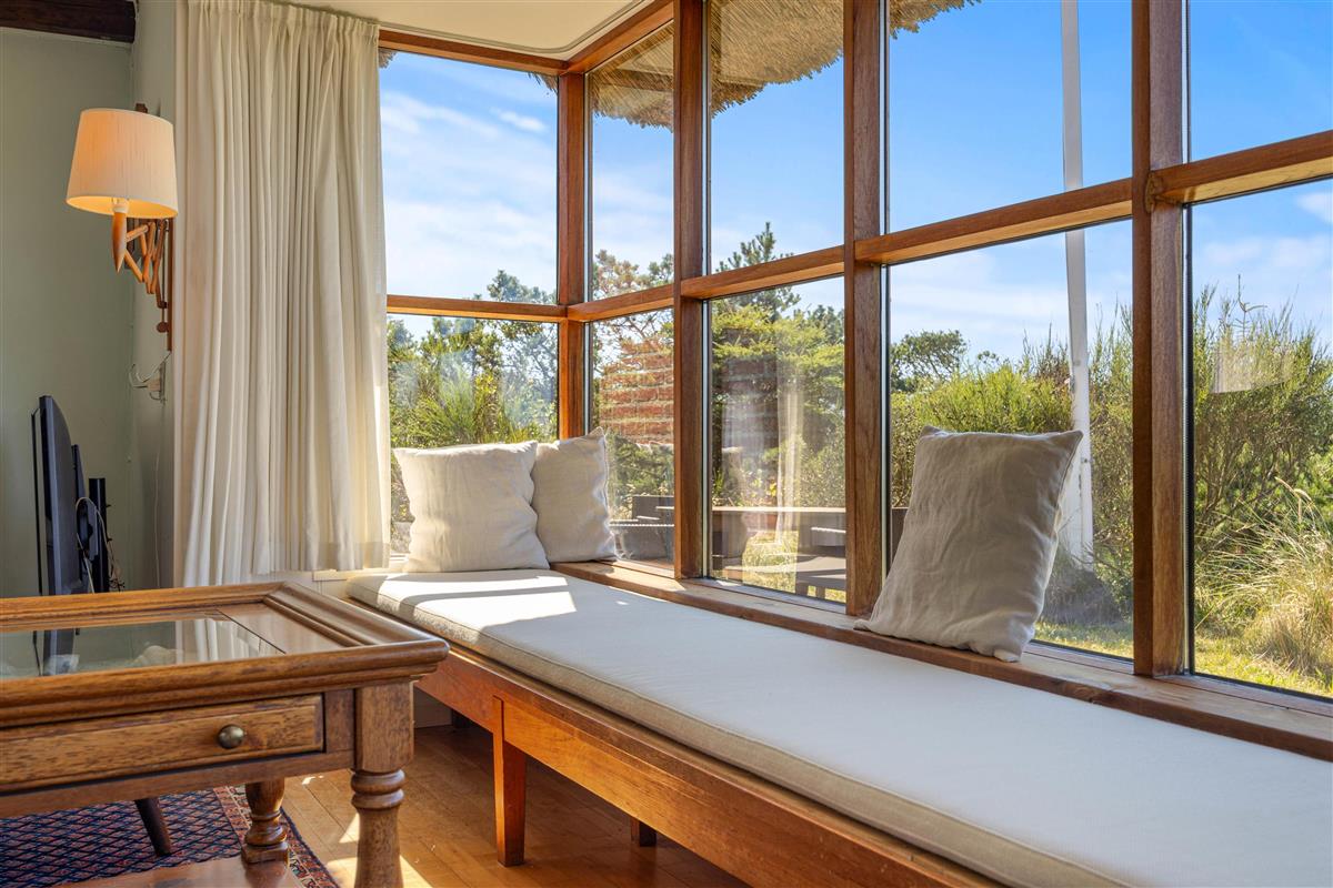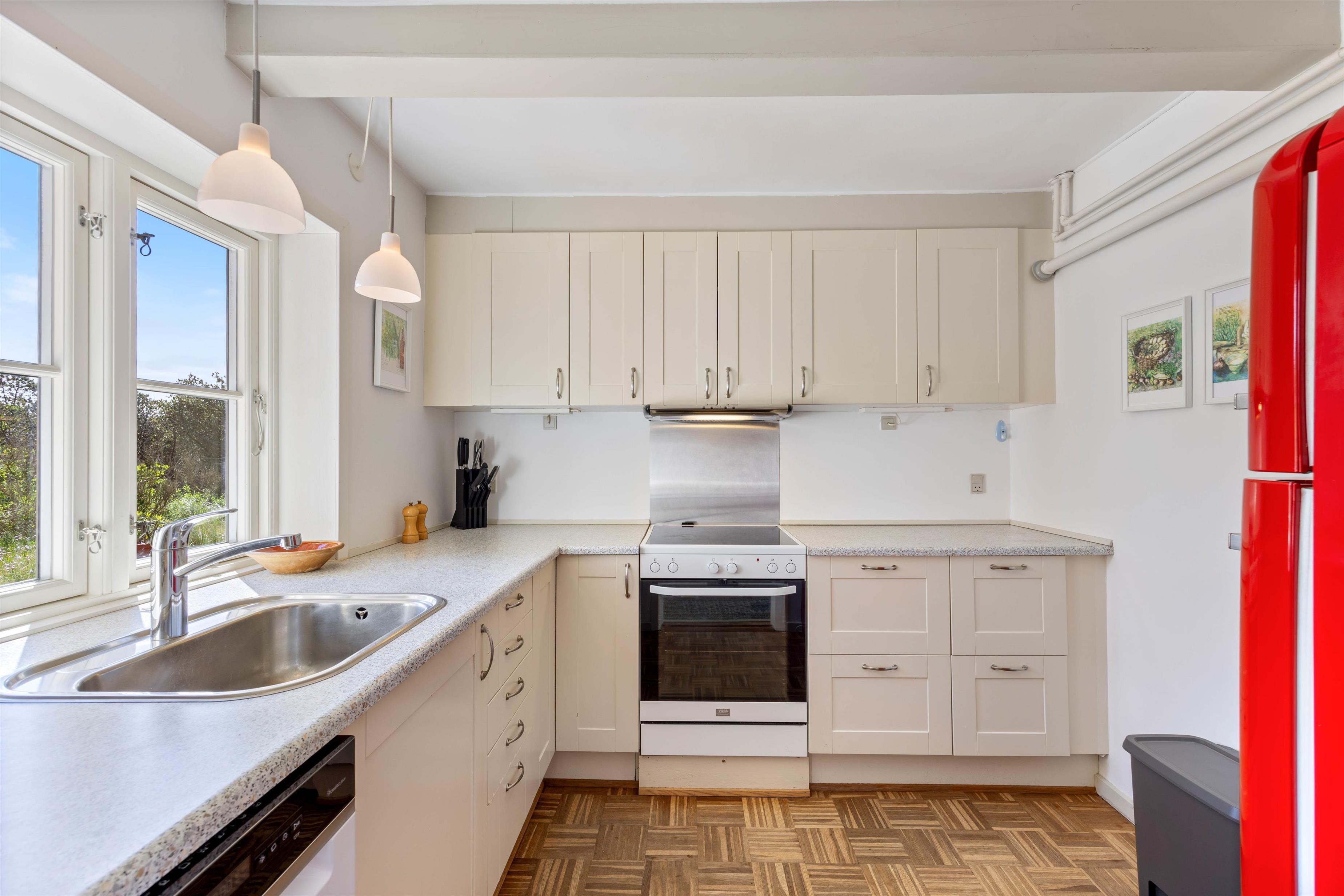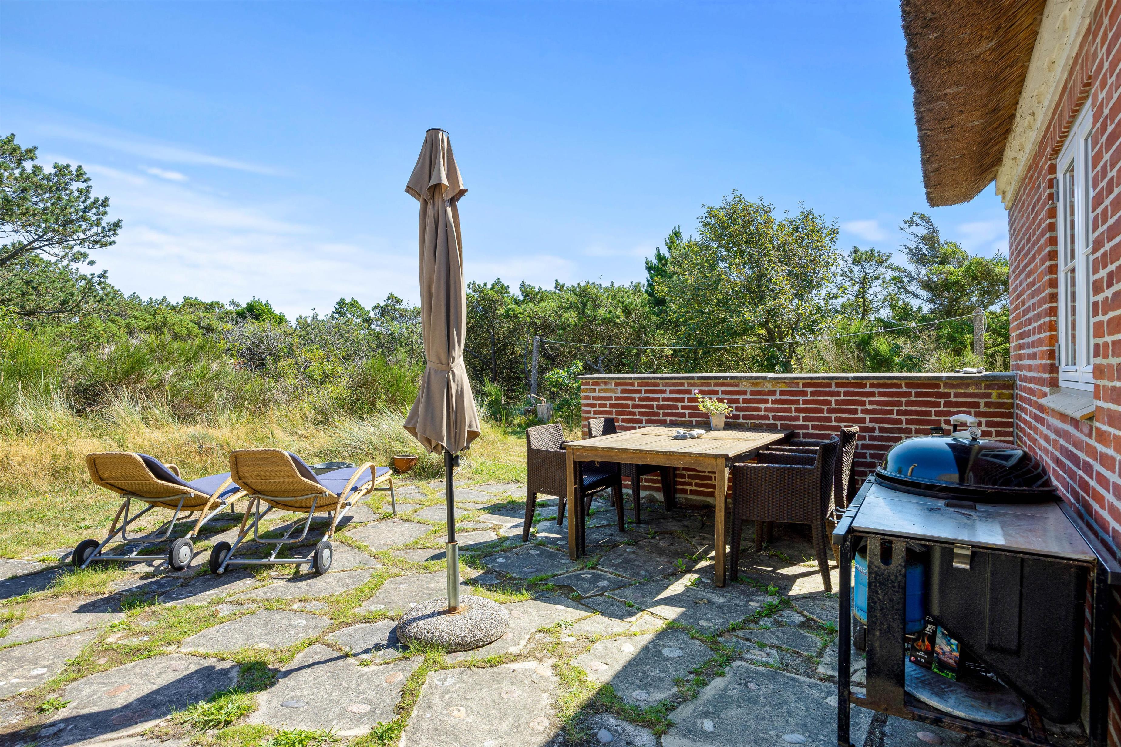 In the living room with its wood-burning stove, you can enjoy a cup of coffee and a good book from the window seat or one of the armchairs. From here, you'll have lovely views across the North Sea dunes. The heat pump provides efficient temperature control throughout the holiday home.