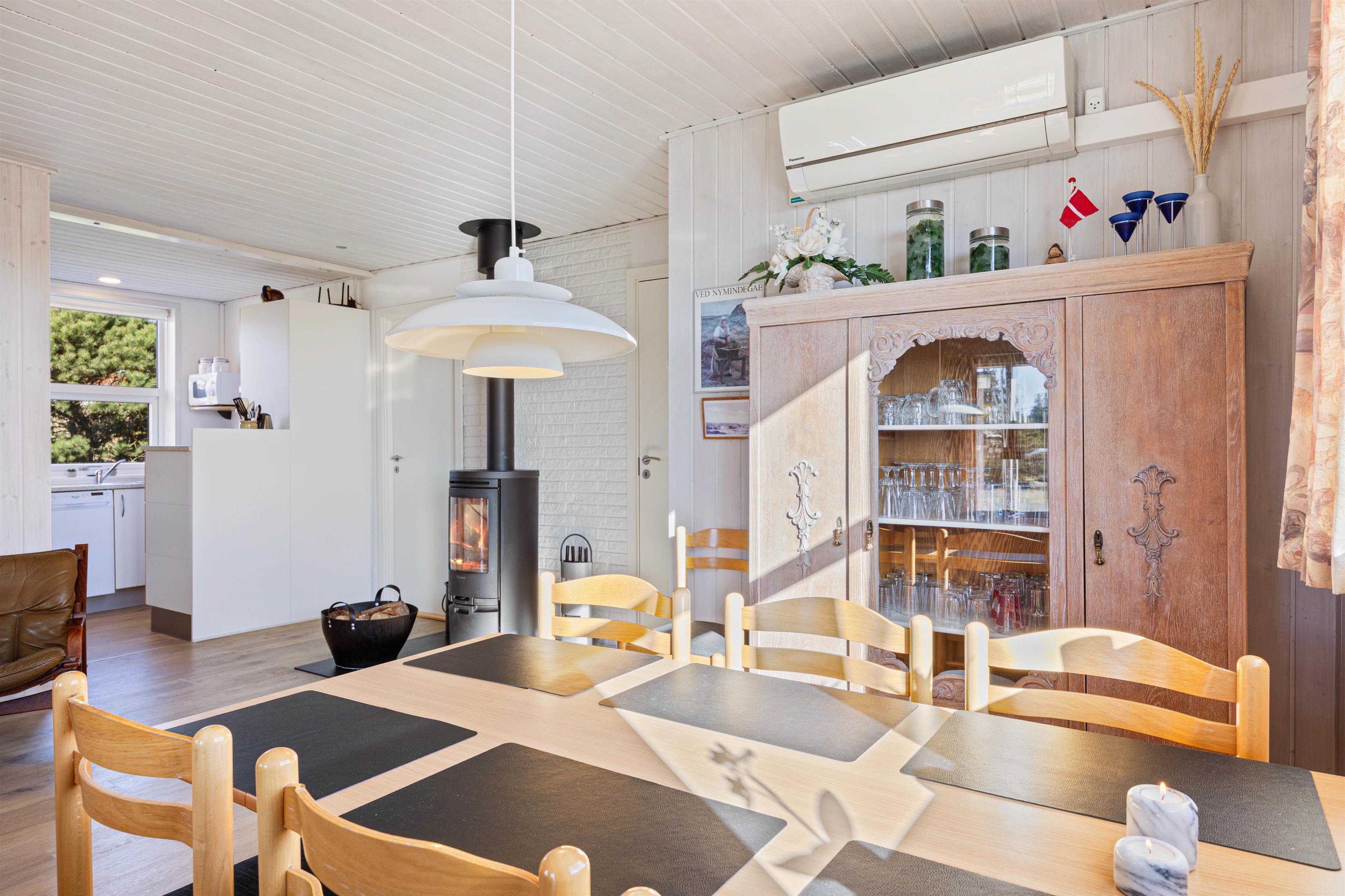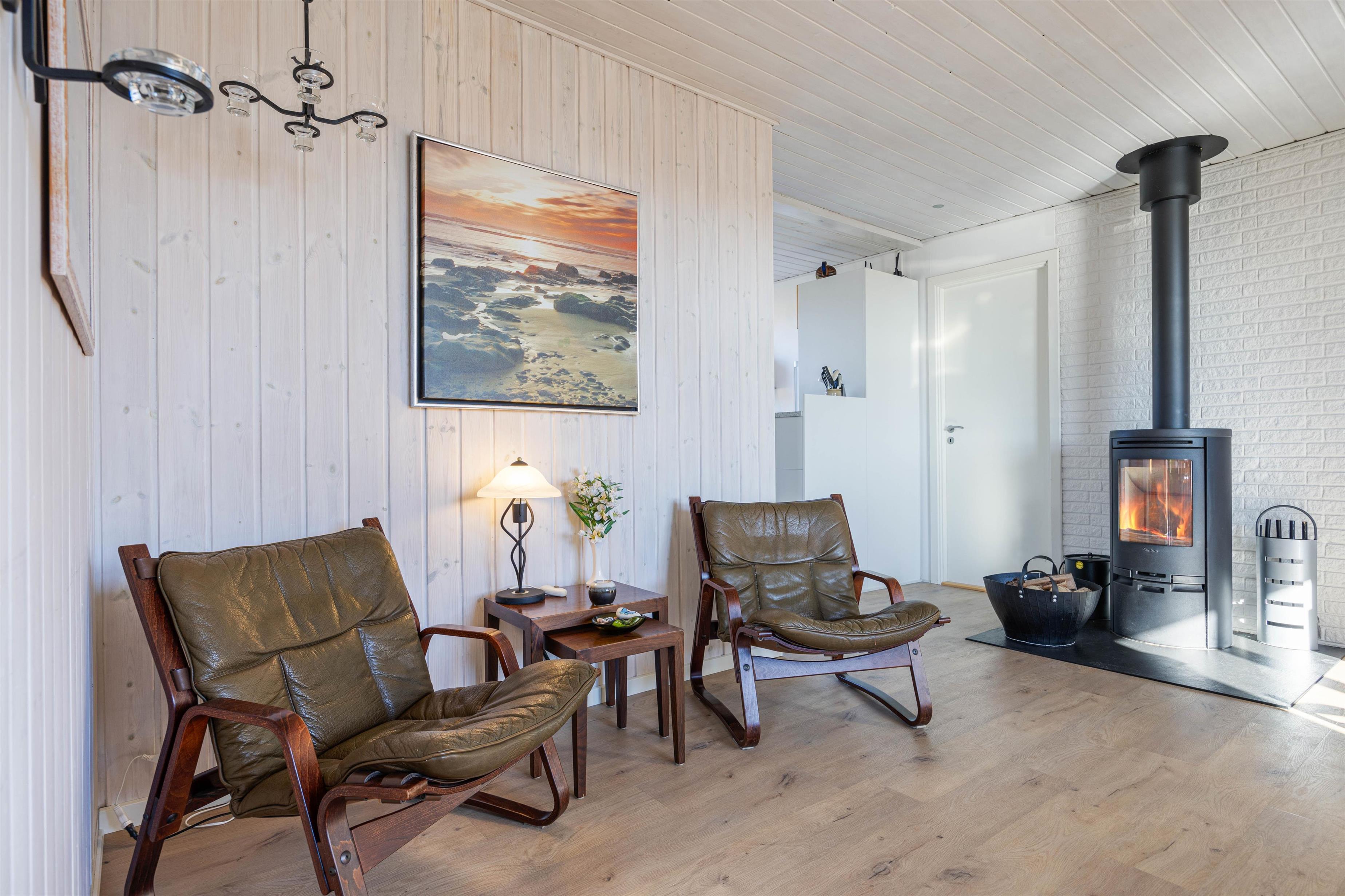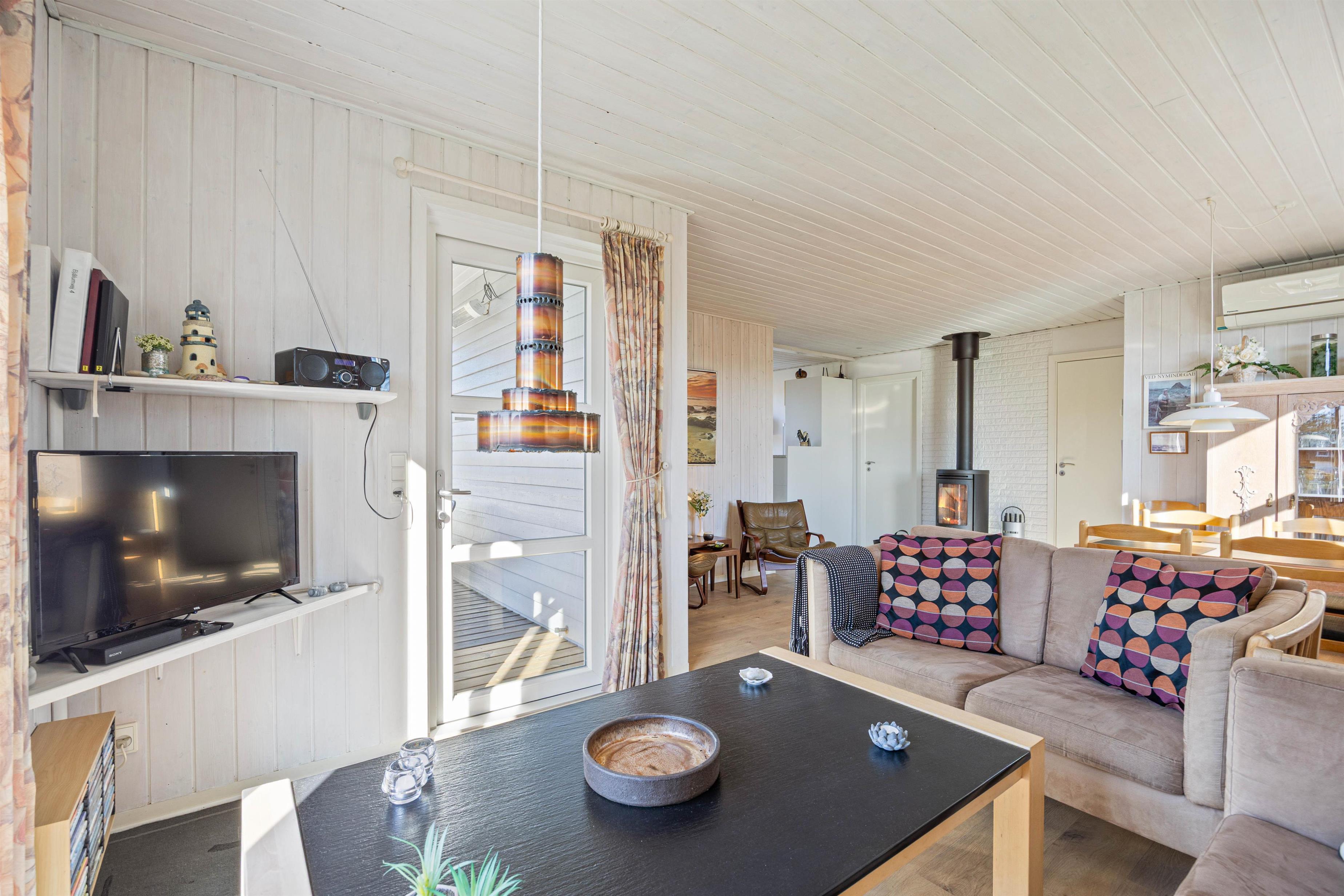 Der Innenbereich des Ferienhauses begrüßt euch mit einer gemütlichen Atmosphäre, ideal für erholsame Tage und gesellige Abende. Im mit Liebe zum Detail eingerichteten Wohnbereich erwartet euch ein Fernseher und ein Bluetooth-Lautsprecher, die für Unterhaltung sorgen. Der Kaminofen bietet an kühlen Abenden wohlige Wärme und eine tolle Atmosphäre, während die energiesparende Wärmepumpe ein angenehmes Raumklima gewährleistet.