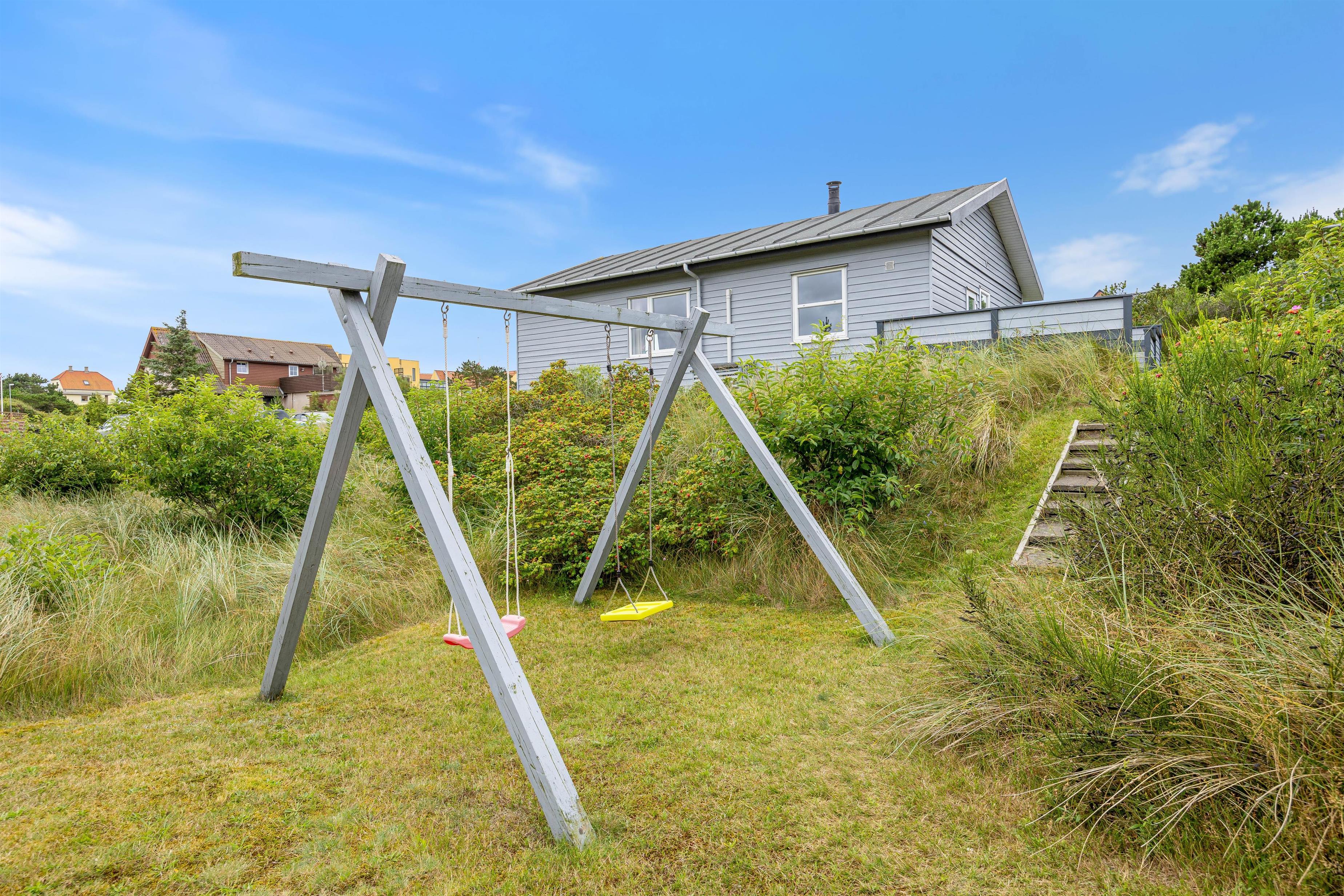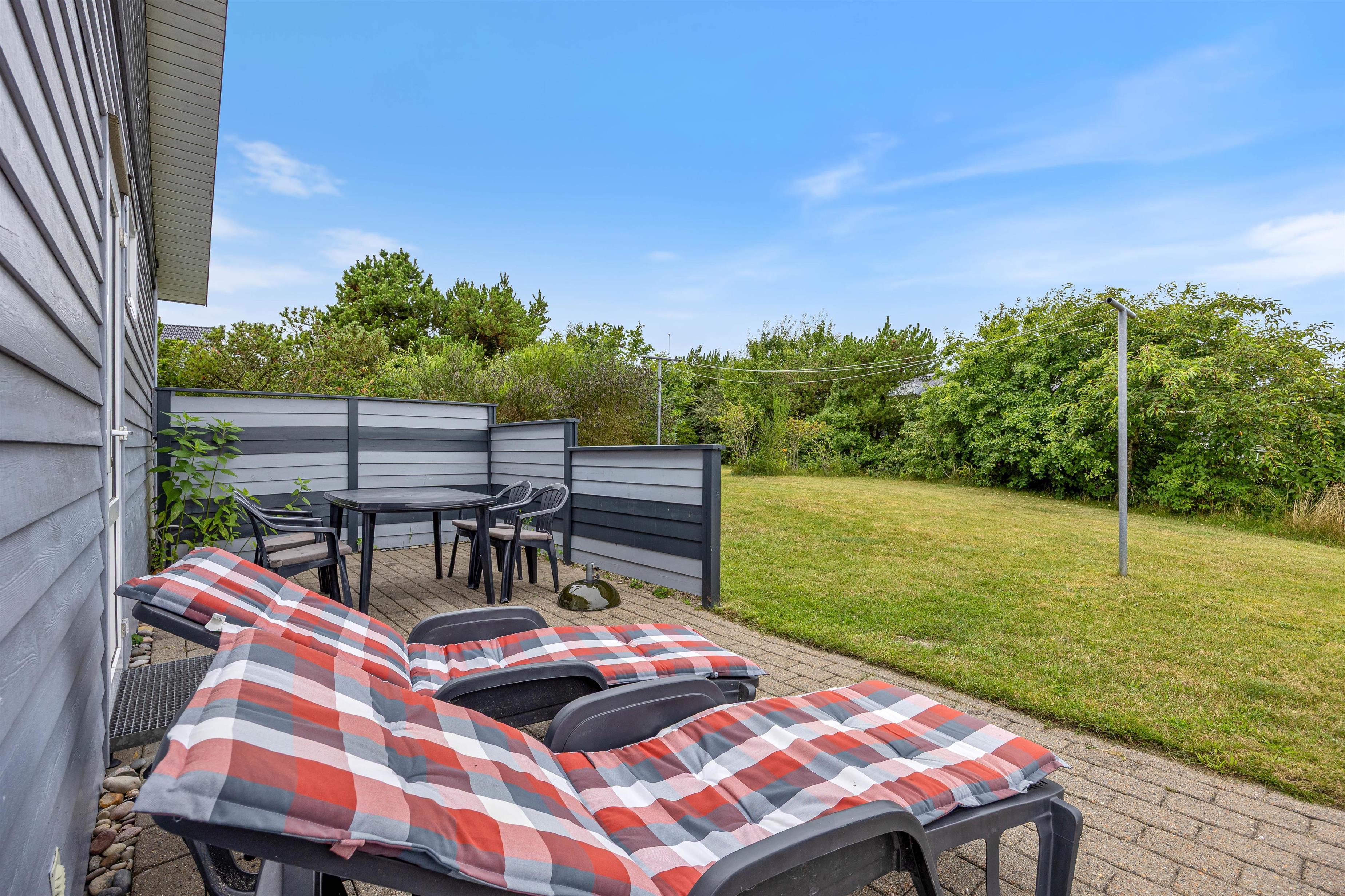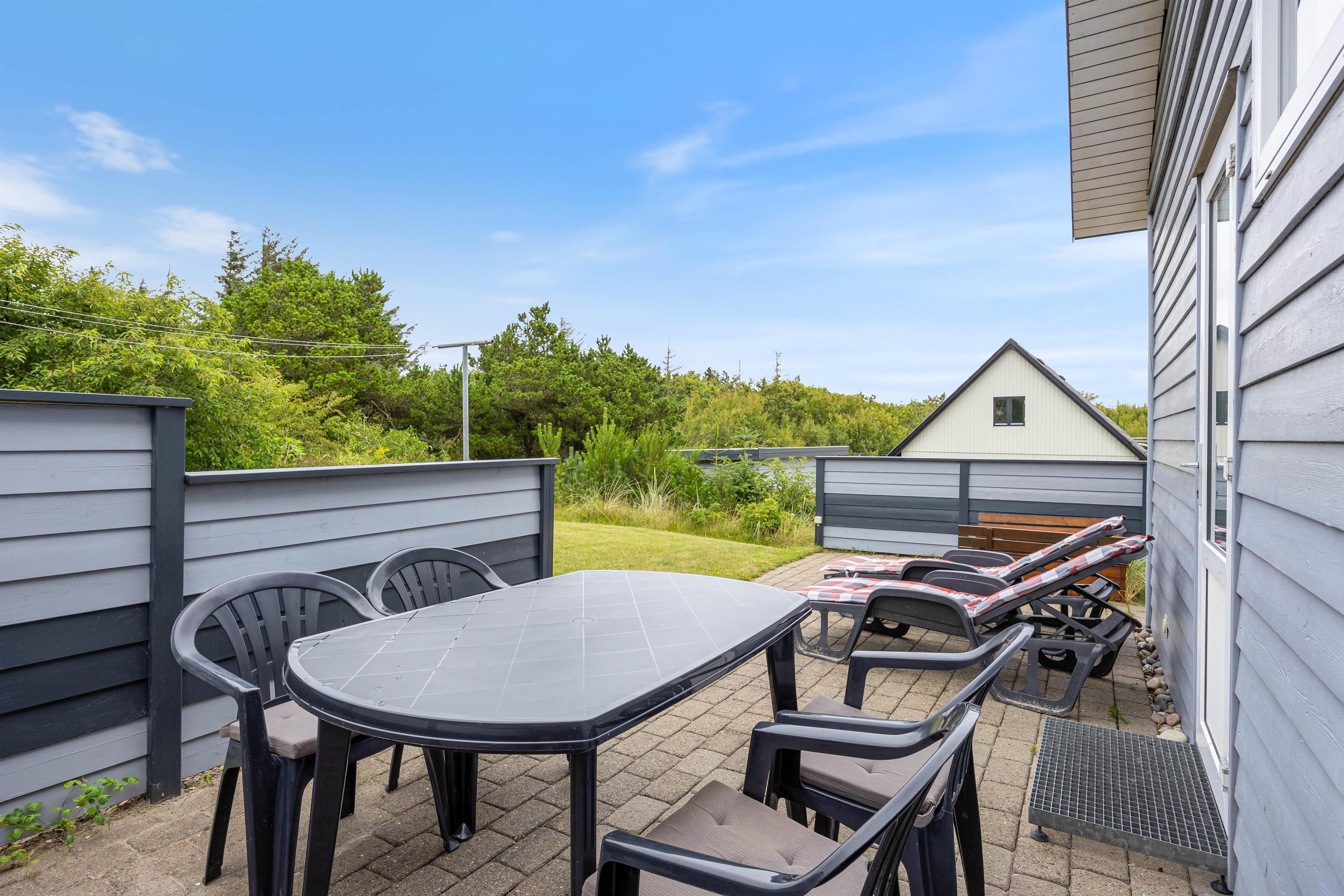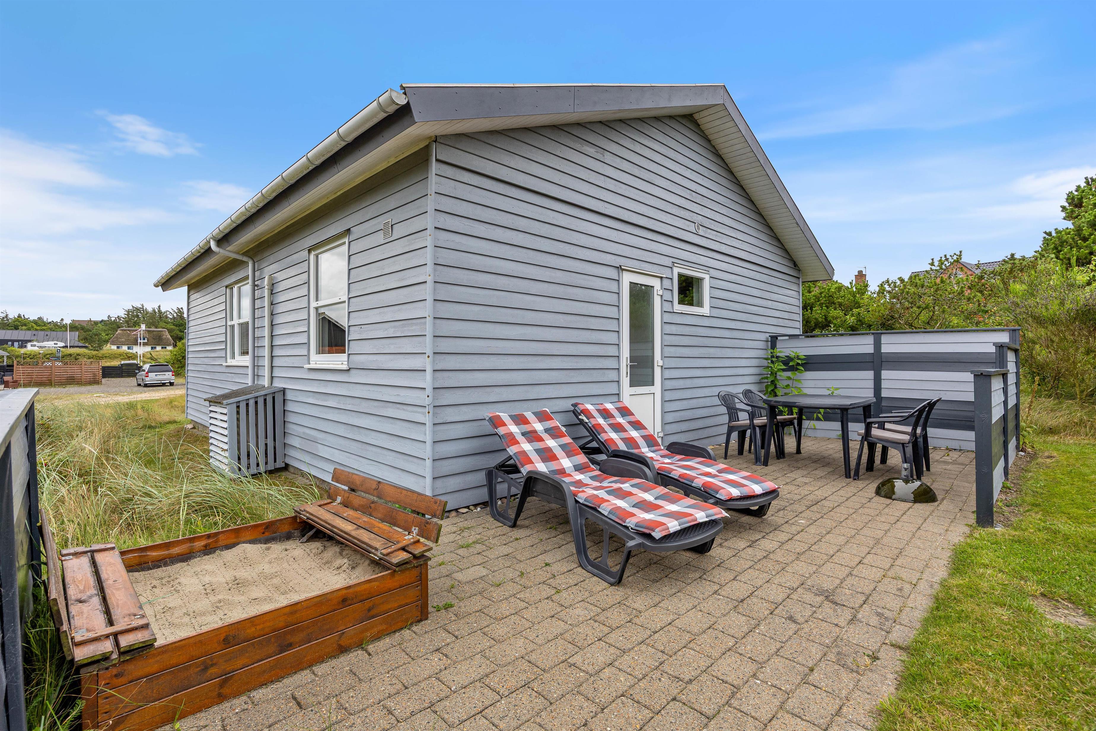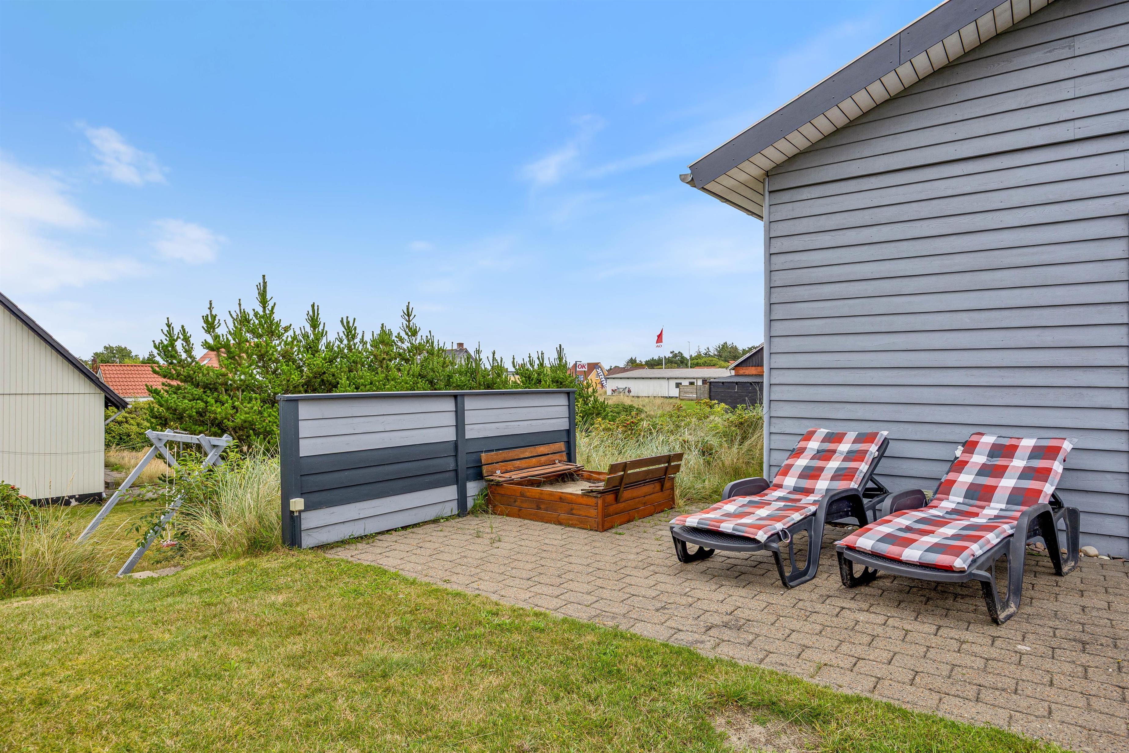 Der Außenbereich des Ferienhauses auf einem 2100 qm großen Naturgrundstück lädt zum Verweilen ein. Entspannt auf den Gartenmöbeln und Sonnenliegen und genießt die Sonne auf der teils überdachten und teils abgeschirmten Terrasse. Für Familien bietet der Garten einen Sandkasten und eine Schaukel, die für Spaß und Unterhaltung sorgen. Nutzt den Grill für leckere Mahlzeiten unter freiem Himmel und lasst die Umgebung auf euch wirken.