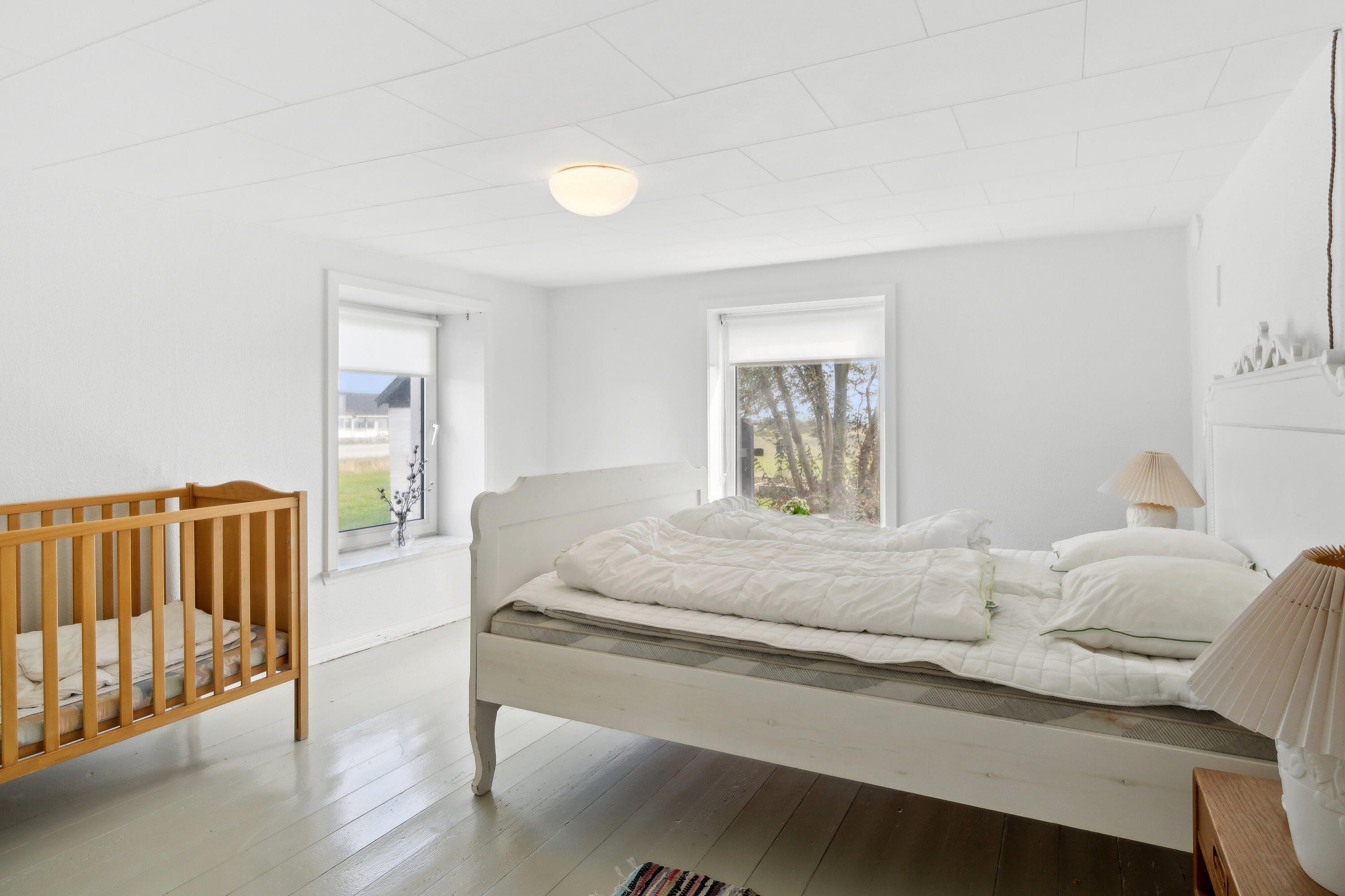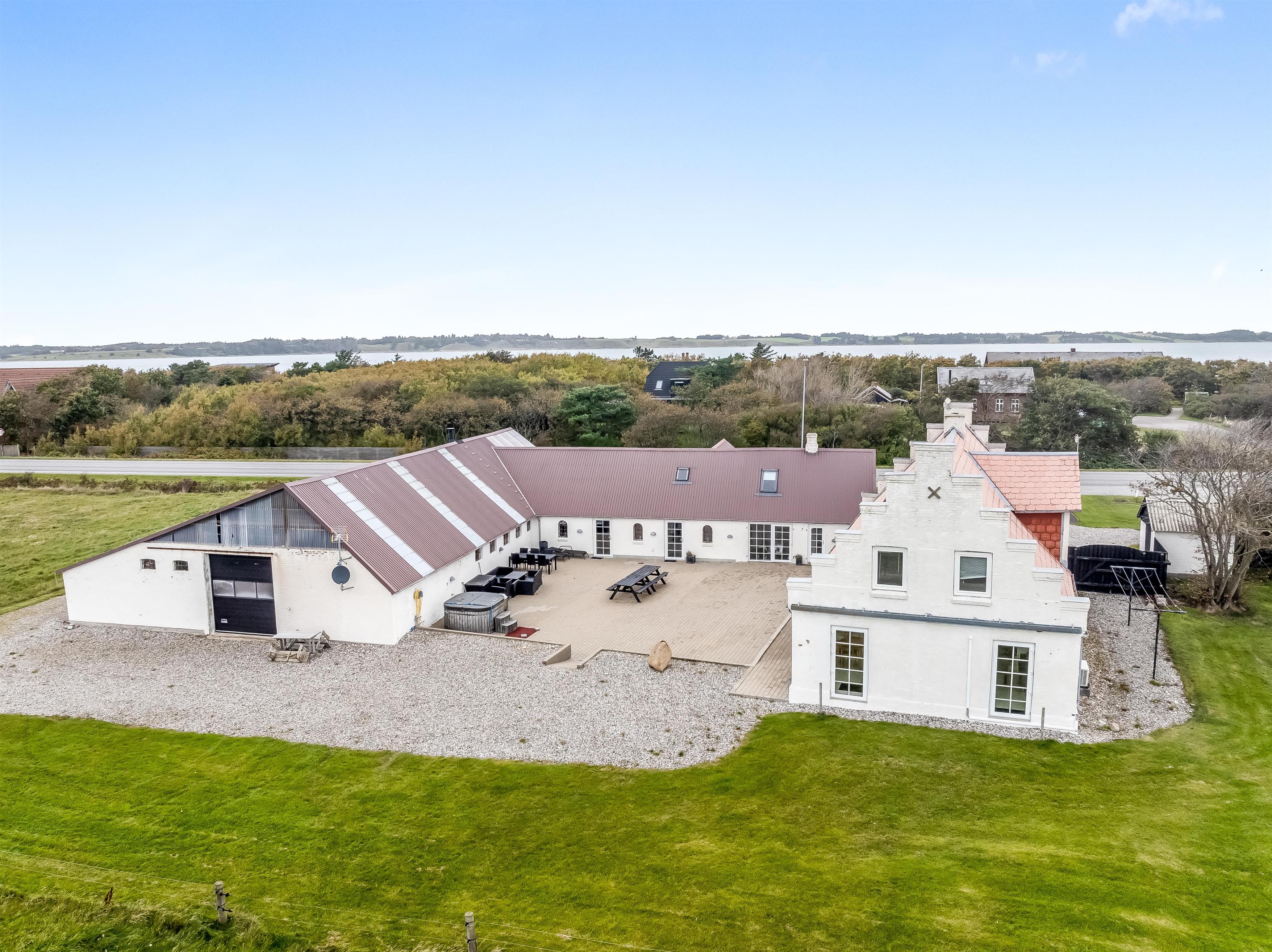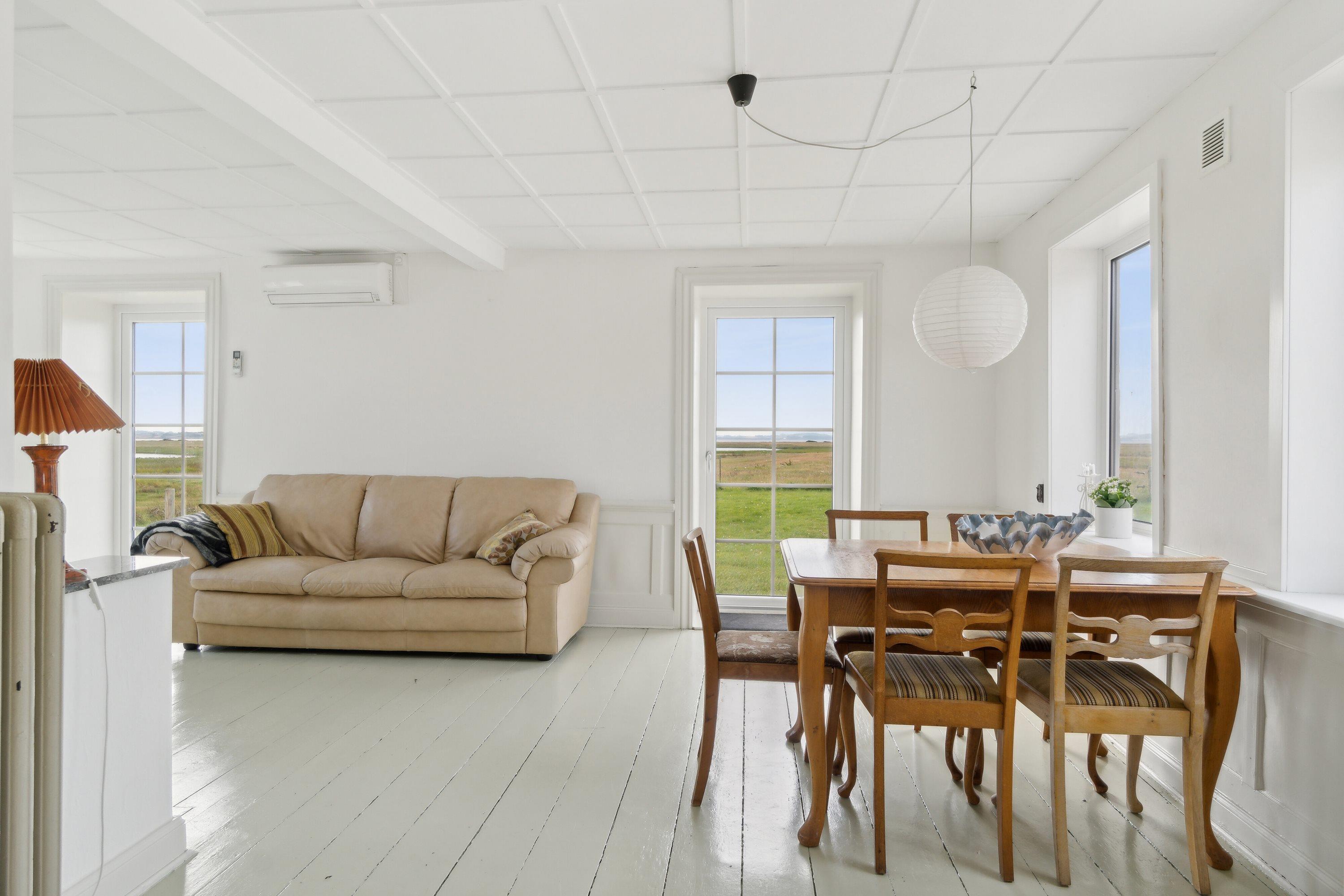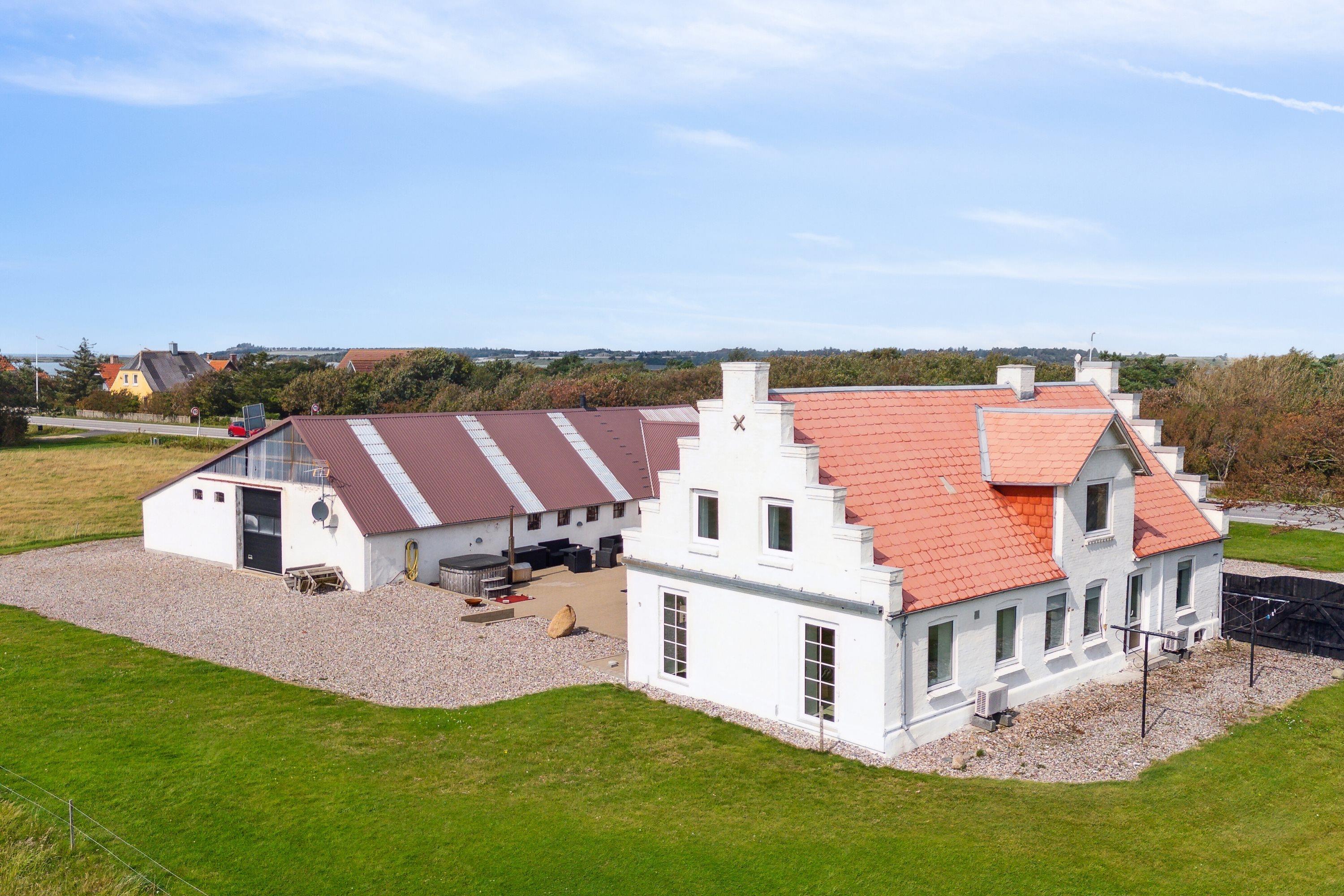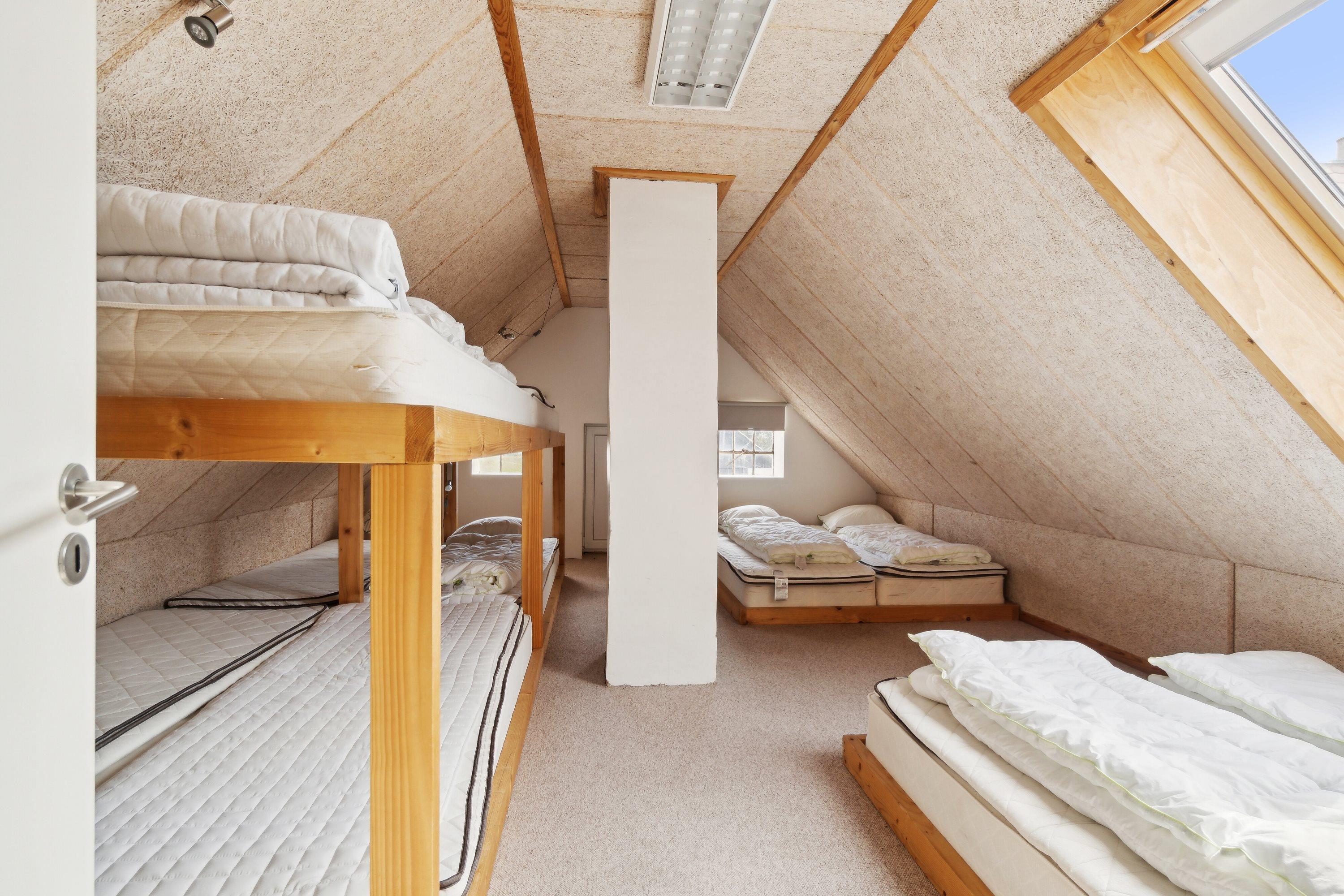 Indoors you will find 6 comfortable bedrooms, including three with double beds, one with a bunk bed, one with two single beds, as well as a family room with two double beds and four bunk beds, ensuring that there is room for everyone. There are two bathrooms, both equipped with a toilet and underfloor heating. There is a shower in one and a bathtub in the other, making it easy for everyone to get the necessary space and comfort. The house is also equipped with a heat pump and a wood-burning stove, so you can stay warm, regardless of the season.