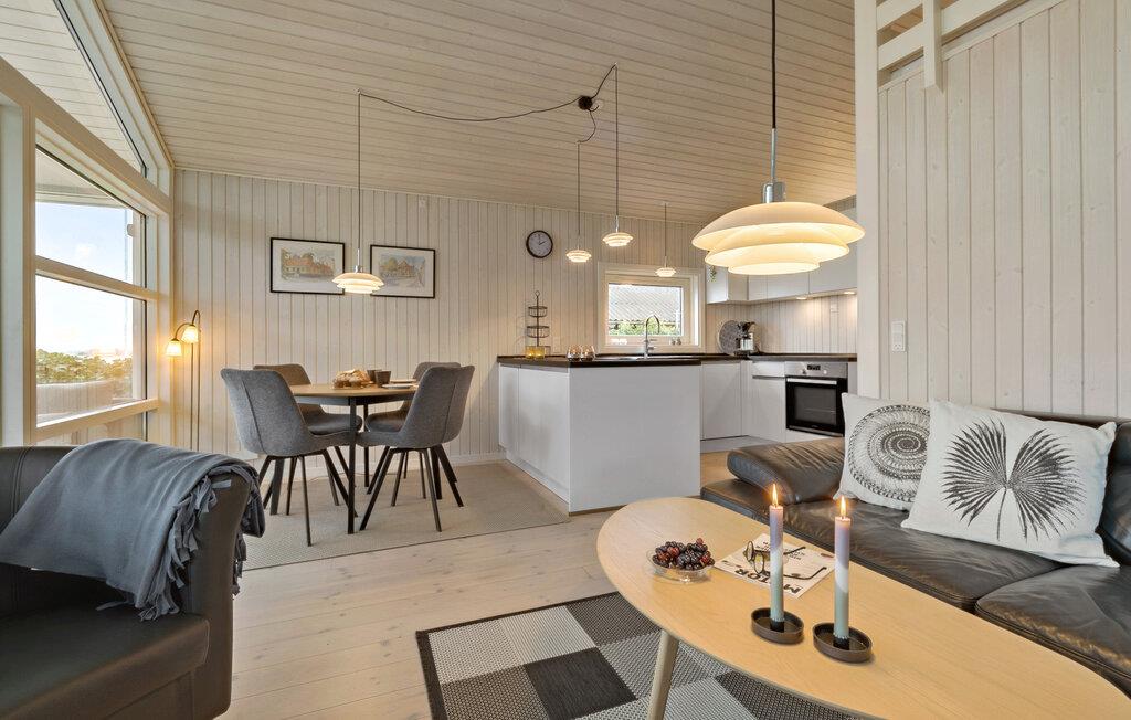 Licht en mooi vakantiehuis met serre op een unieke locatie aan het strand van het Kertemindefjord.