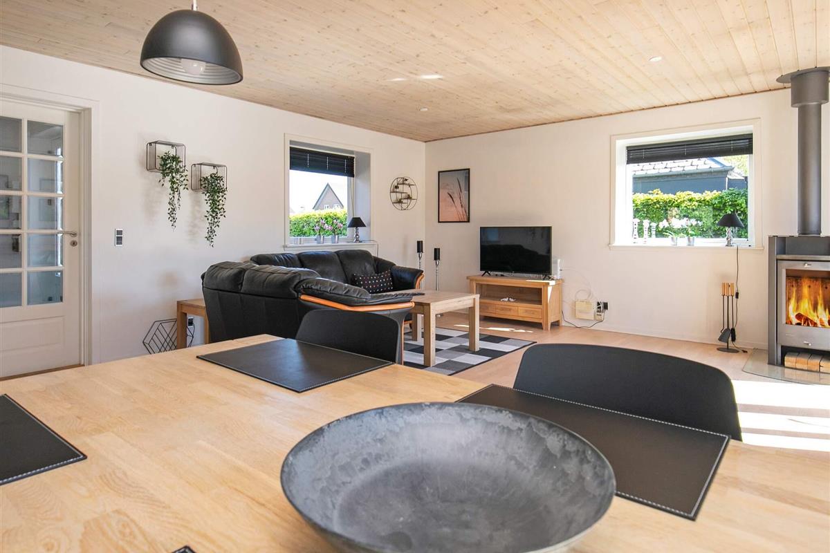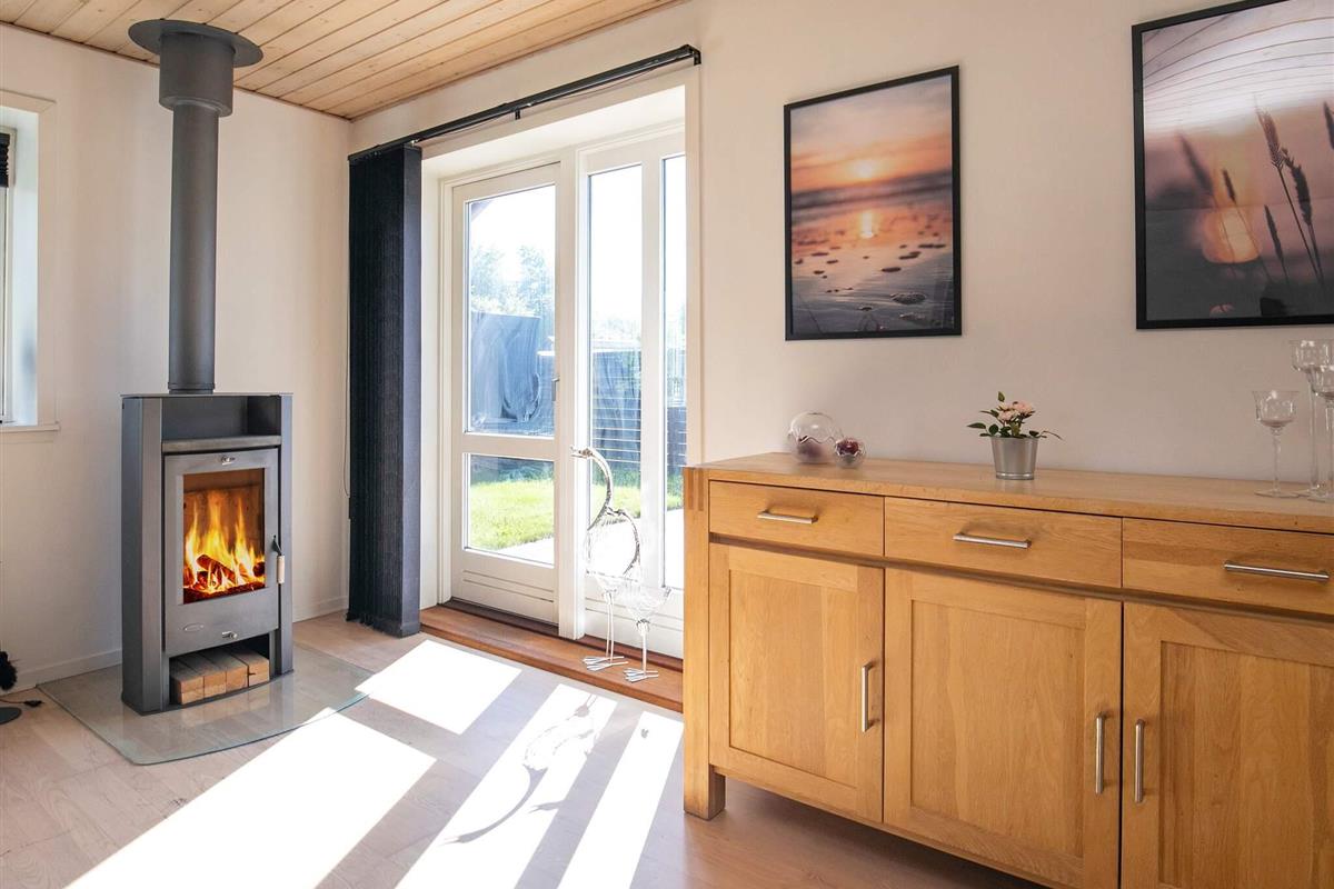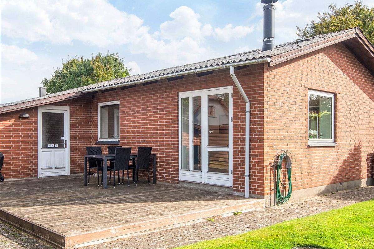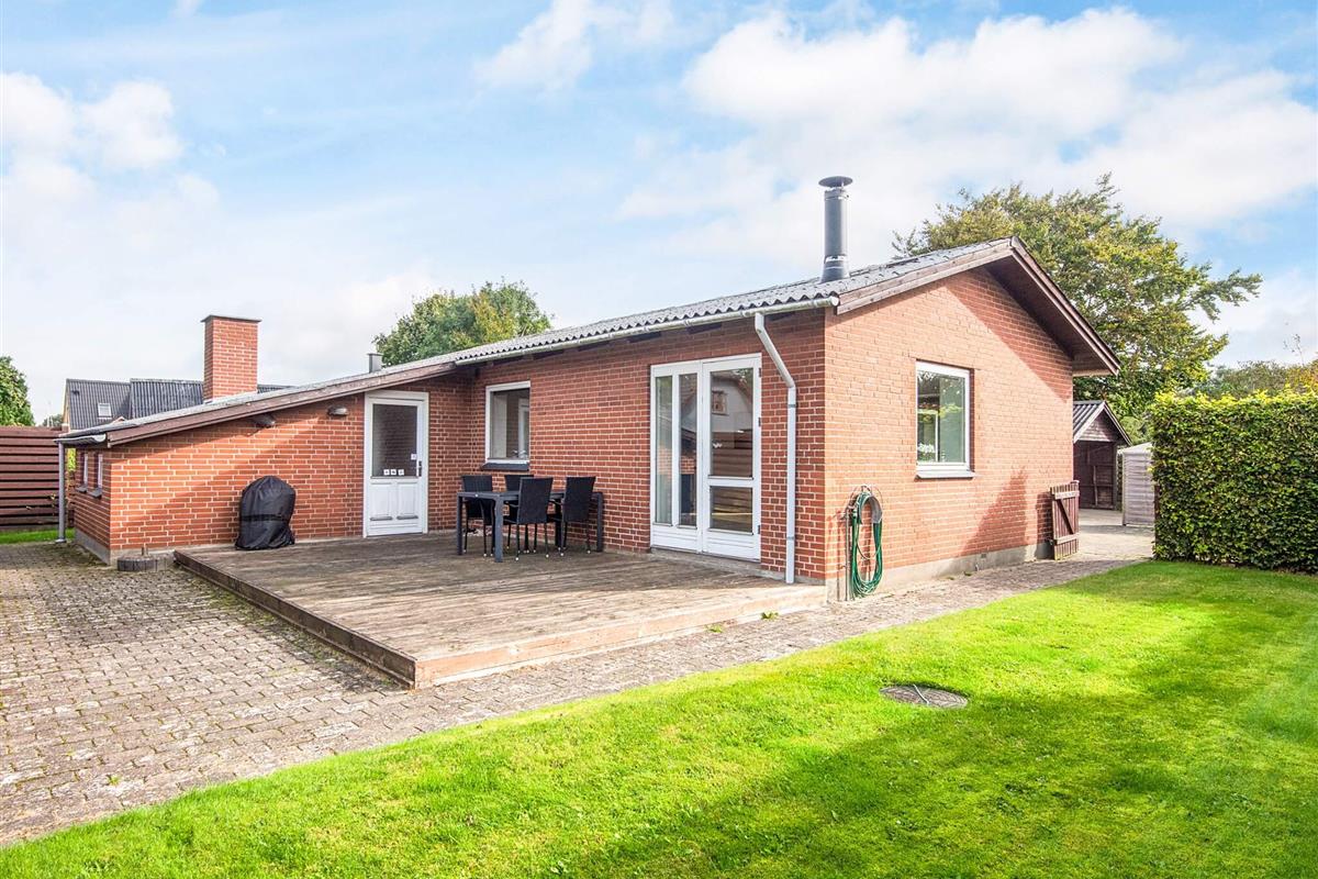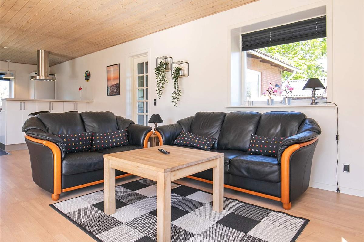 Ferienhaus bei Oksbøl, auf einem teils abgeschirmten Rasengrundstück mit großer Holzterrasse mit Grill und Gartenmöbeln. Den zentralen Mittelpunkt des Hauses bildet der offene Küchen-/Wohnbereich für das Familienleben. Hier gibt es auch einen Holzofen und einen Zugang zur Westterrasse. Vom Eingang des Hauses hat man Zutritt zu zwei Schlafzimmern und über einen Durchgang gelangen Sie von dort weiter zum Badezimmer des Hauses.
