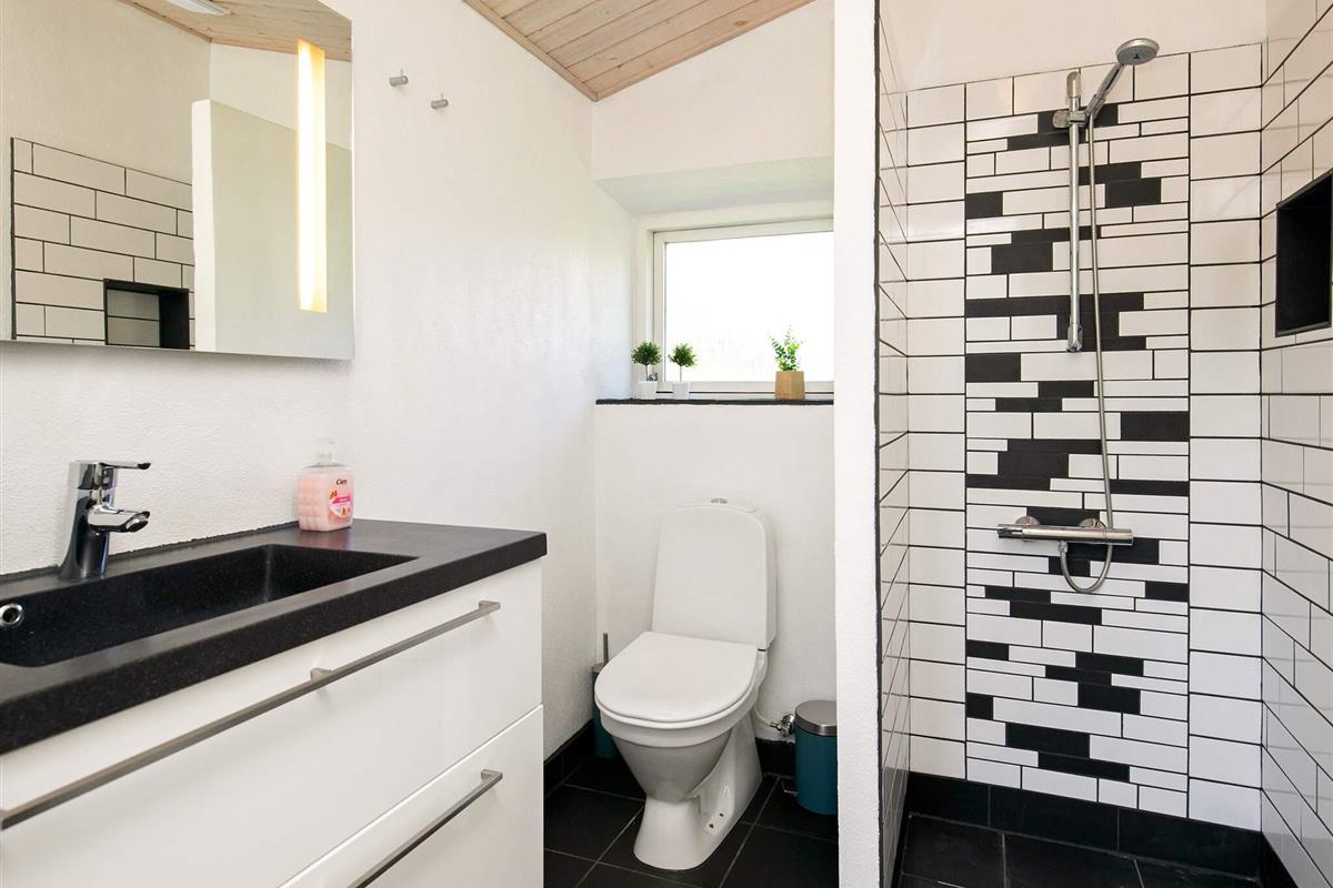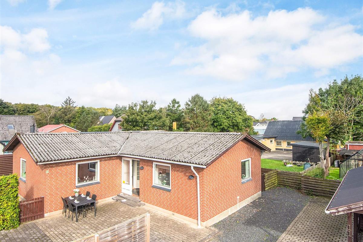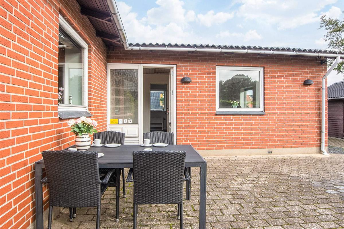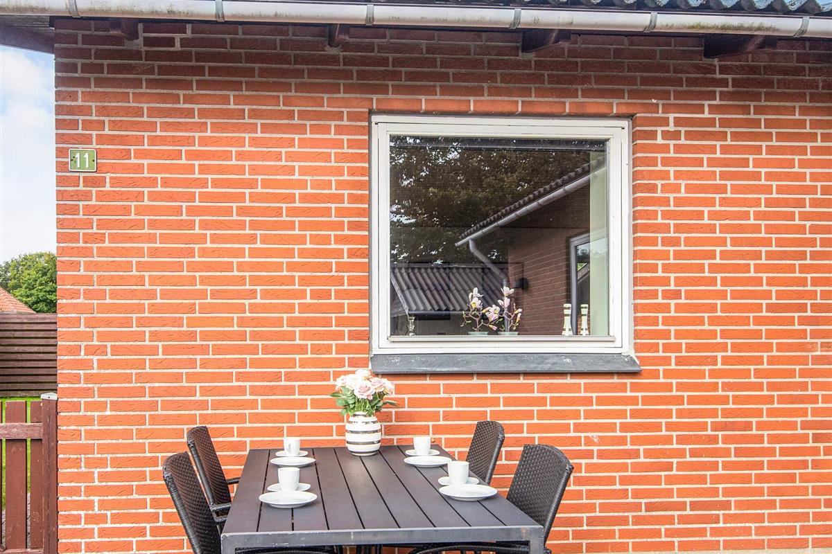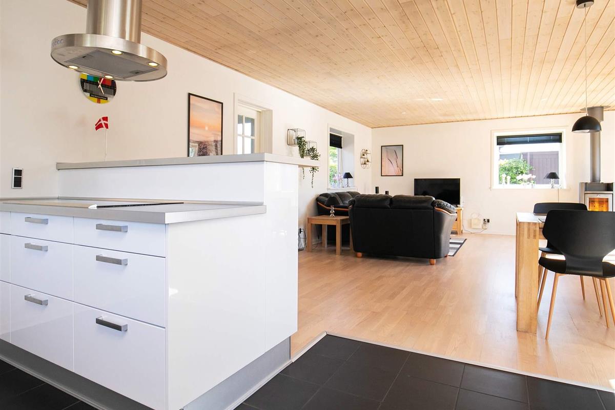 Ferienhaus bei Oksbøl, auf einem teils abgeschirmten Rasengrundstück mit großer Holzterrasse mit Grill und Gartenmöbeln. Den zentralen Mittelpunkt des Hauses bildet der offene Küchen-/Wohnbereich für das Familienleben. Hier gibt es auch einen Holzofen und einen Zugang zur Westterrasse. Vom Eingang des Hauses hat man Zutritt zu zwei Schlafzimmern und über einen Durchgang gelangen Sie von dort weiter zum Badezimmer des Hauses.