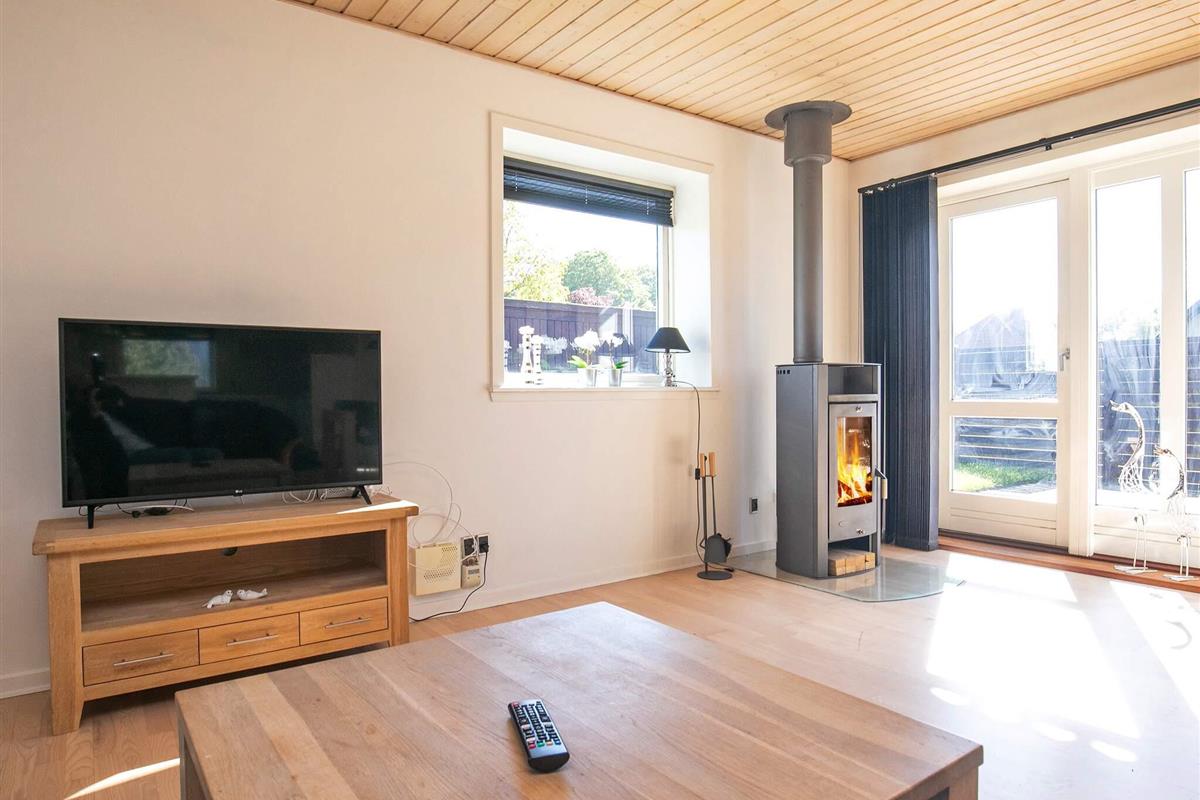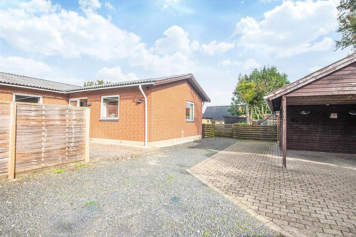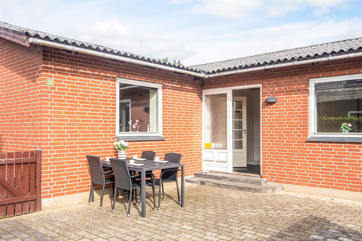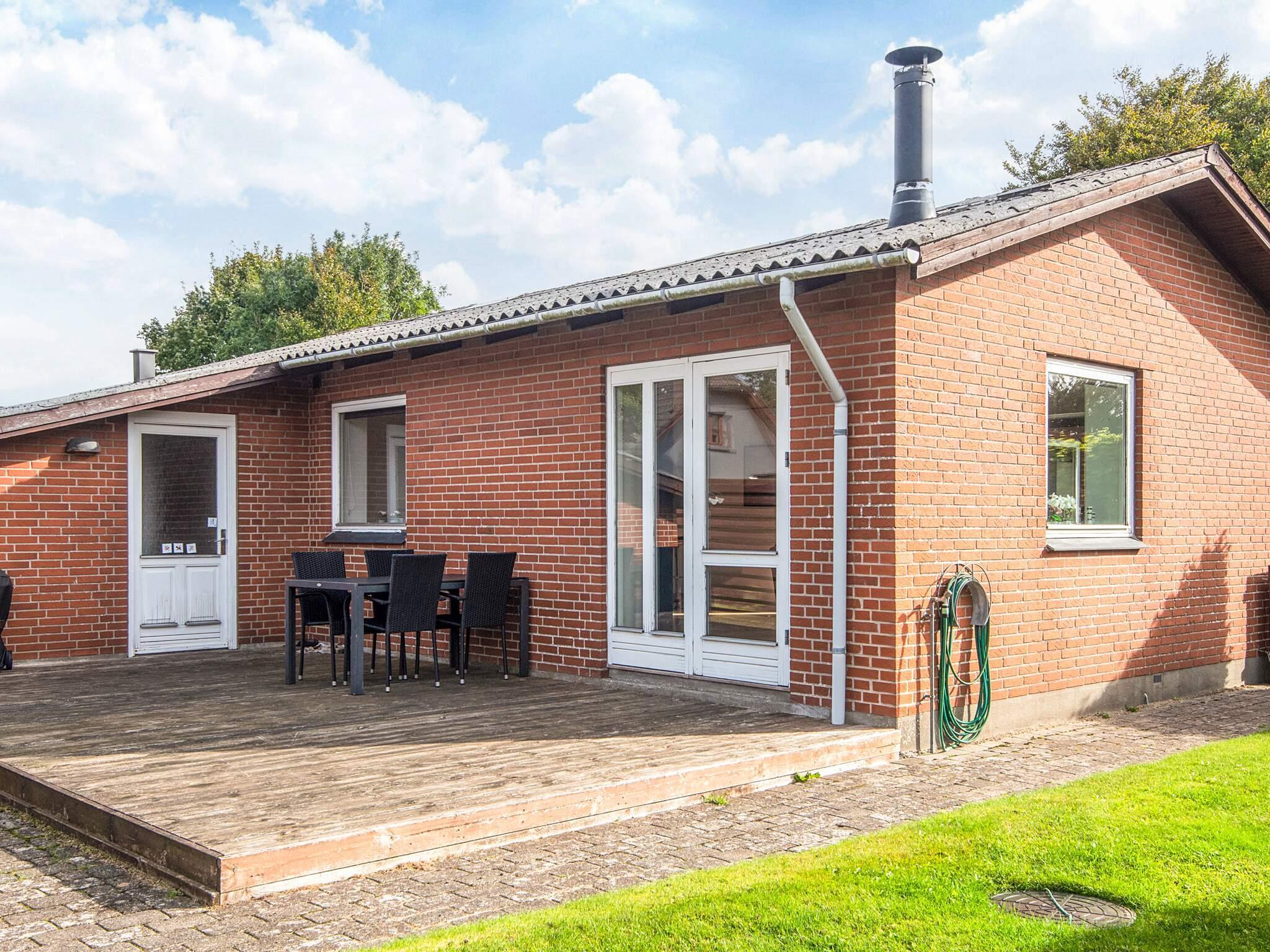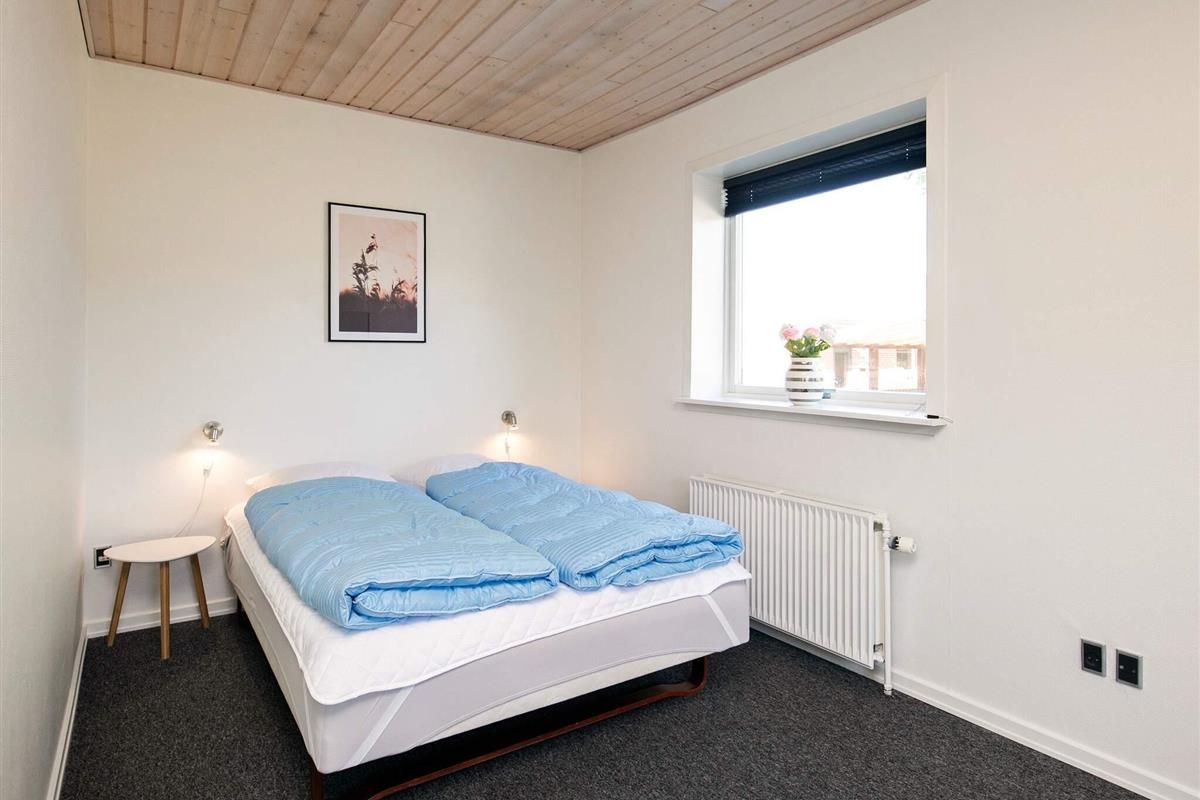 Ferienhaus bei Oksbøl, auf einem teils abgeschirmten Rasengrundstück mit großer Holzterrasse mit Grill und Gartenmöbeln. Den zentralen Mittelpunkt des Hauses bildet der offene Küchen-/Wohnbereich für das Familienleben. Hier gibt es auch einen Holzofen und einen Zugang zur Westterrasse. Vom Eingang des Hauses hat man Zutritt zu zwei Schlafzimmern und über einen Durchgang gelangen Sie von dort weiter zum Badezimmer des Hauses.
