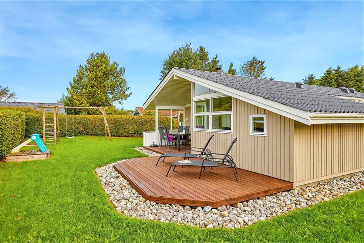 Zum Ferienhaus gehören drei möblierte Terrassen, von denen zwei überdacht sind. Für entspannte Stunden in der Sonne stehen drei Gartenliegen bereit. Der Garten ist komplett von einer gut abschirmenden Hecke umgeben und bietet viel Platz zum Spielen.
