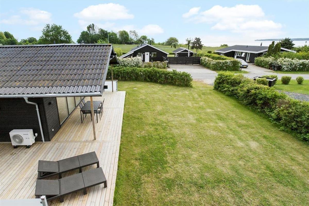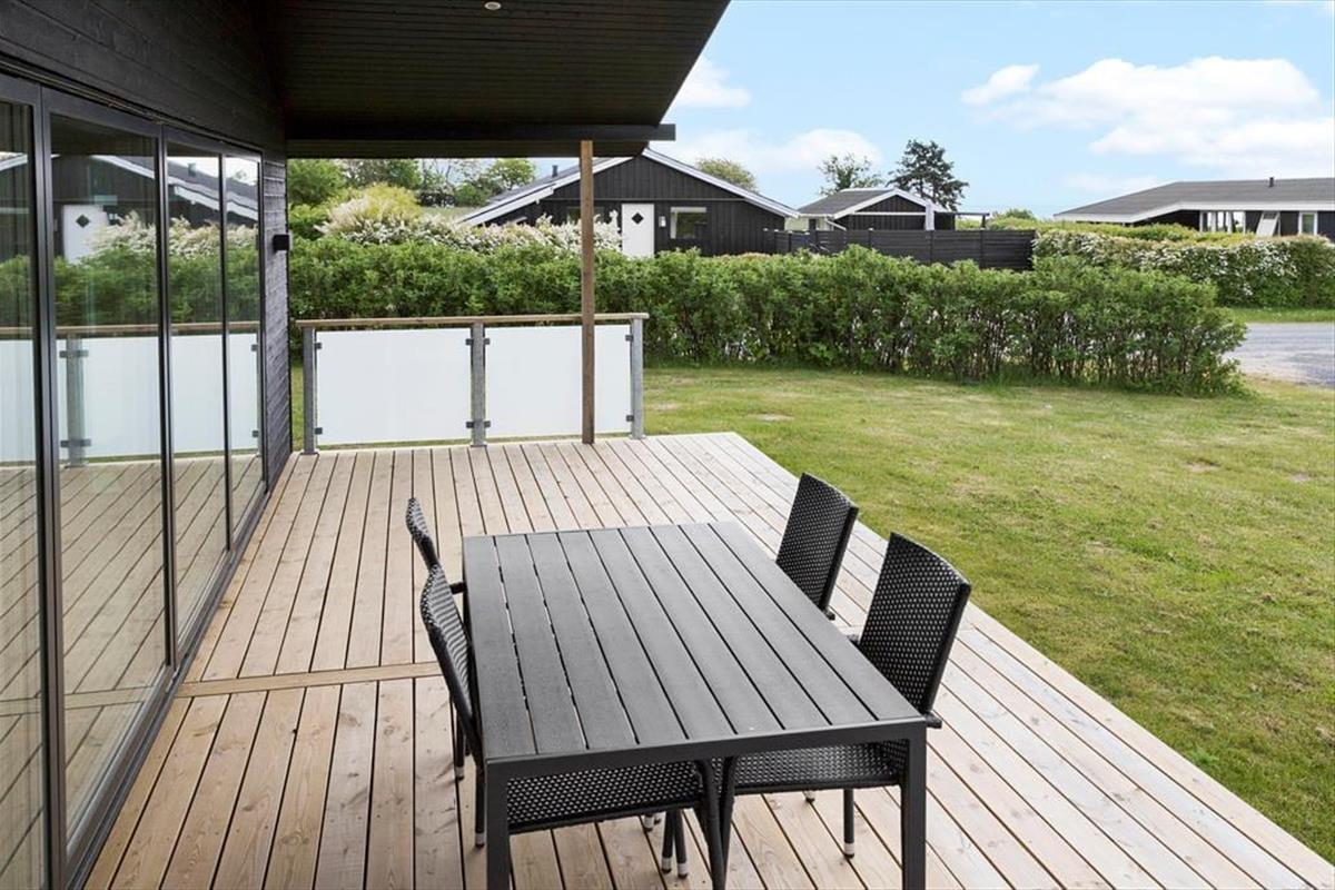 Vom Wohnraum aus gelangen Sie hinaus auf eine große, teilweise überdachte Holzterrasse mit Meerblick. Die Terrassen werden bei Sommerwetter schnell zu Ihrem bevorzugten Aufenthaltsort avancieren. Zahlreiche gute Gartenmöbel und ein großer Grill laden zu entspannten Runden unter freiem Himmel ein. Der Garten bietet Platz zum Spielen und Umhertollen. Das Haus liegt nah an einem Spielplatz/Bolzplatz.