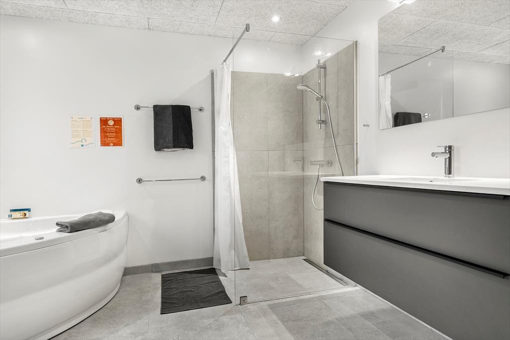 Das Badezimmer besticht mit einem Whirlpool und einer großen Duschnische. Eine Waschmaschine und ein Wäschetrockner sind im Haus vorhanden.