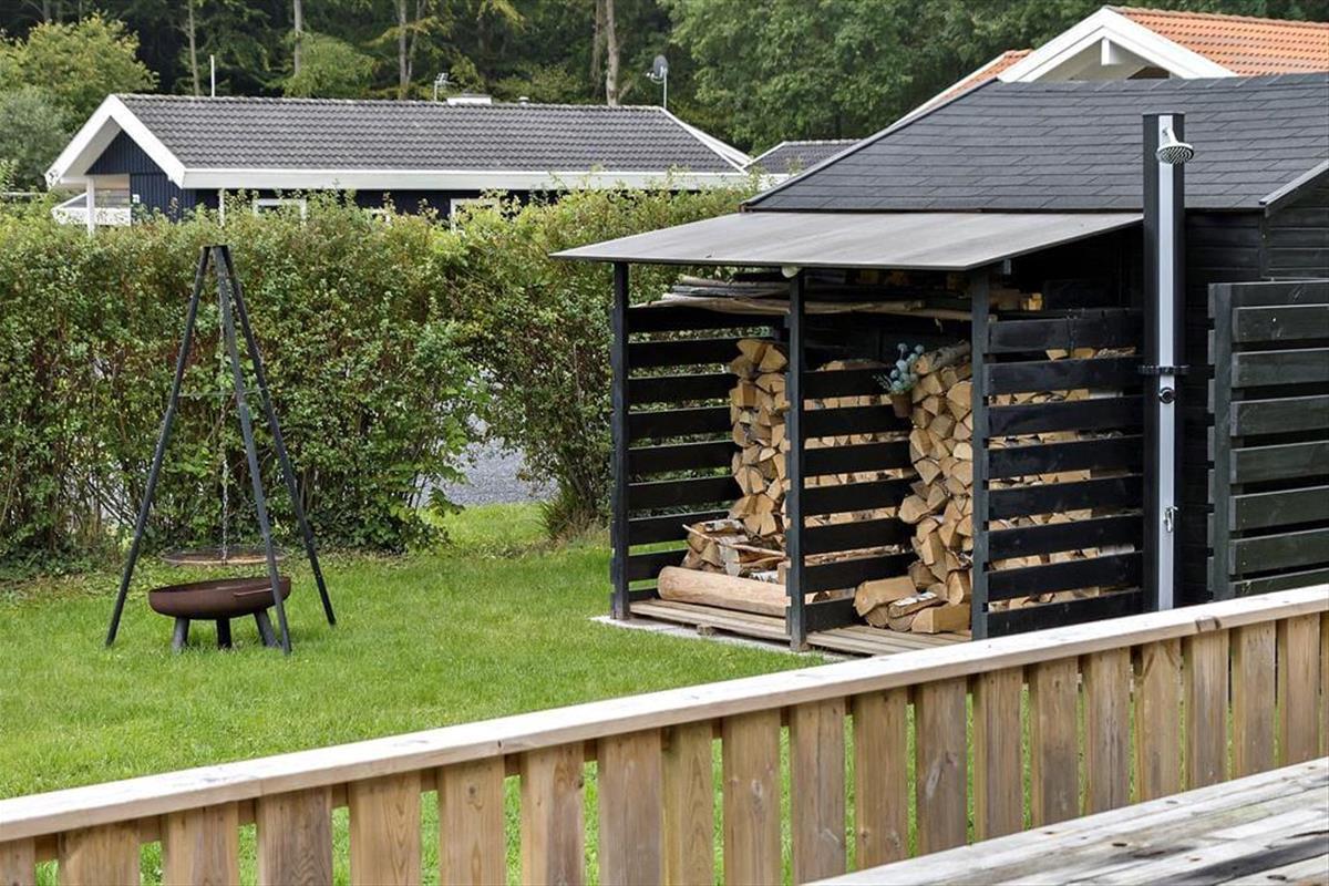 Vom kombinierten Küchen-, Wohn- und Essbereich gelangen Sie hinaus auf eine große Holzterrasse, die das halbe Ferienhaus umgibt. Auf dieser Terrasse verleben Sie entspannte Stunden in der Sonne und gesellige Grillabende. Der überdachte Terrassenbereich bietet sich gut als Aufenthaltsplatz für die langen, hellen Abendstunden an. Der große Garten animiert zum Spielen und Umhertollen. Nach einem Bad in der Ostsee spült Ihnen die Außendusche den Sand und das Salz des Meeres von der Haut.
