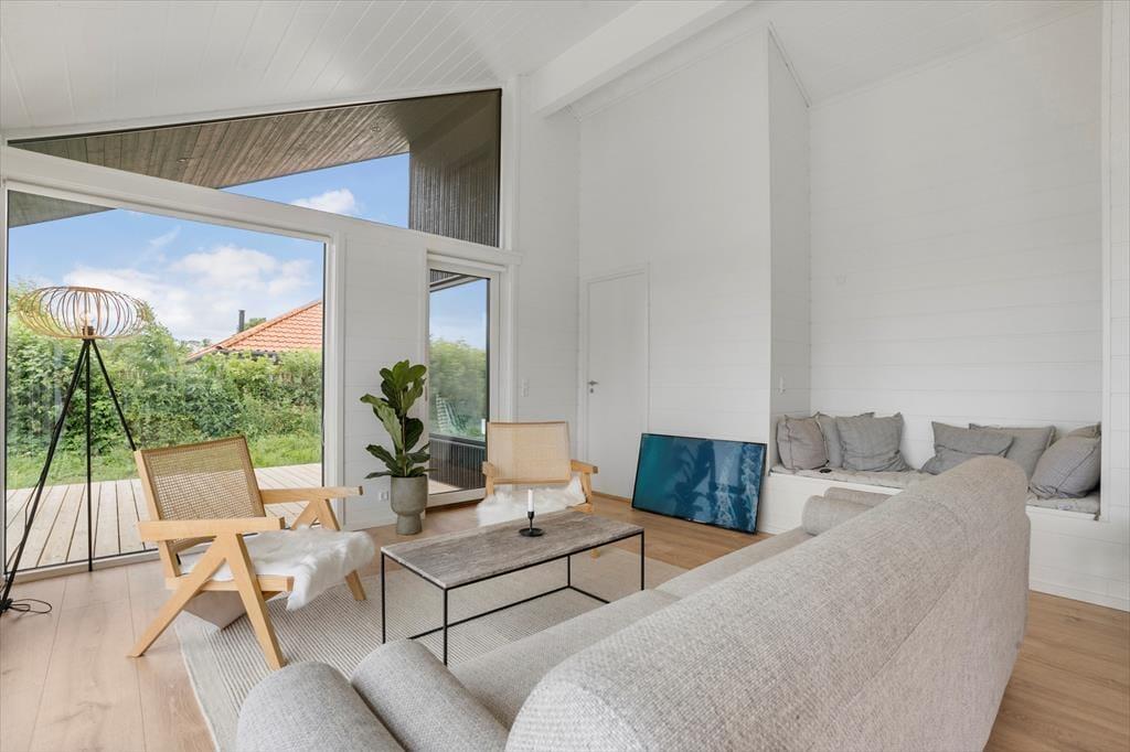 I sofahjørnet mod det store østvendte vinduesparti er der rigtig hyggelig sommerhusstemning. Det er helt perfekt at sidde her med en bog eller tænde for en god film. Her kan I virkelig slappe af, og nyde at være på ferie.