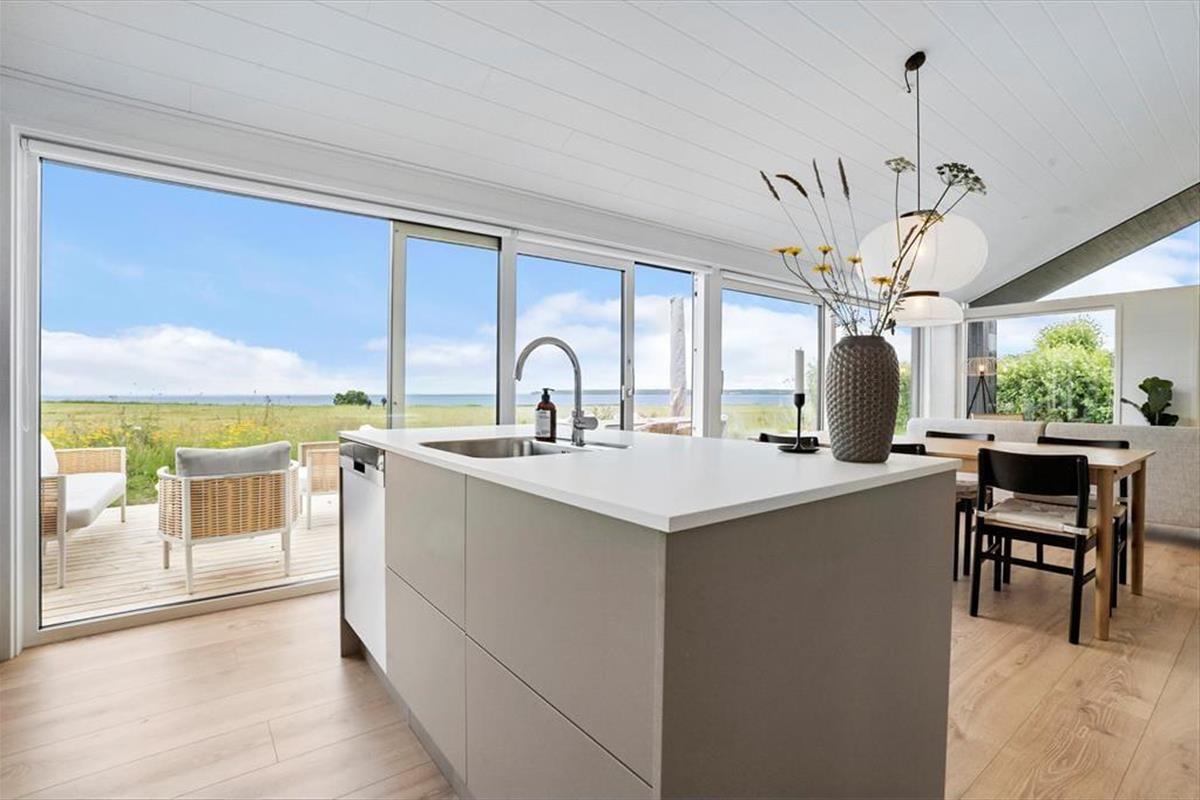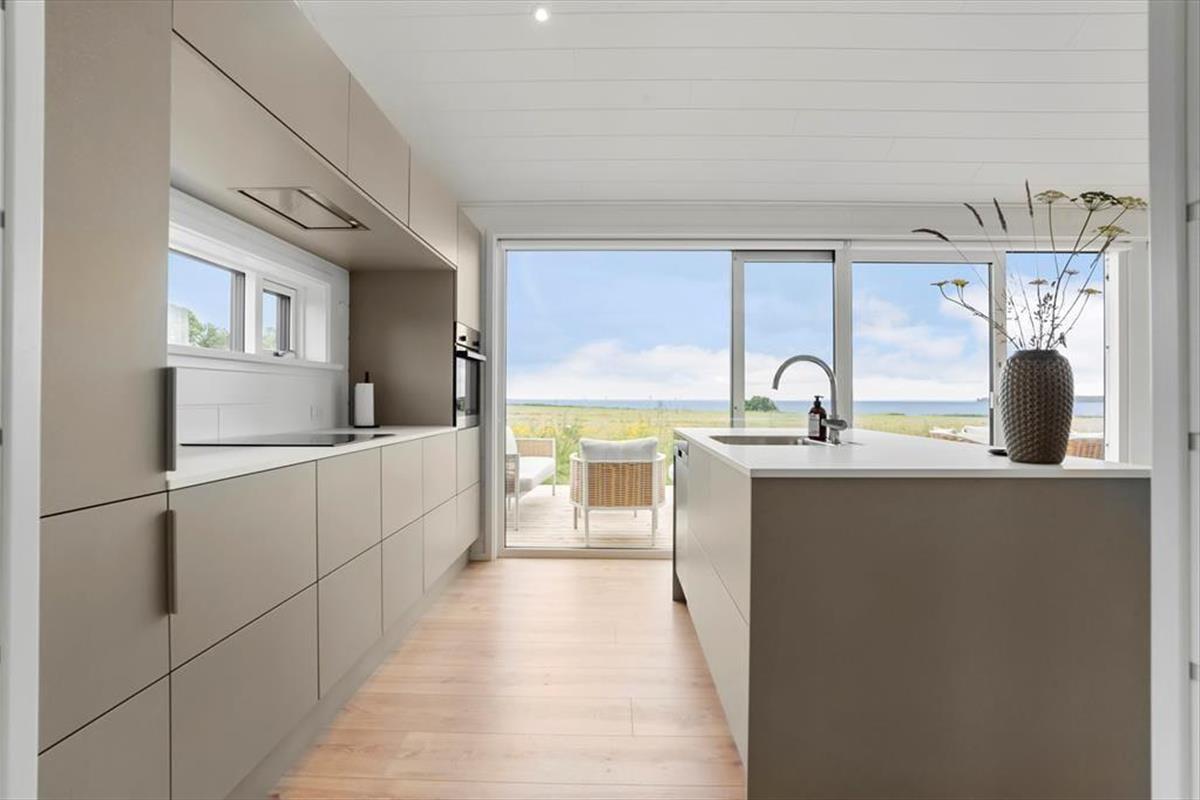 Stuen og køkkenet er husets samlingsrum, og det åbne køkken gør det muligt at forberede aftensmaden, mens du stadig kan tale om dagens oplevelser med dem, der sidder i stuen. Køkkenet er et funktionelt sommerhuskøkken, hvor du kan kigge ud på havet og har alle nødvendige køkkenfaciliteter ved hånden. Spisebordet er i forlængelse af køkkenet, og her er der plads til, at I alle kan spise sammen eller spille et spil. Ved siden af spisebordet og stuen er en havedør ud til en østvendt overdækket terrasse, så det er også dejligt at tage måltiderne med udenfor og nyde udsigten til havet og natur.