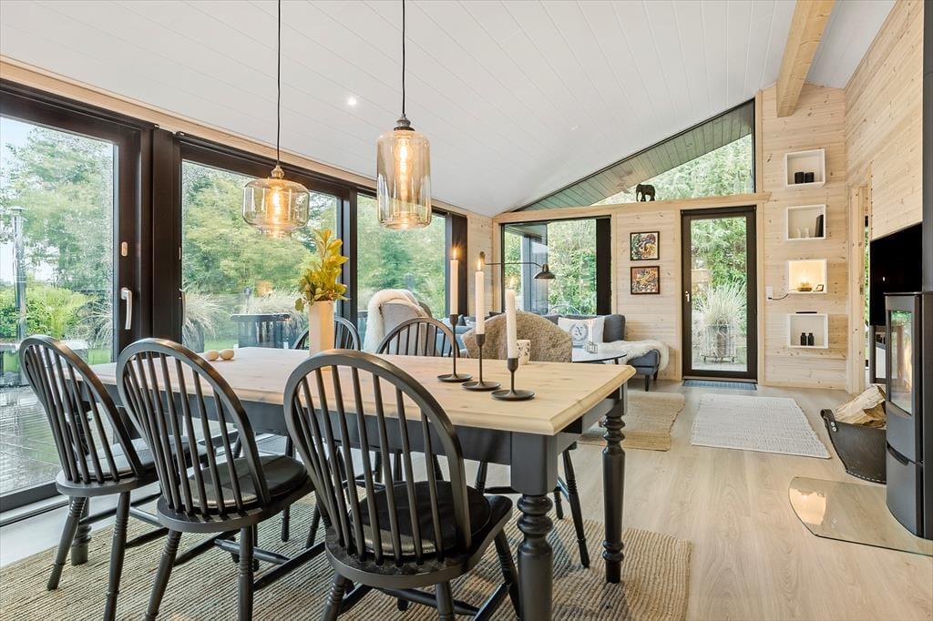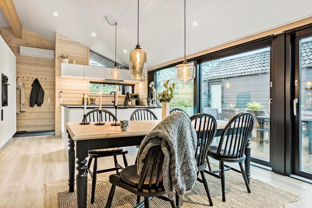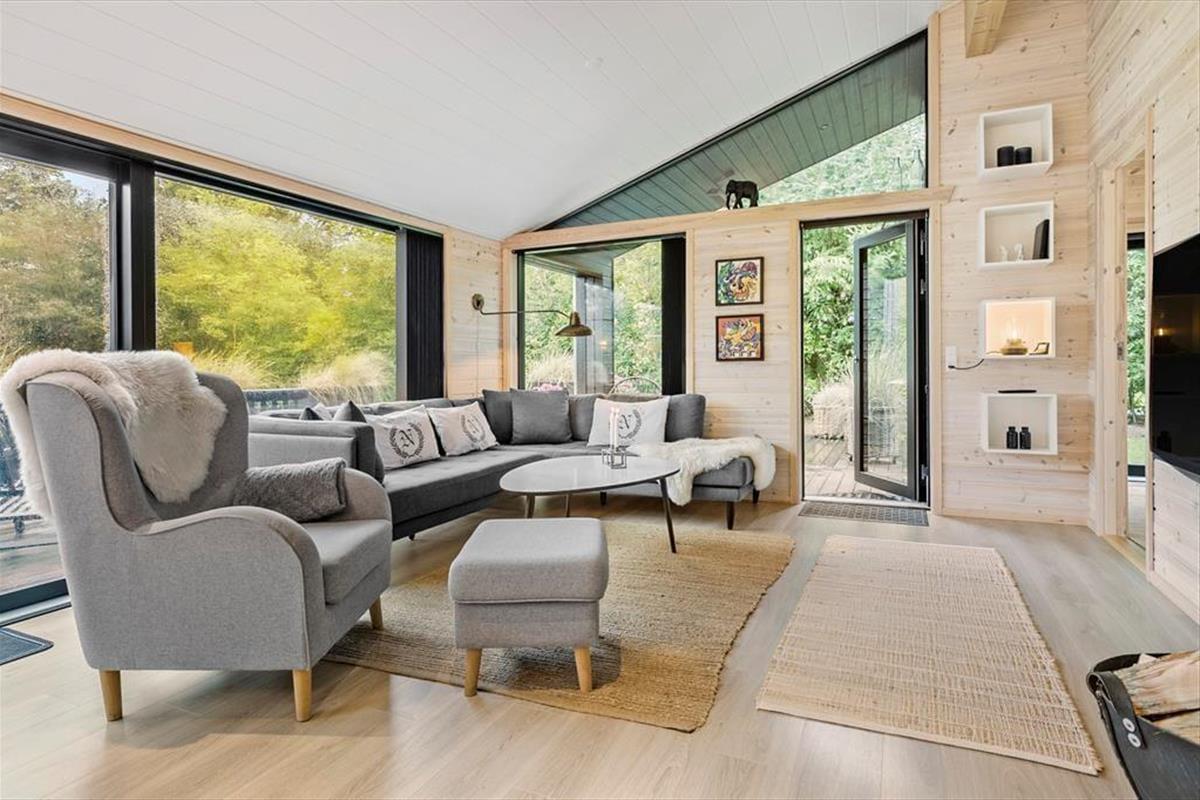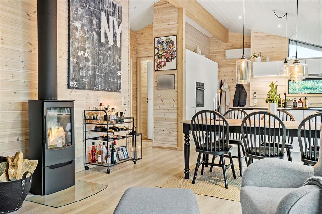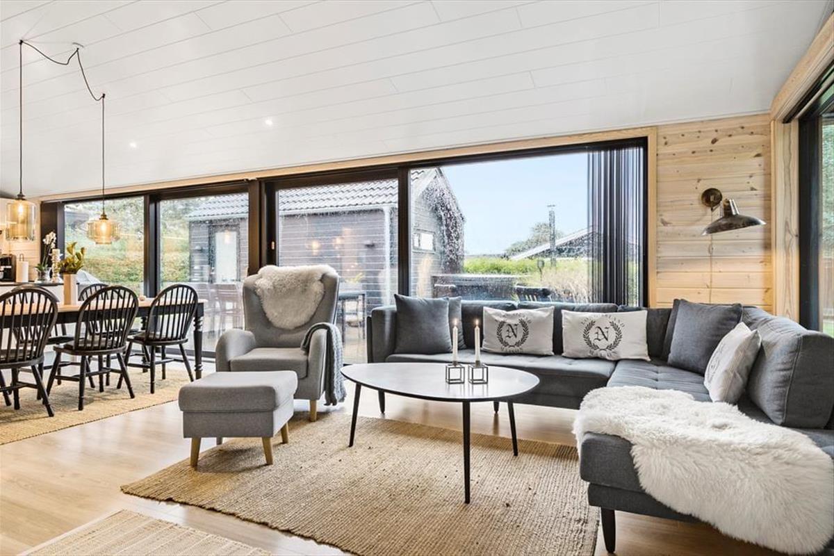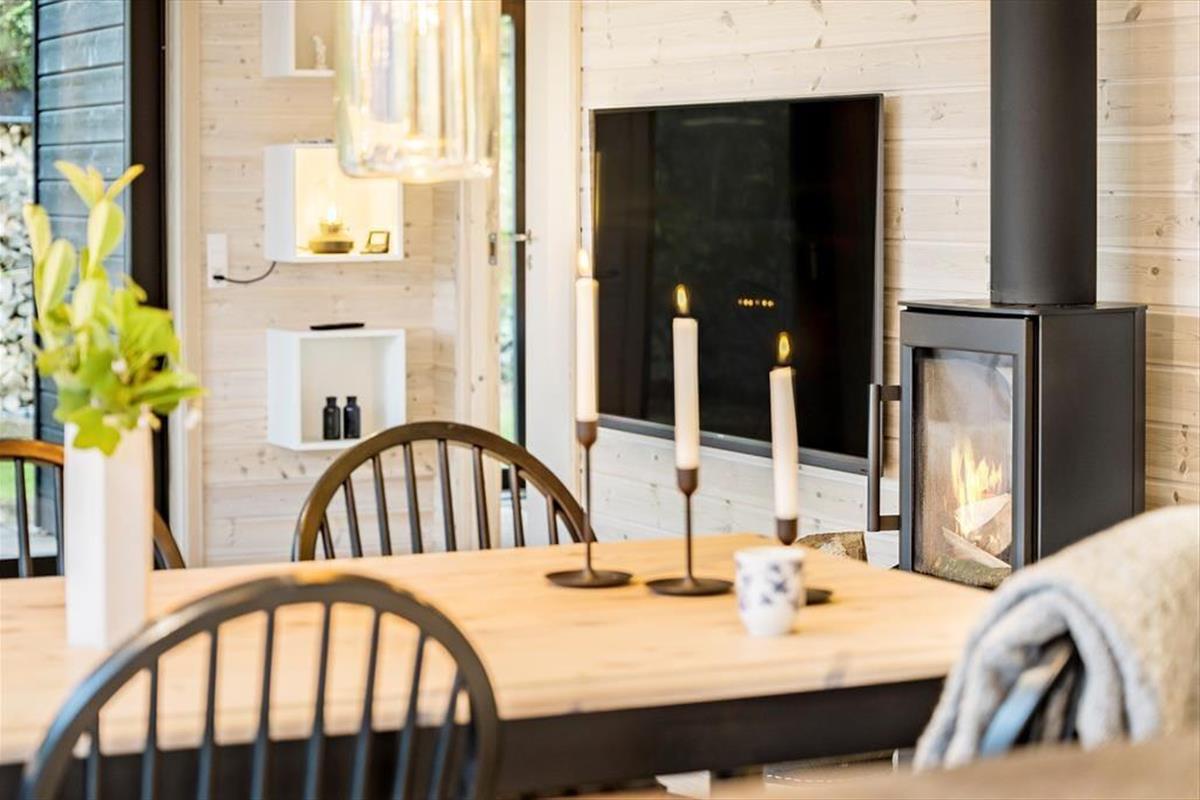 Direkt neben der Küche befindet sich das Wohnzimmer, das viel Platz für alle bietet. Hier kann die Familie die Mahlzeiten am Esstisch genießen und sich anschließend auf dem Sofa vor dem Fernseher entspannen. Es gibt dänische, deutsche, schwedische und norwegische Kanäle. Ihr könnt auch eure eigenen TV- und Streamingdienste über die TV-Apps wie z.B. Netflix nutzen. Außerdem gibt es kostenloses Internet im Ferienhaus.