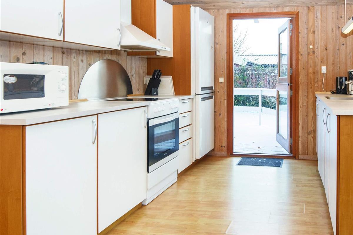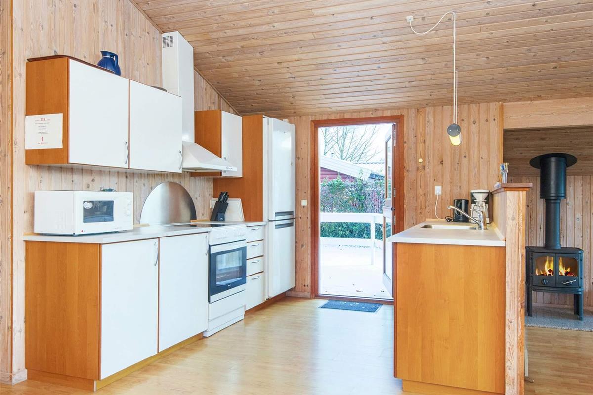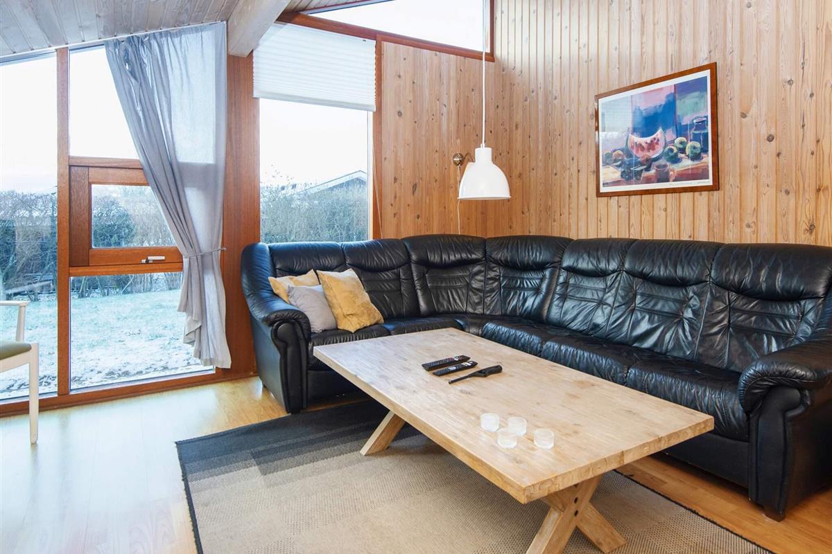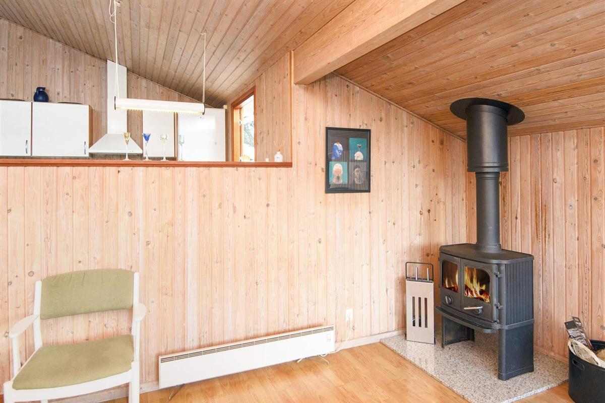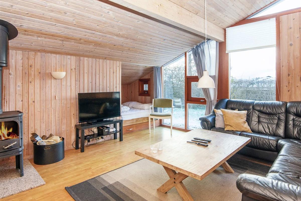 Ferienhaus nahe Wald und Strand. Es gibt hohe Decken und ein Bad mit Sauna und Whirlpool. Im Küchen-Wohnbereich kann sich die ganze Familie zu den Innenaktivitäten versammeln. Der Wohnraum liegt etwas tiefer und hat einen Holzofen für gemütliche Wärme. Drei Schlafzimmer und ein Alkoven bieten Schlafplatz. Es gibt eine große überdachte und eine offene Terrasse sowie eine große Rasenfläche, die zu Spiel und Spaß einlädt. Ganz in der Nähe des Hauses liegt ein Spielplatz. Für den Grill ist kein Gas bzw. keine Grillkohle vorhanden.