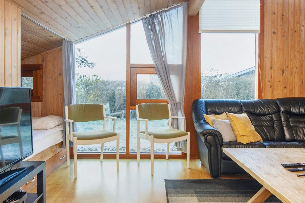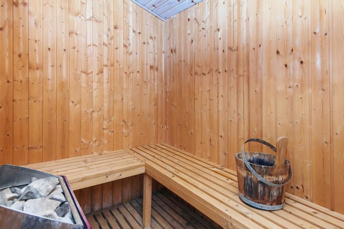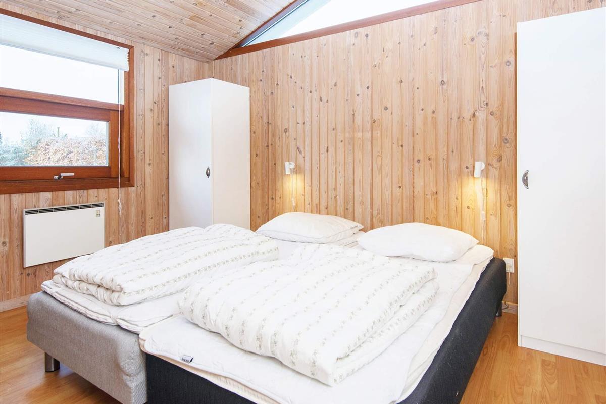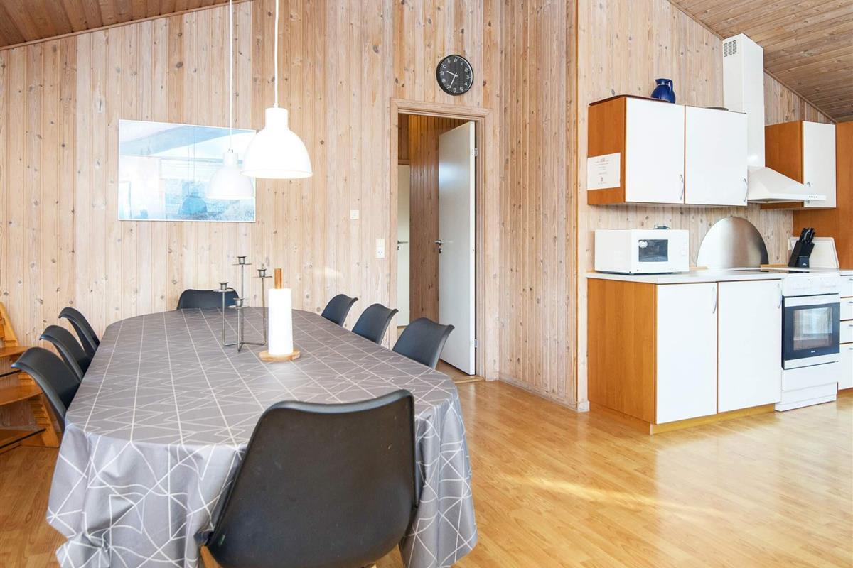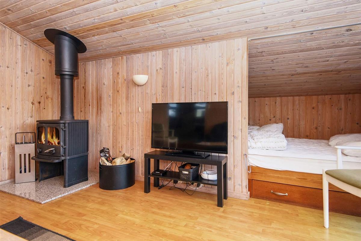 Ferienhaus nahe Wald und Strand. Es gibt hohe Decken und ein Bad mit Sauna und Whirlpool. Im Küchen-Wohnbereich kann sich die ganze Familie zu den Innenaktivitäten versammeln. Der Wohnraum liegt etwas tiefer und hat einen Holzofen für gemütliche Wärme. Drei Schlafzimmer und ein Alkoven bieten Schlafplatz. Es gibt eine große überdachte und eine offene Terrasse sowie eine große Rasenfläche, die zu Spiel und Spaß einlädt. Ganz in der Nähe des Hauses liegt ein Spielplatz. Für den Grill ist kein Gas bzw. keine Grillkohle vorhanden.