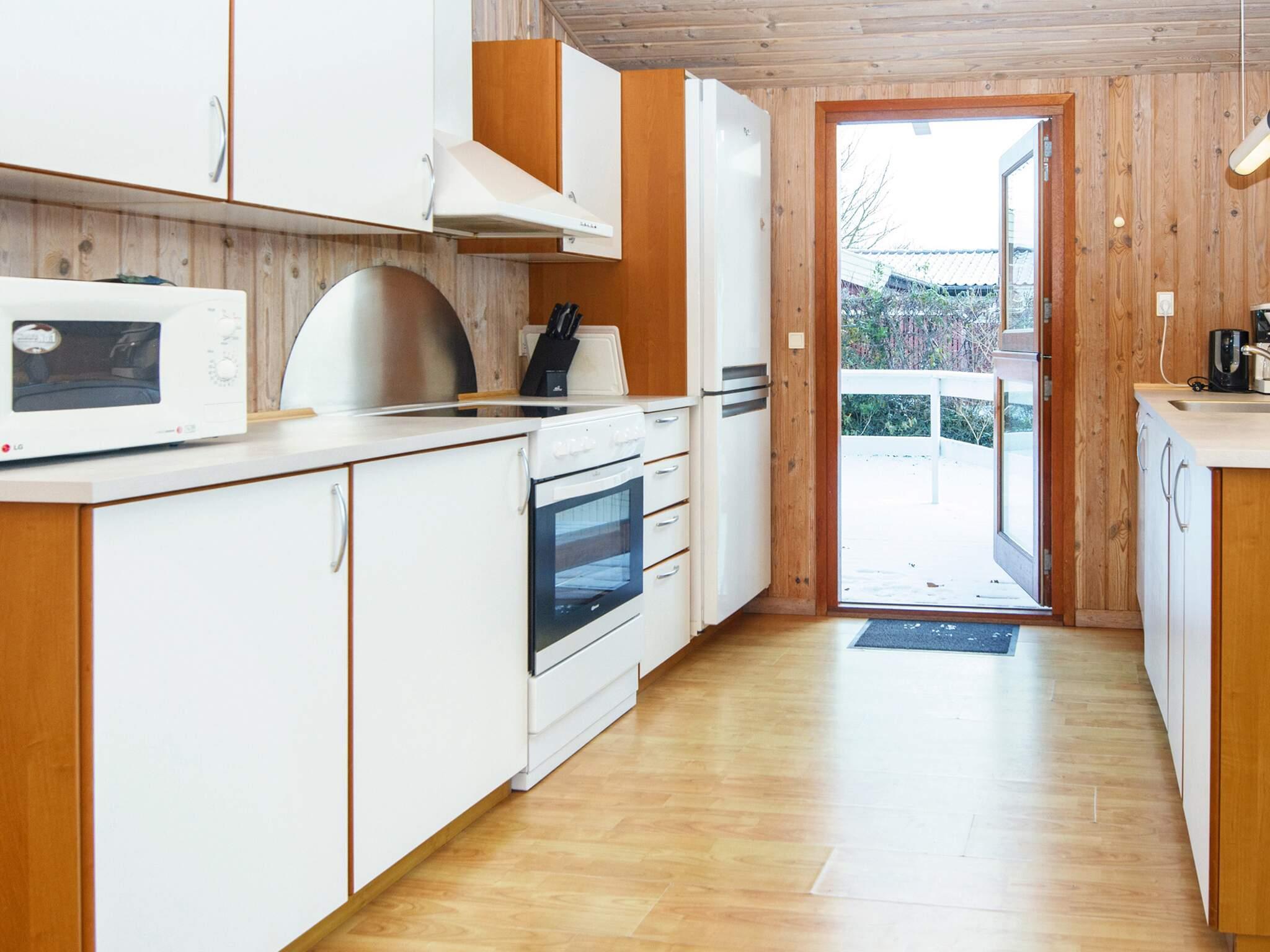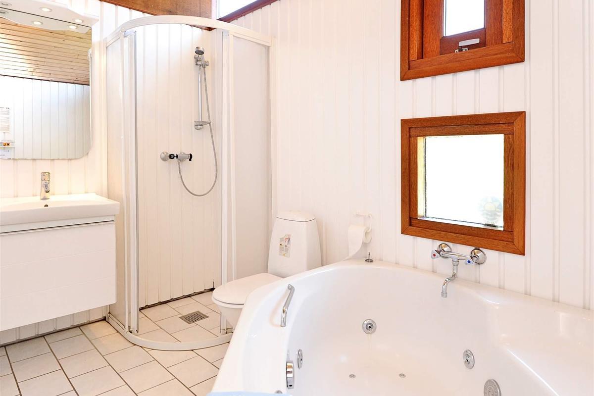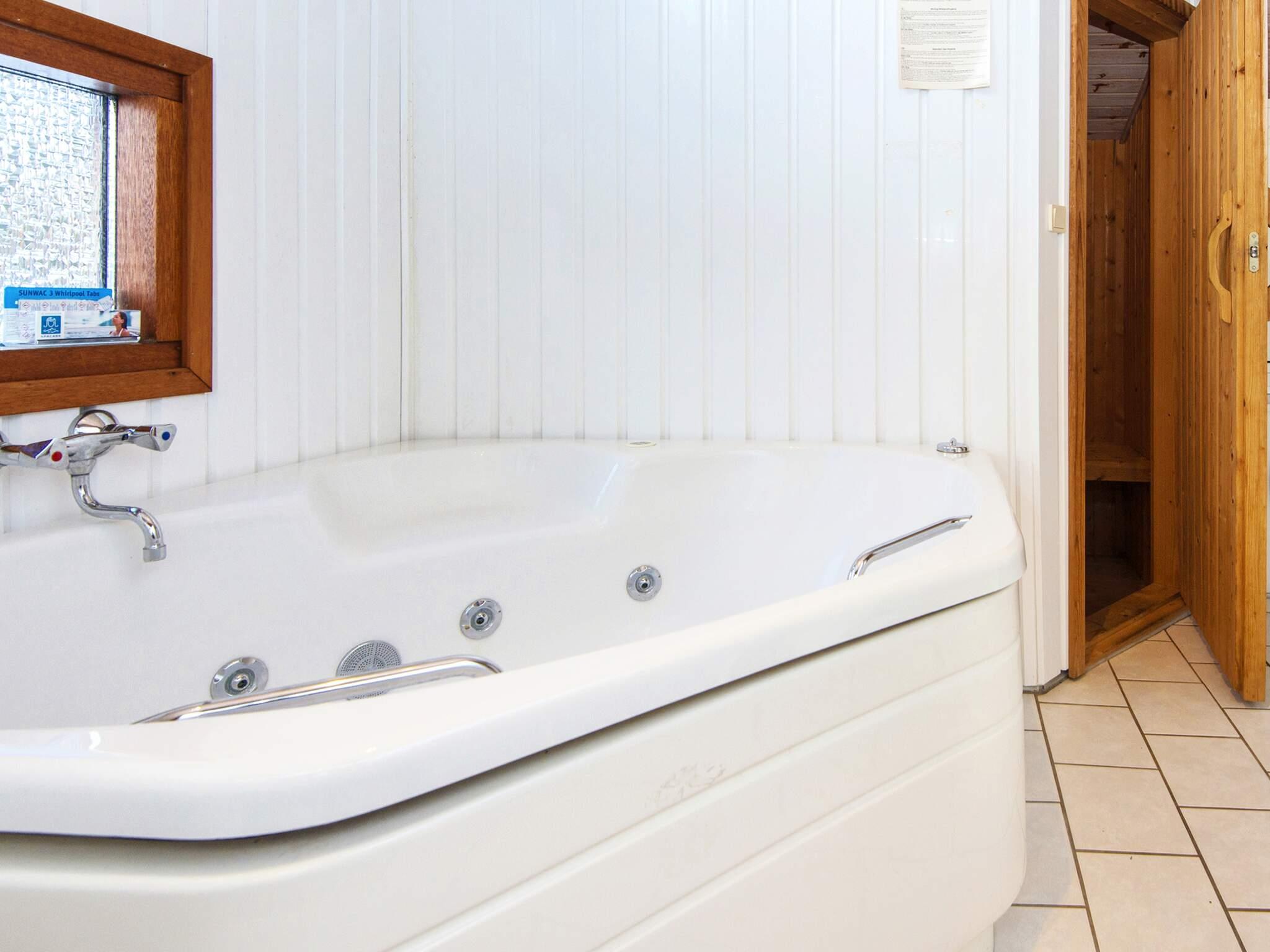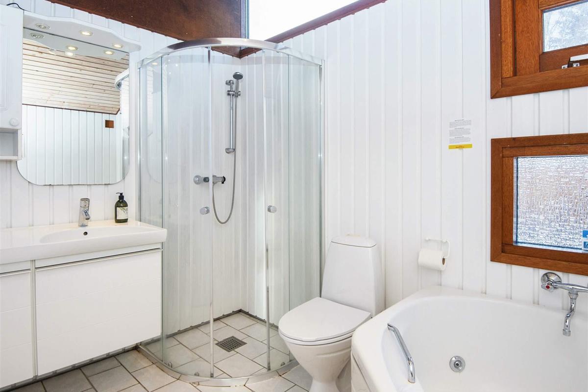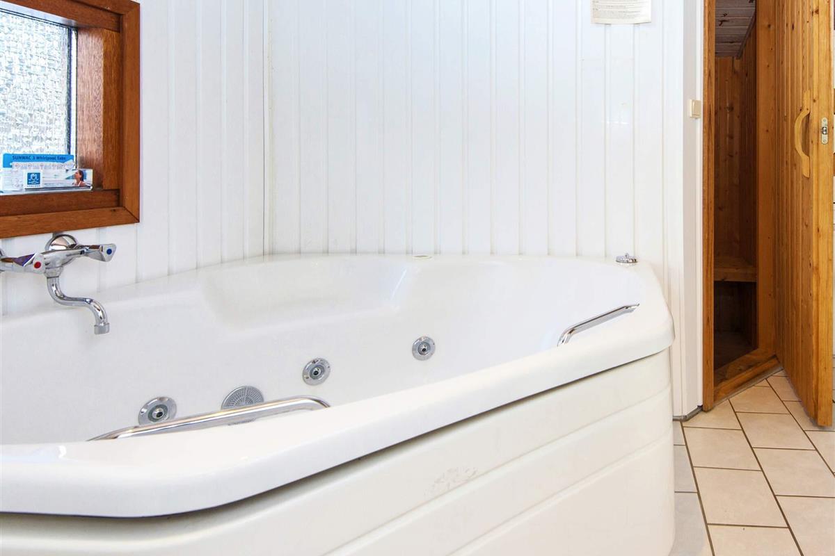 Ferienhaus nahe Wald und Strand. Es gibt hohe Decken und ein Bad mit Sauna und Whirlpool. Im Küchen-Wohnbereich kann sich die ganze Familie zu den Innenaktivitäten versammeln. Der Wohnraum liegt etwas tiefer und hat einen Holzofen für gemütliche Wärme. Drei Schlafzimmer und ein Alkoven bieten Schlafplatz. Es gibt eine große überdachte und eine offene Terrasse sowie eine große Rasenfläche, die zu Spiel und Spaß einlädt. Ganz in der Nähe des Hauses liegt ein Spielplatz. Für den Grill ist kein Gas bzw. keine Grillkohle vorhanden.