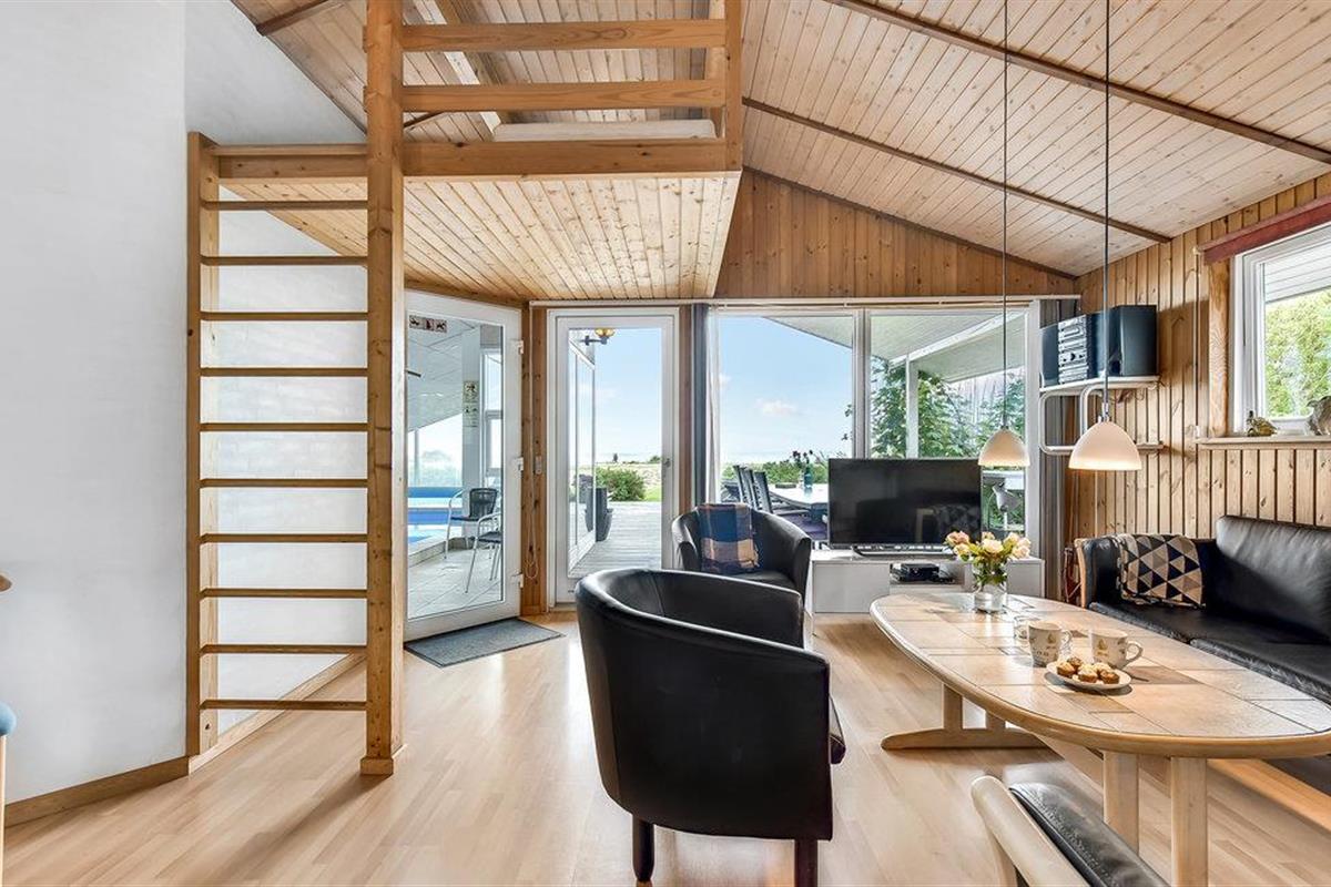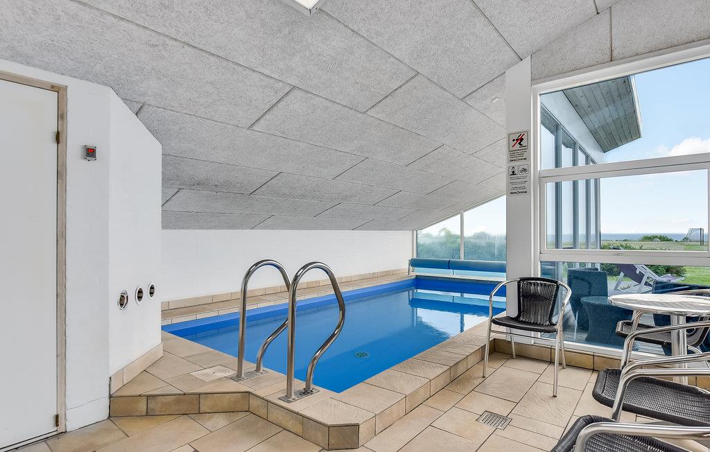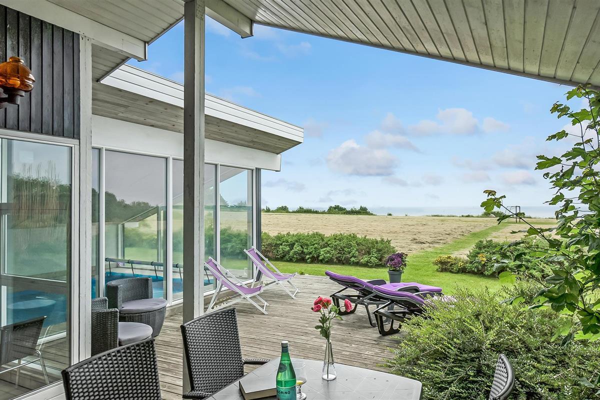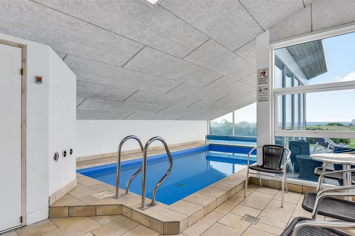 In de eerste rij van Pøt Strand ligt dit mooie vakantiehuis met een groot panoramisch uitzicht op de zee, zowel in de zwembadkamer als in de woonkamer.
