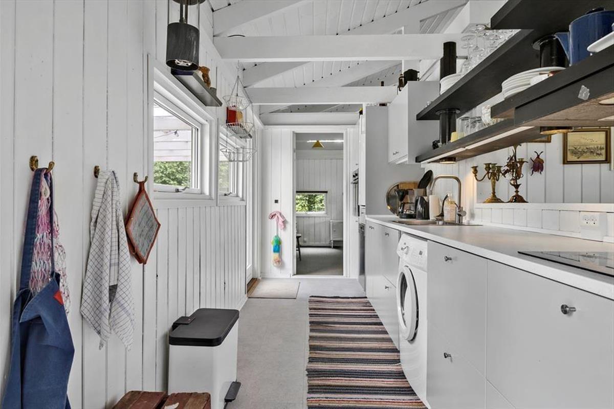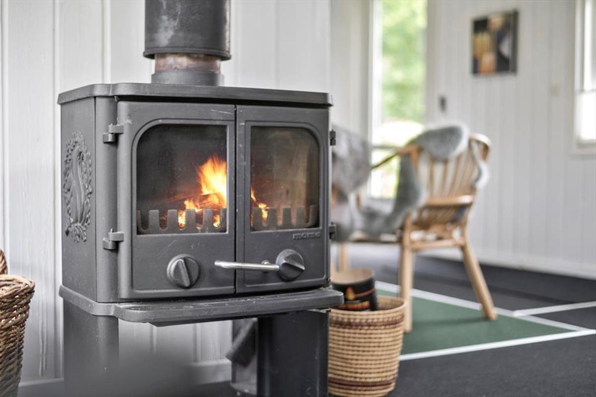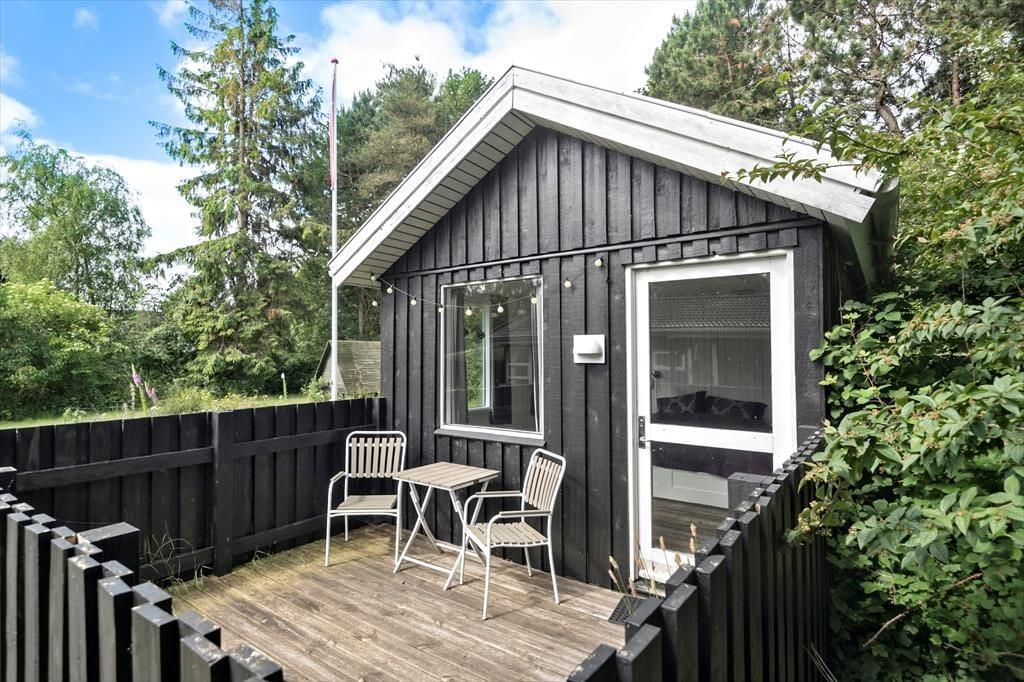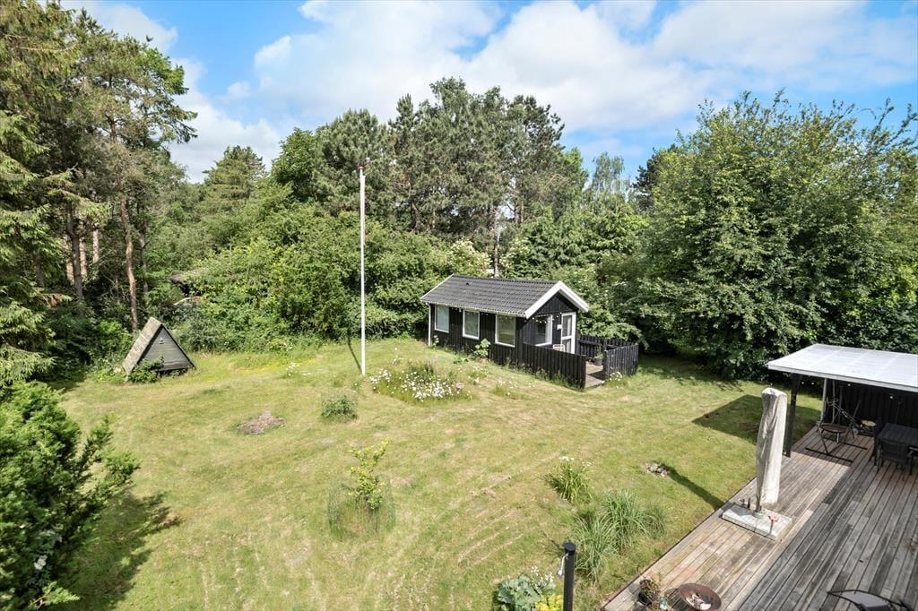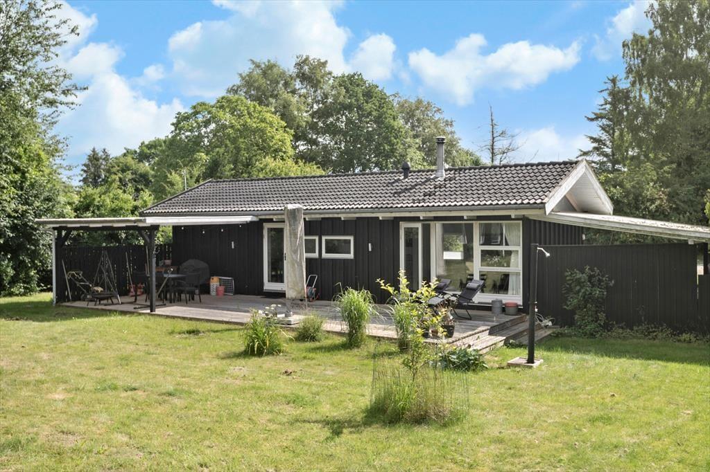 Sowohl von der Küche als auch vom Wohnzimmer aus gelangst du auf eine schöne, teilweise überdachte Holzterrasse und weiter hinaus in den ungestörten Garten, in dem sich auch eine Feuerstelle befindet. Hier kannst du die warmen Tage und die warmen Abende genießen, und wenn der Tau fällt, kannst du dich unter die Überdachung zurückziehen.