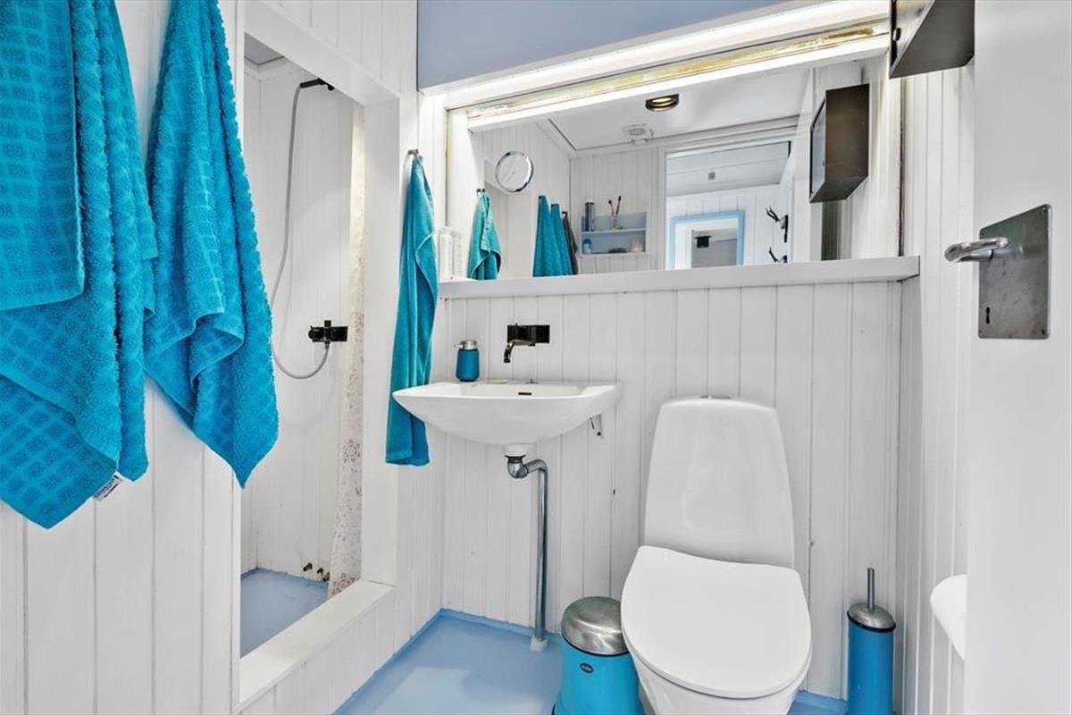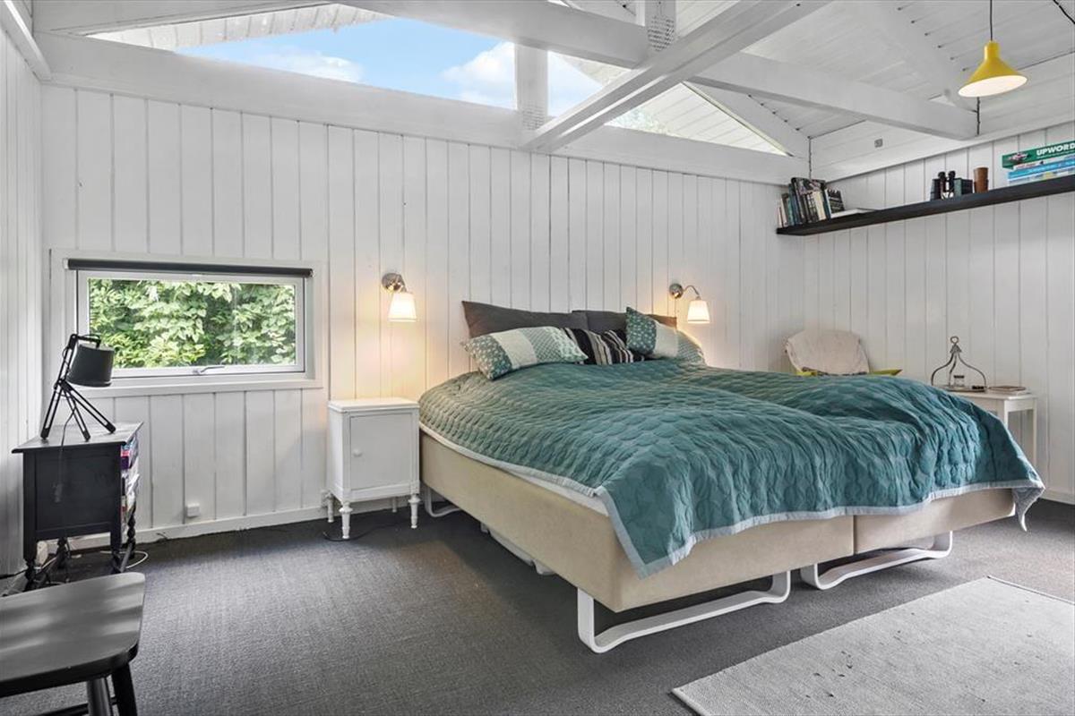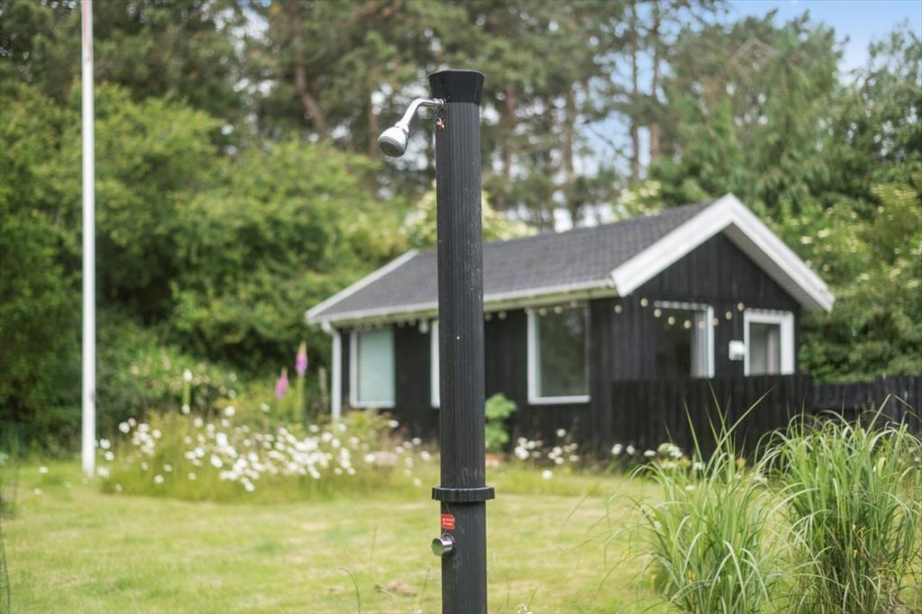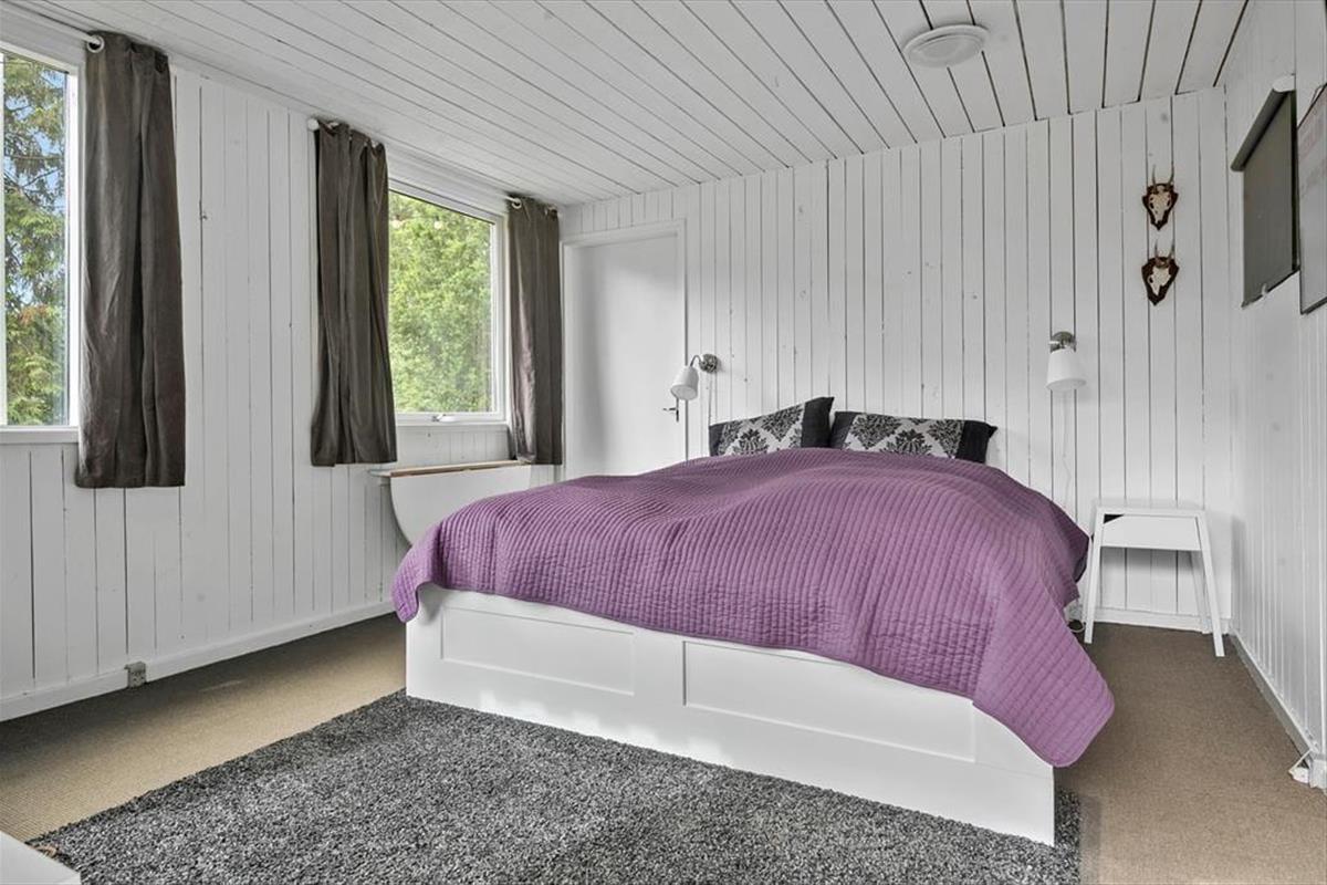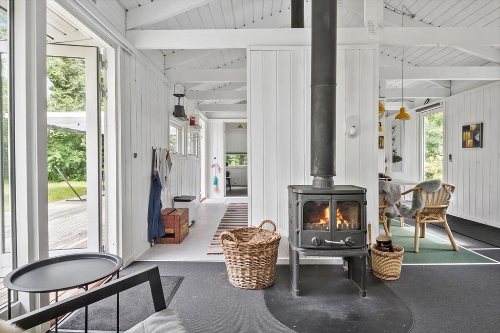 Sowohl von der Küche als auch vom Wohnzimmer aus gelangst du auf eine schöne, teilweise überdachte Holzterrasse und weiter hinaus in den ungestörten Garten, in dem sich auch eine Feuerstelle befindet. Hier kannst du die warmen Tage und die warmen Abende genießen, und wenn der Tau fällt, kannst du dich unter die Überdachung zurückziehen.