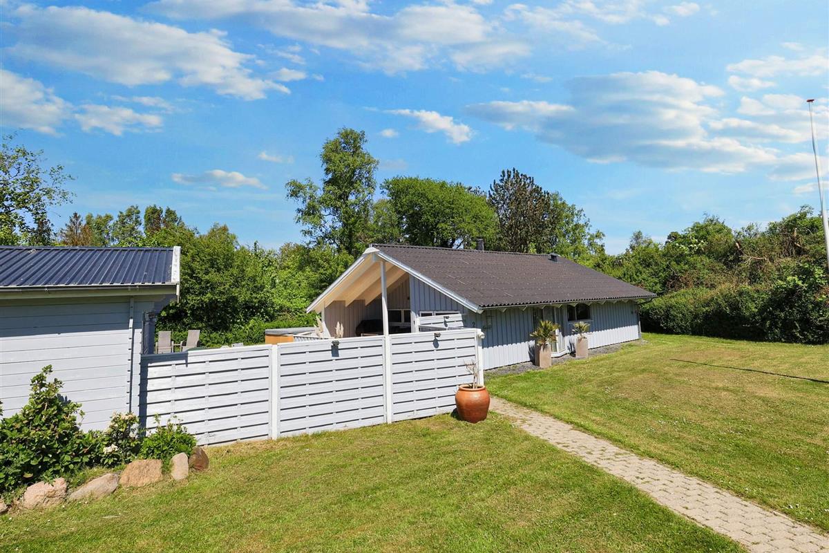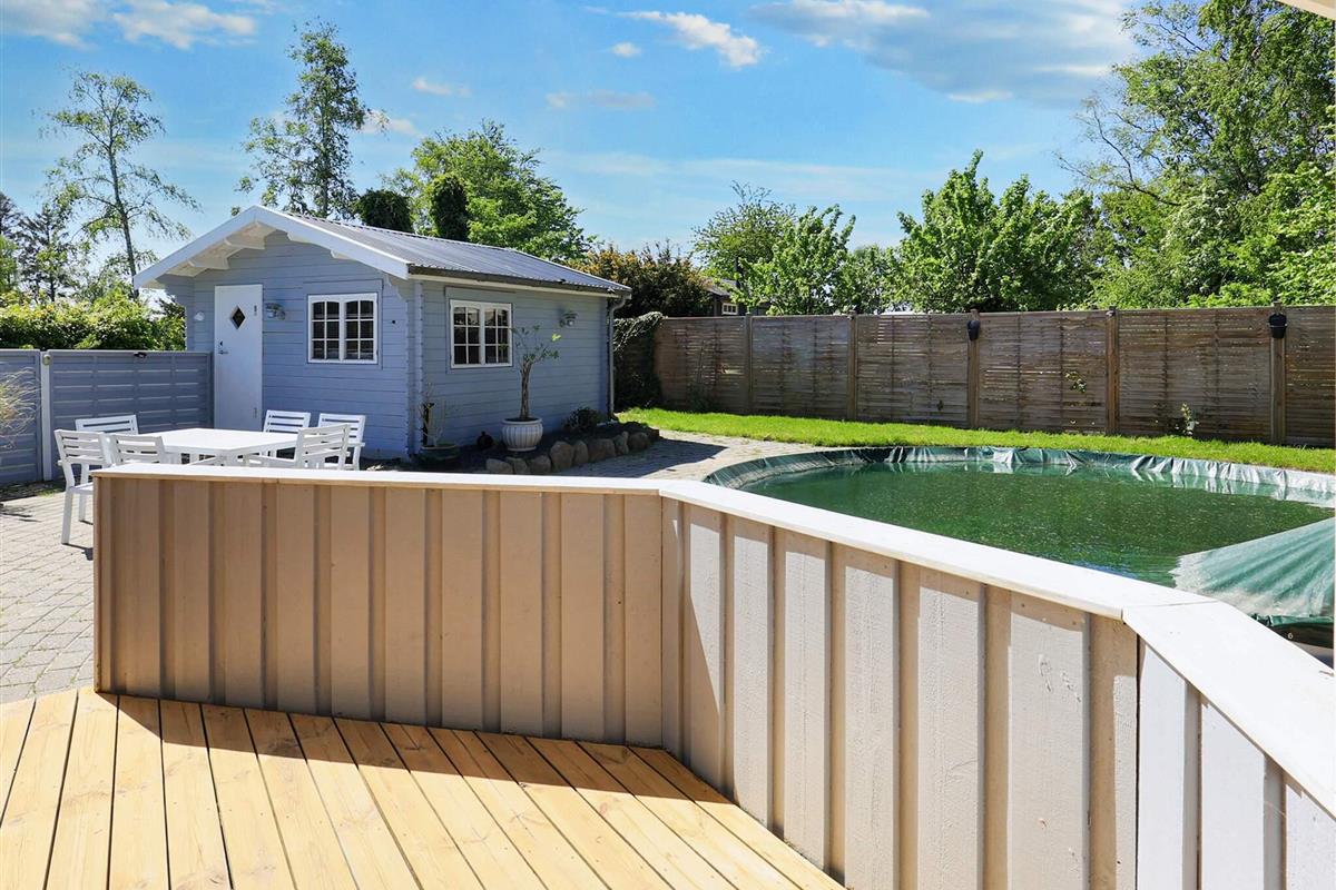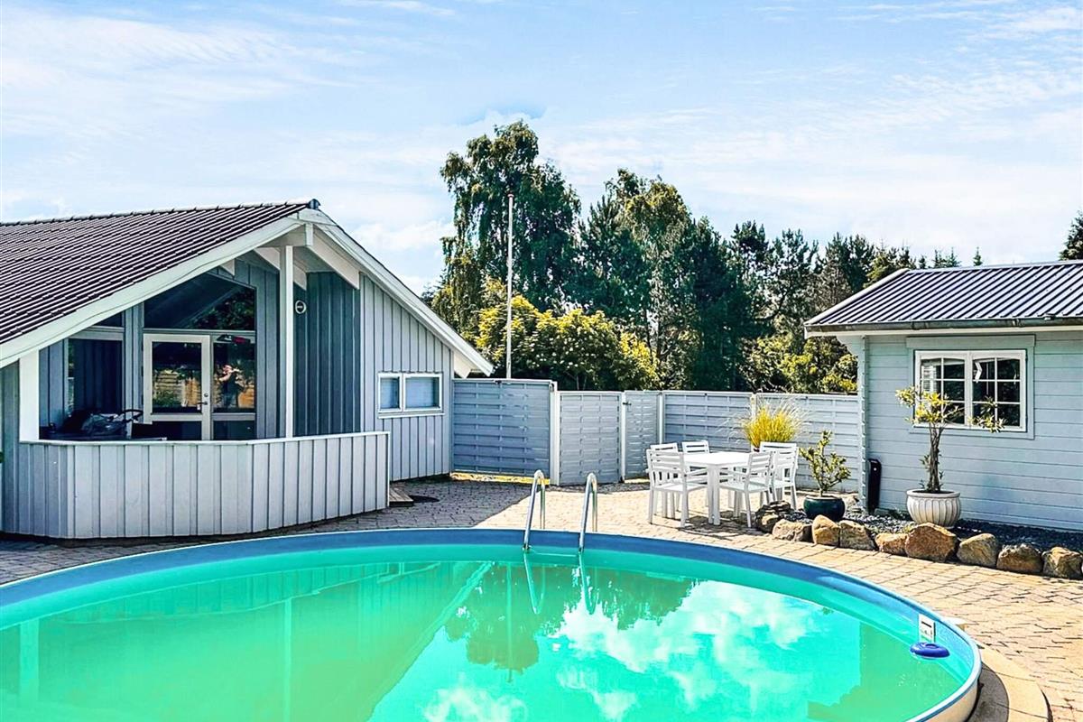 Vom Wohnzimmer aus hat man direkten Zugang zu einer großen, teilweise überdachten Holzterrasse und dem schönsten, geschlossenen Innenhof mit einem runden Swimmingpool mit 6 m Durchmesser und einem Whirlpool im Freien. Der Pool ist unbeheizt und steht im Zeitraum 01.06. - 31.08. zur Nutzung bereit. Im Poolbereich neben der Terrasse finden Sie auch den Grill. Nach Præstø, das Gemütlichkeit und Charme ausstrahlt, sind es nur knapp 6 km.