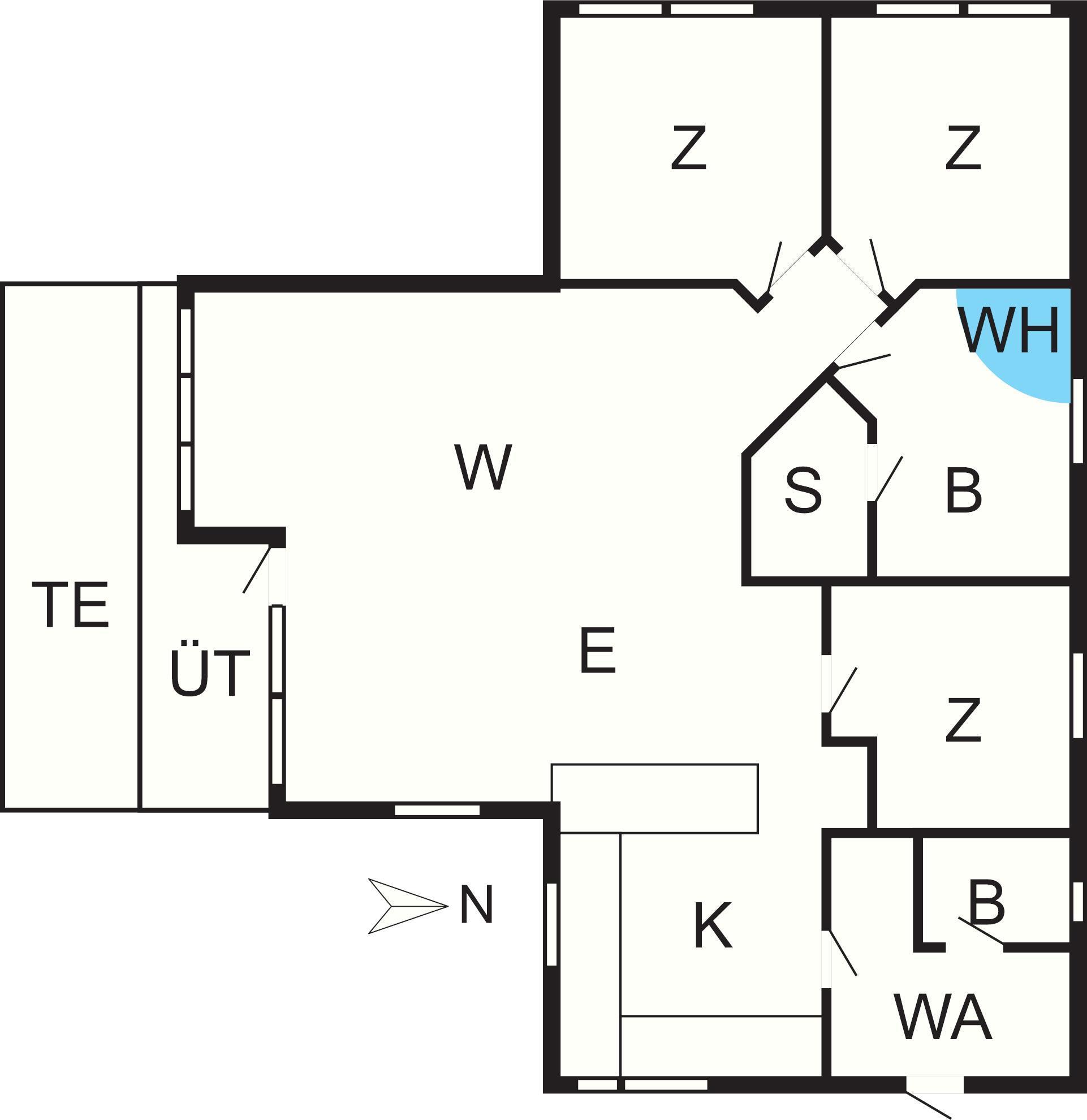 Und: Terrasse, überd. Terrasse, E-Heiz., Luft-Luft-Wärmepumpe, Spielgeräte, Grill, Naturgrundst. m. Bäumen 1200 m2, moderne Möblierung, Ferienhausgebiet, Nichtraucherhaus