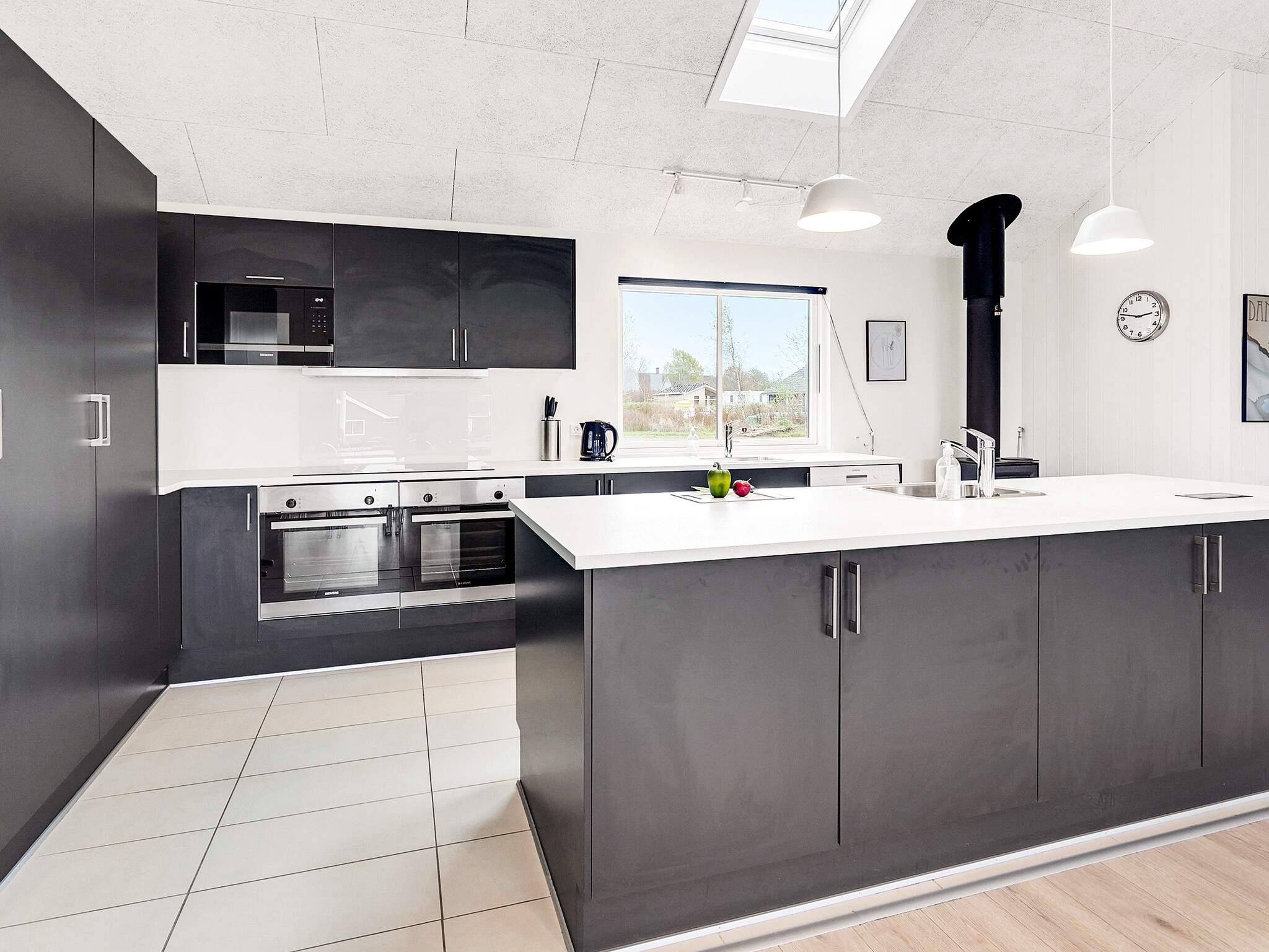 Das Feriendomizil ist optimal mit modernem Mobiliar eingerichtet, sehr geräumig und gut dimensioniert. Der geräumige Wohnbereich bietet Zugang zur Terrasse und bildet den natürlichen Mittelpunkt des Hauses. Hier stehen Ess- und Sitzecke sowie ein Holzofen für kühlere Abende bereit. Der Küchenbereich ist offen integriert.