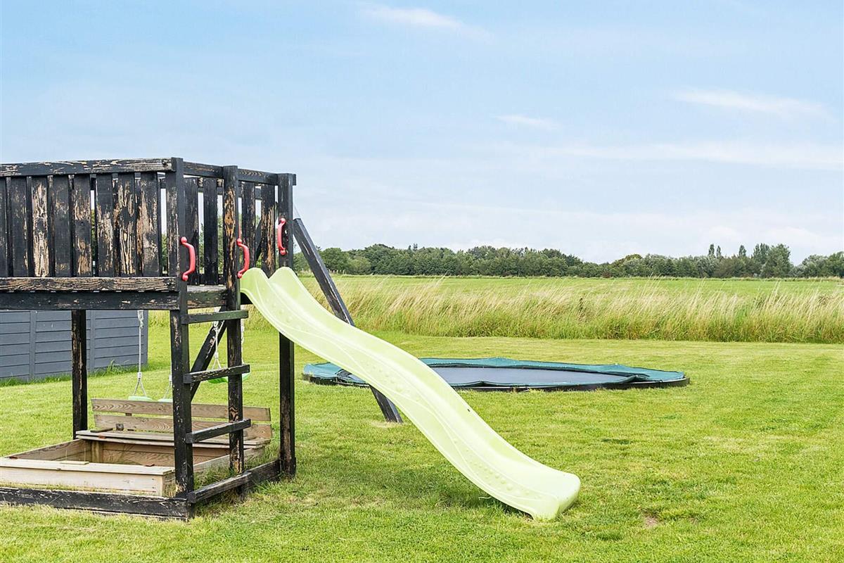 Die Kinder sind mit Schaukel, Kletterturm und Sandkasten beschäftigt. Außerdem steht ein Gartentrampolin bereit (Nutzung nur auf eigenes Risiko!).