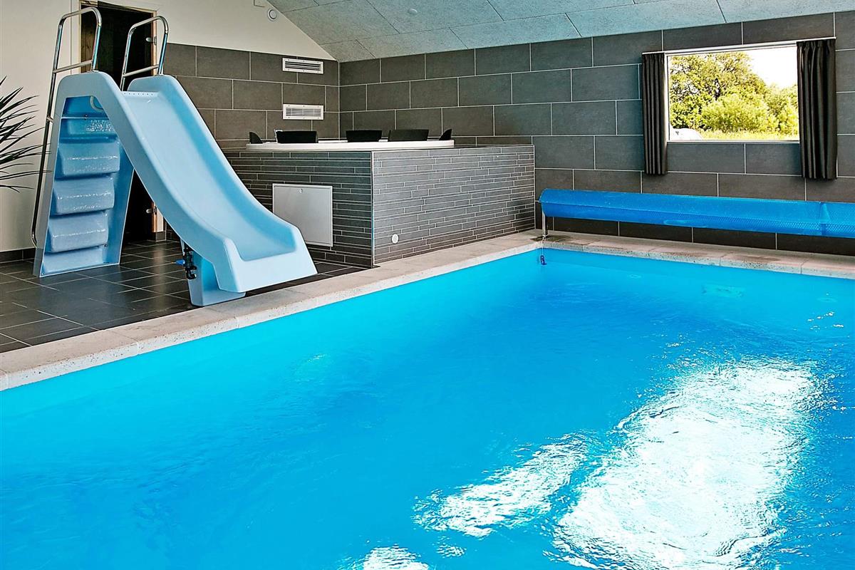 Im Poolbereich befindet sich der 18 m² große Swimmingpool mit Rutsche für die Kinder. Entspannen können Sie anschließend im Whirlpool oder in der Sauna. Die hohen Decken vermitteln ein gutes Raumgefühl.