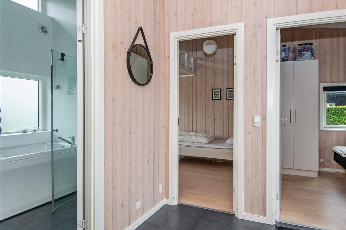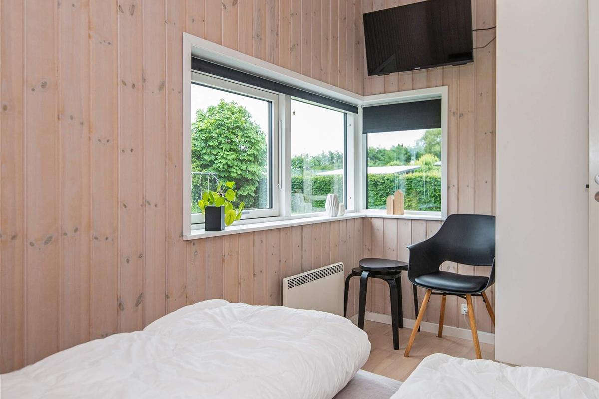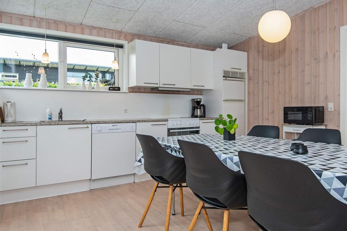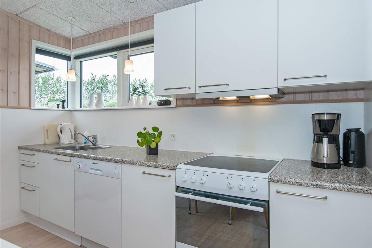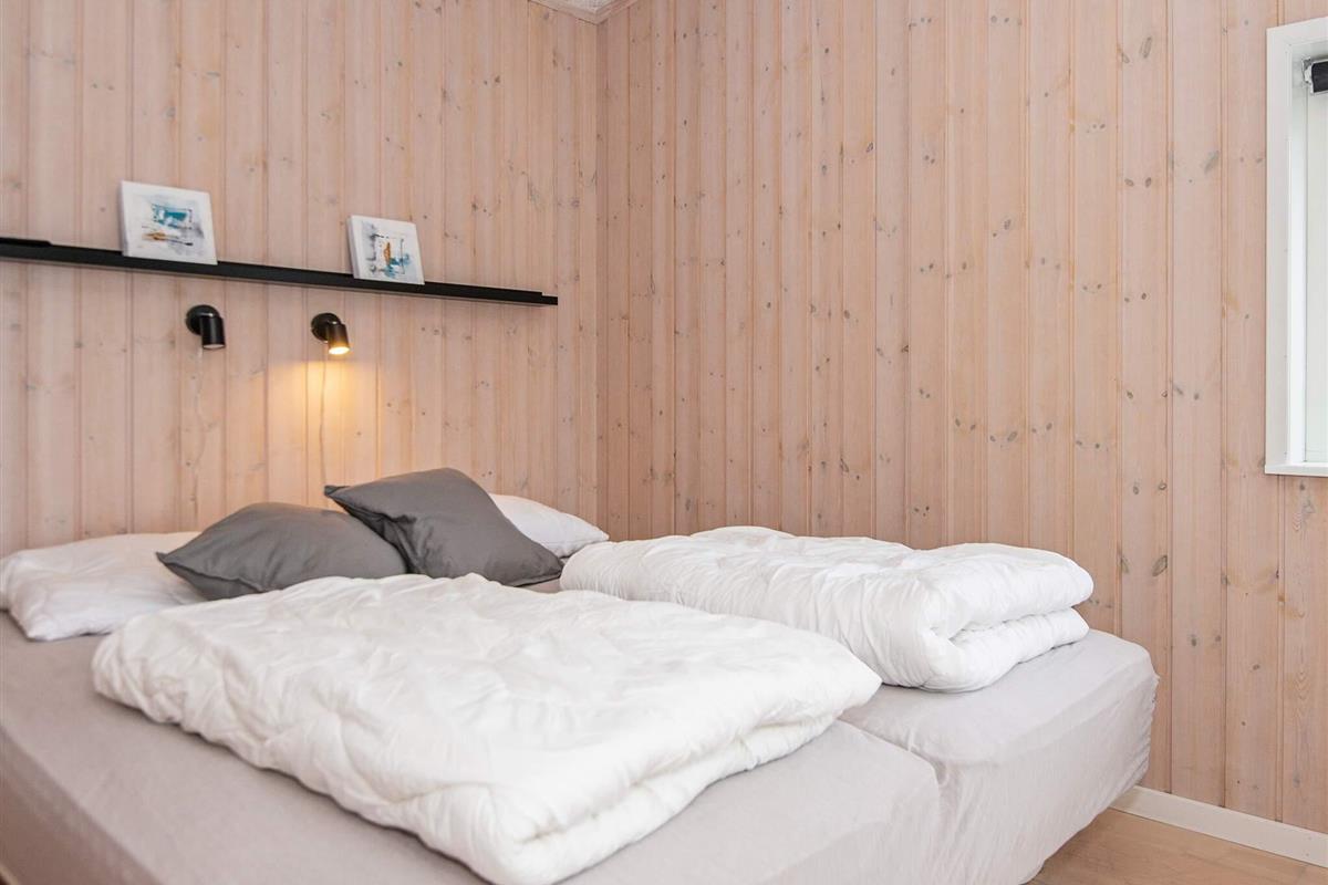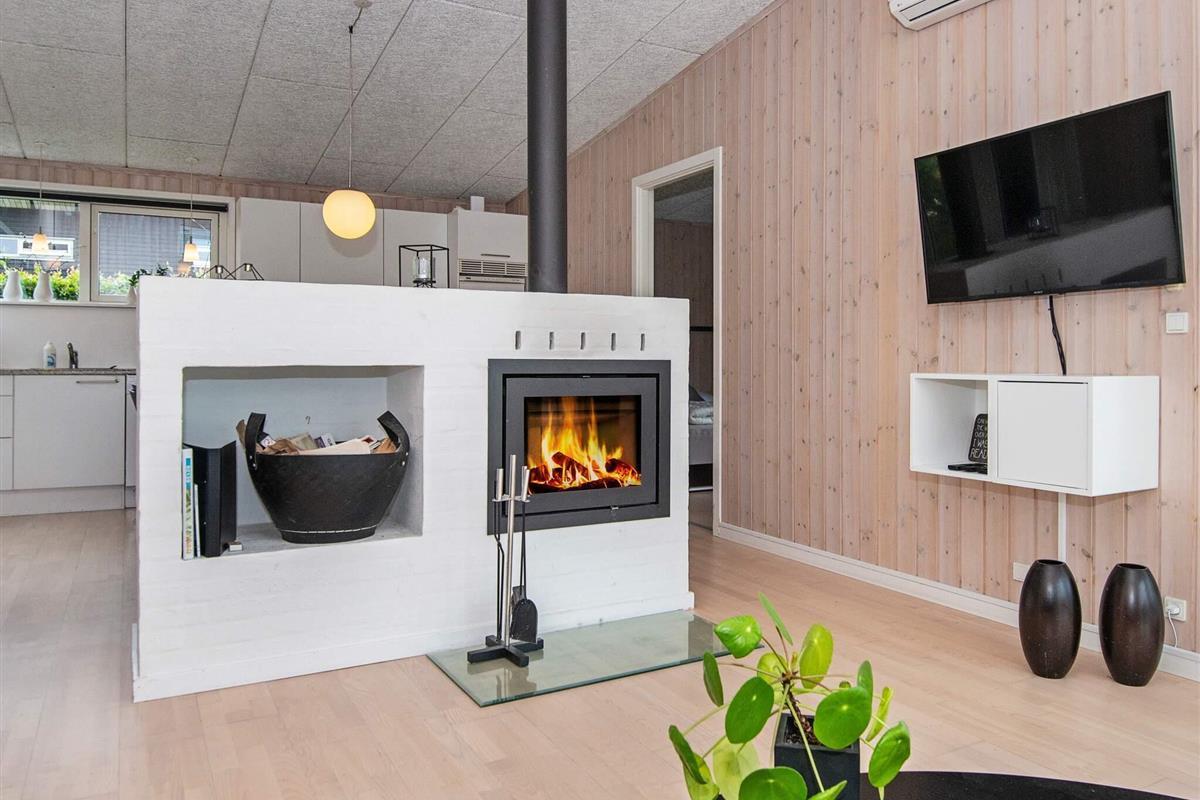 Es bietet drei Schlafzimmer mit jeweils zwei Schlafplätzen in Betten sowie ein großes Badezimmer mit u.a. Whirlpool für erholsame Stunden. Die Einrichtung ist durchgehend stilvoll und hell. Mitten im offenen Küchen-/Wohnbereich für das Familienleben steht ein attraktiver Kaminofen für kühlere Abende. Das Ferienhaus ist zudem mit einer energieeffizienten Wärmepumpe, die das ganze Jahr hindurch für angenehme Innentemperaturen im Haus sorgt, ausgestattet.