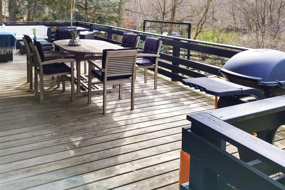 Schöner großer Terrassenbereich mit Markise, Gartenmöbeln und Blick auf den Garten mit reichlich Gelegenheit für Sonne, Schatten, Entspannung und Grillen auf dem Holzkohlegrill. Trampolin für die Kinder (Nutzung nur auf eigenes Risiko). Es gibt auch einen Carport. In der Nähe des Hauses findet man ein Lebensmittelgeschäft und am Strand mehrere Möglichkeiten zum Essen sowie eine Eisdiele.