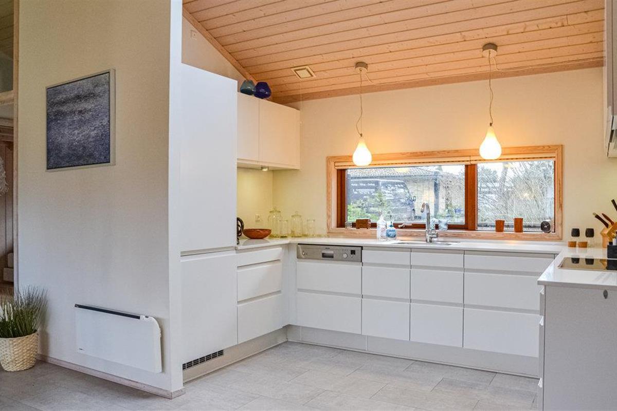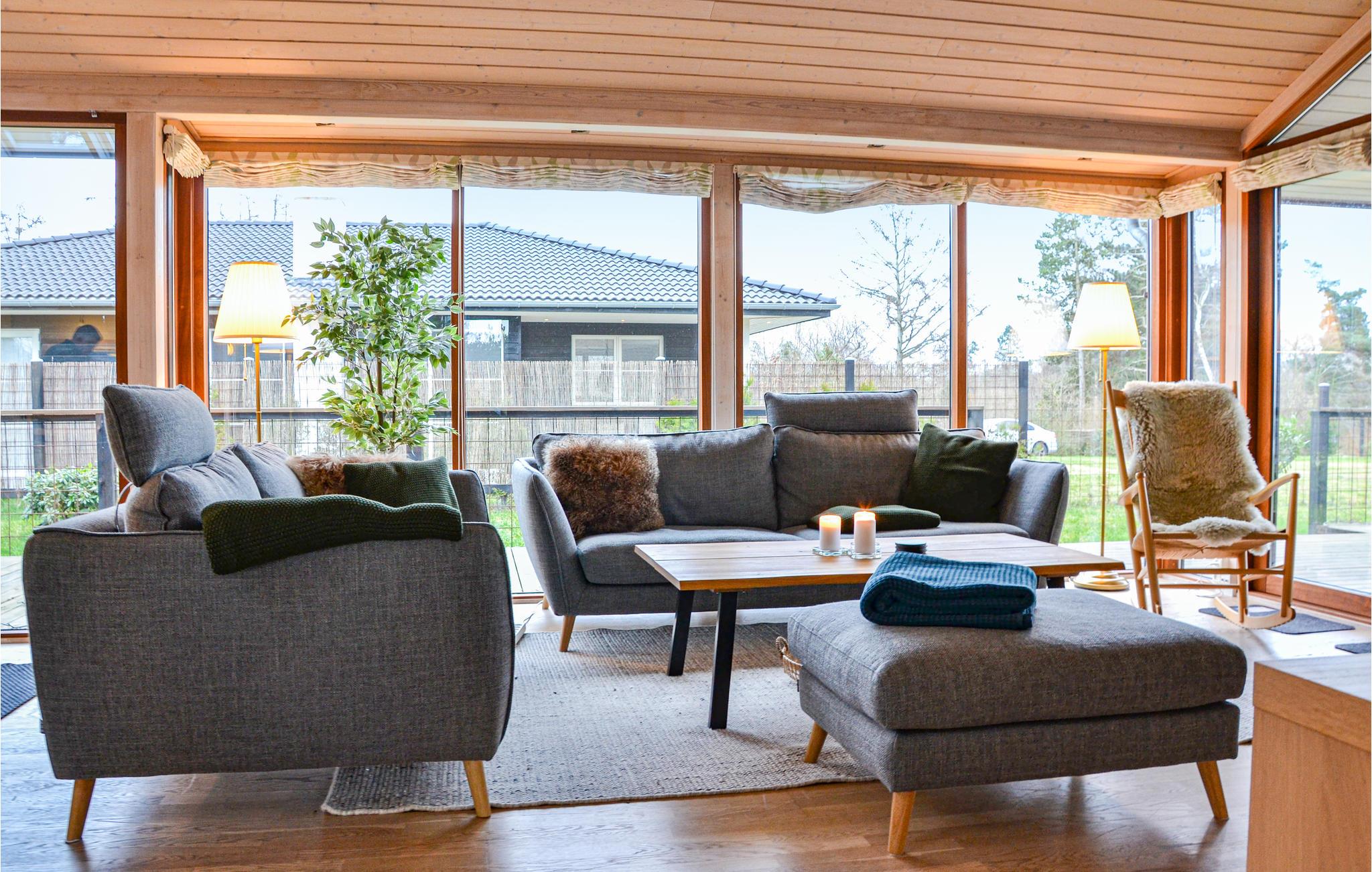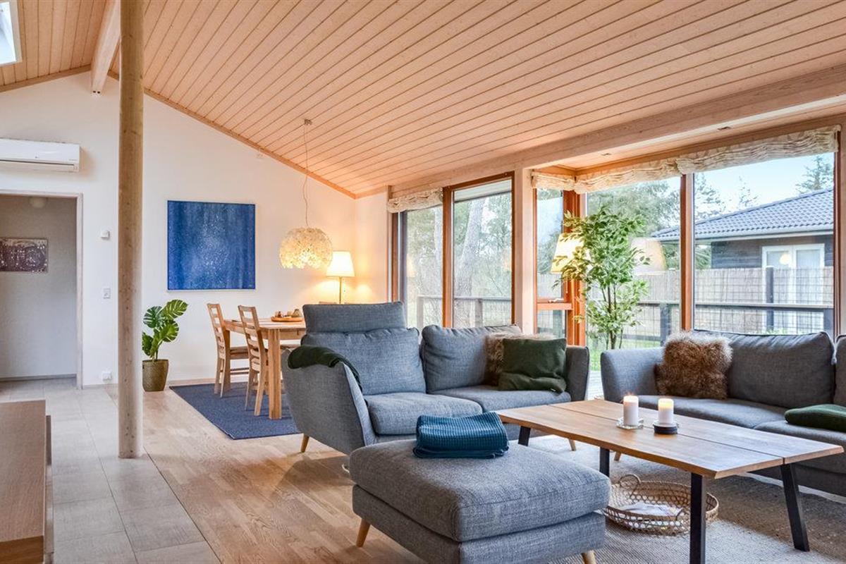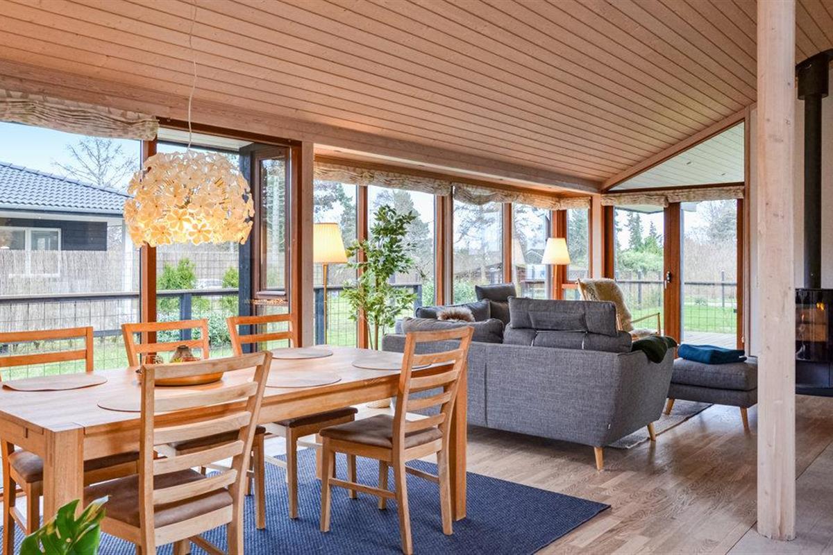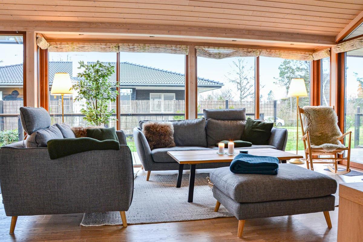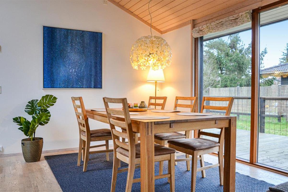 Smaakvol ingericht vakantiehuis met veel lichtinval, houtkachel en open keuken in Rågeleje, dicht bij het strand.