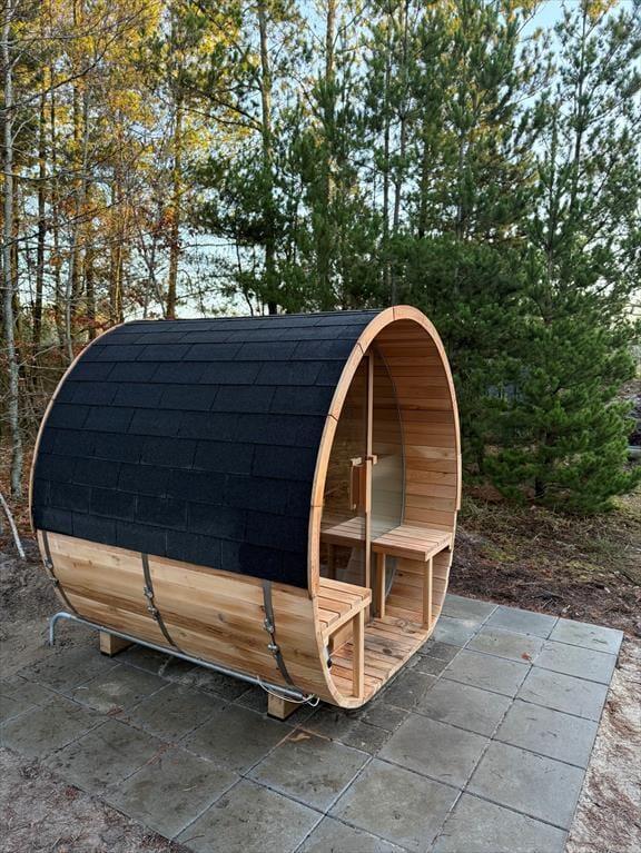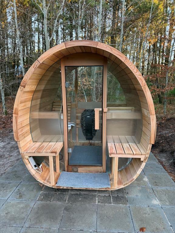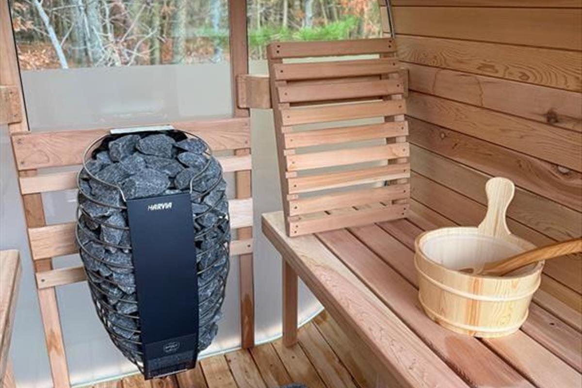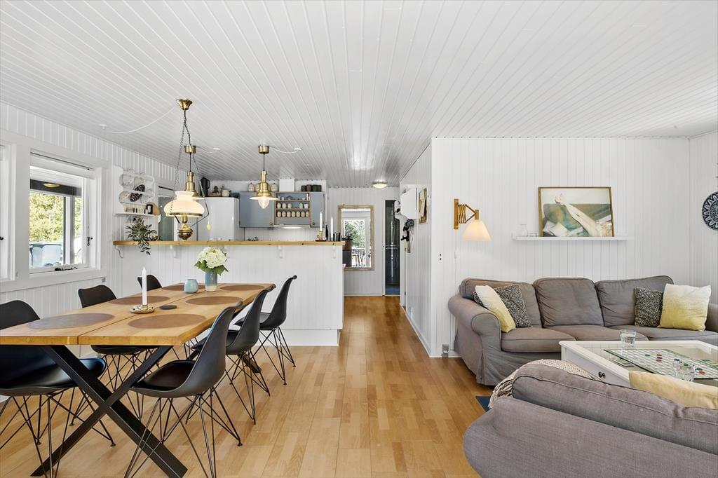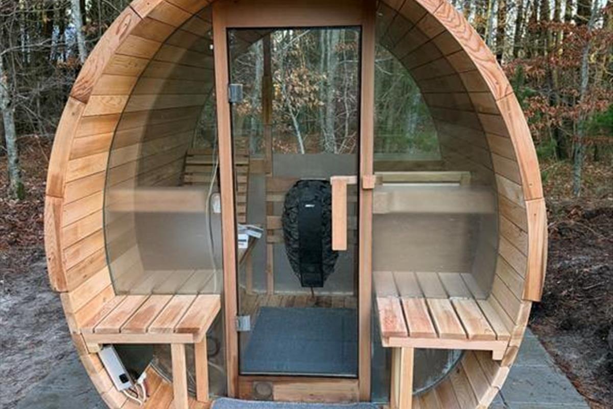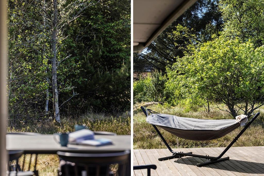 Die großzügige Holzterrasse und das schöne Naturgrundstück laden zu langen Stunden an der frischen Luft ein. Dusche unter freiem Himmel, während die Kinder auf dem Trampolin toben, oder gönn dir eine ruhige Pause mit einer Tasse Tee und einer weichen Decke in der Sonne. Dank der geschützten Lage findest du hier immer ein Plätzchen mit Sonne oder Schatten. Wenn der Abend naht und der Himmel sich verfärbt, wird der Grill angeheizt – und du kannst ein herrliches Essen unter freiem Himmel genießen, vielleicht gefolgt von Sternenhimmel und Geschichten im Gras.