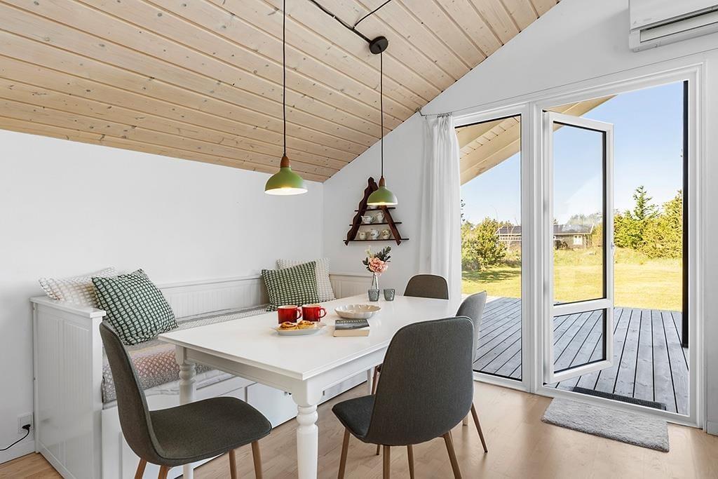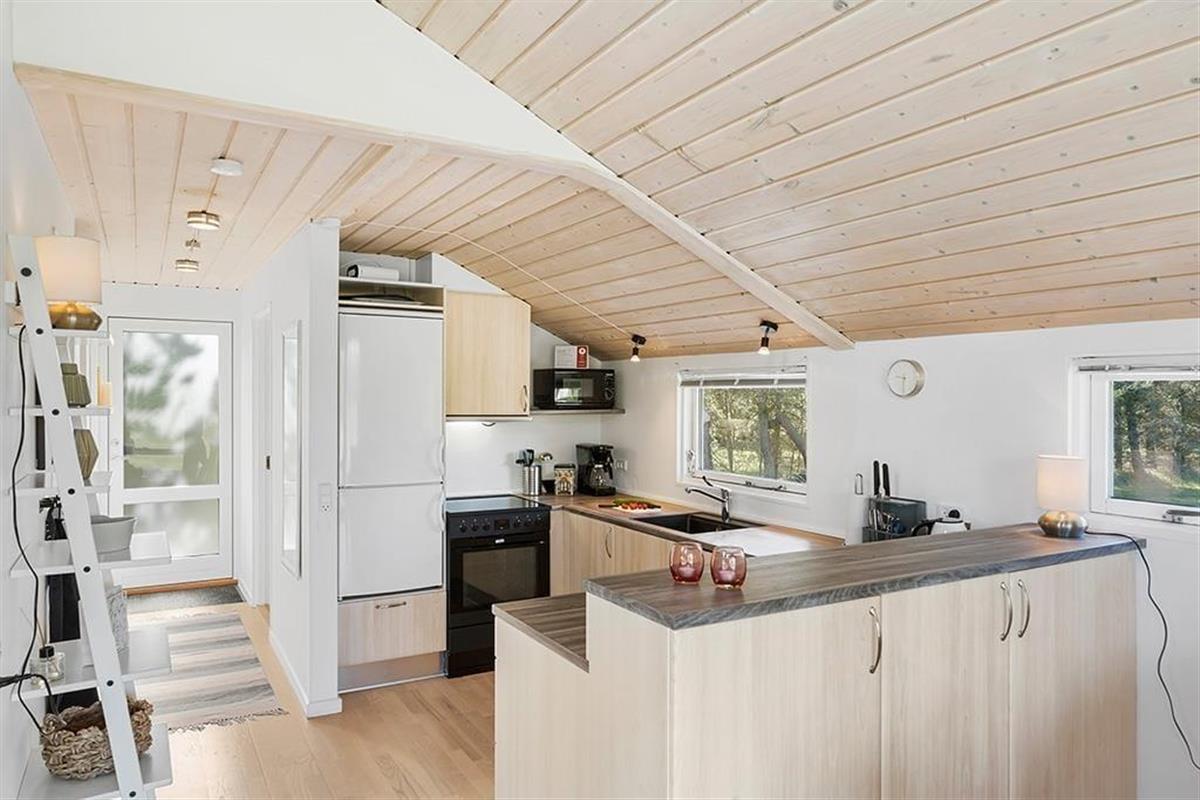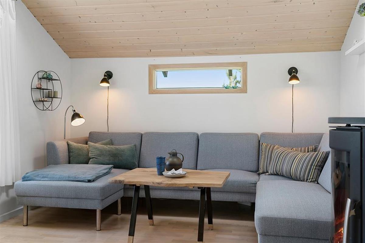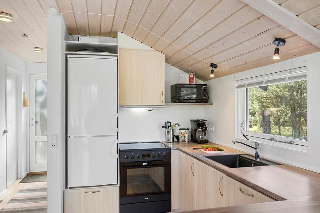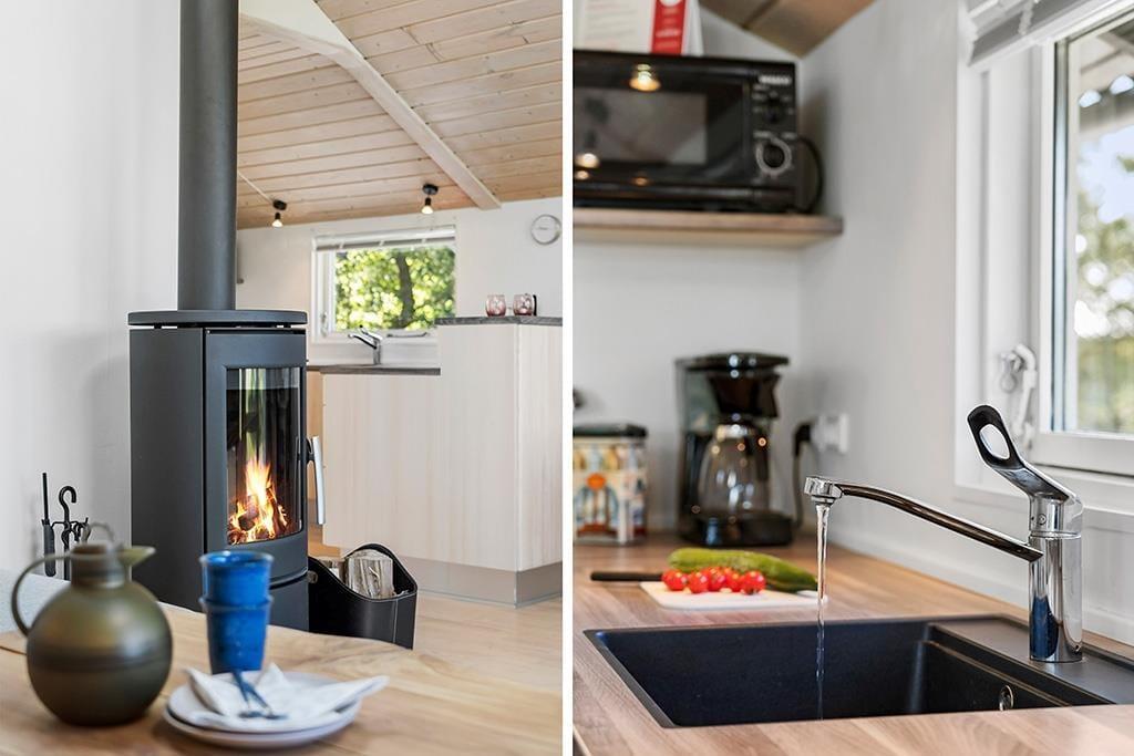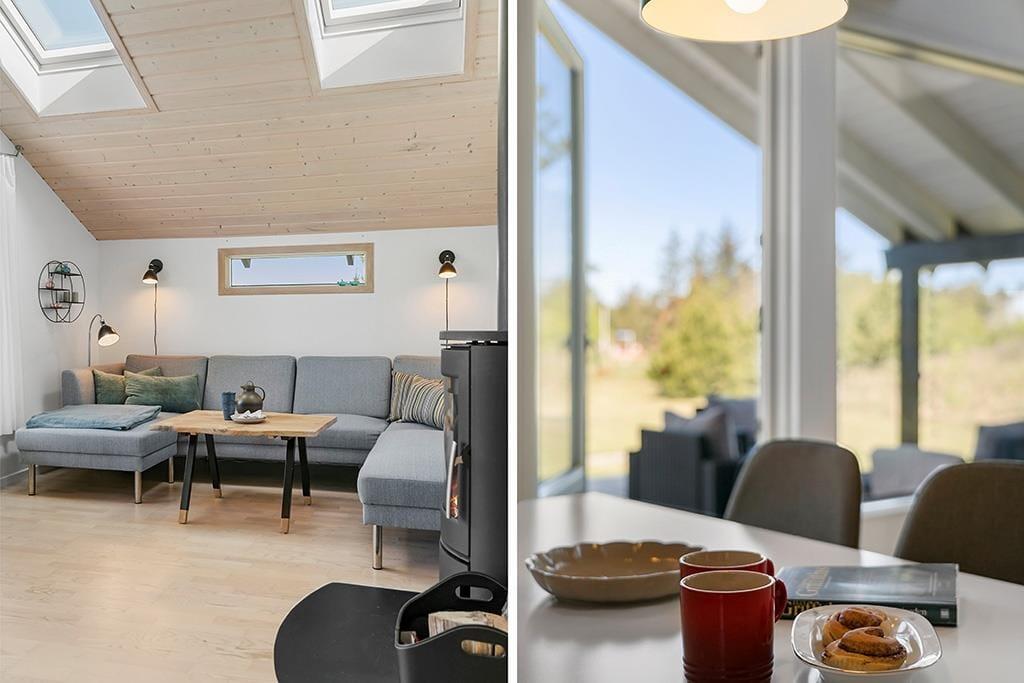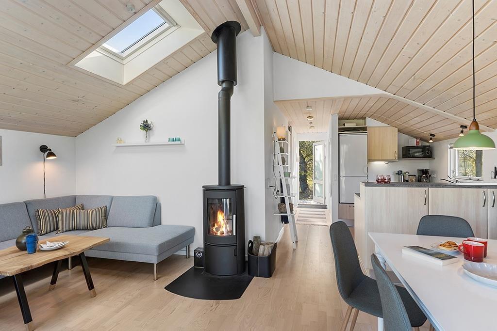 Innen erwartet euch eine gemütliche Atmosphäre mit hellen Wänden und großen Fenstern, die viel Tageslicht hereinlassen. Der Wohnbereich ist das Herzstück des Hauses, wo ihr gemeinsame Mahlzeiten genießen, ein Buch auf dem Sofa lesen oder an kühleren Abenden die Wärme des Kaminofens spüren könnt. Die offene Küche lädt zum gemeinsamen Kochen ein, während ihr weiterhin am Familienleben teilhabt. Das Ferienhaus verfügt zudem über zwei behagliche Schlafzimmer und ein Badezimmer mit Dusche.