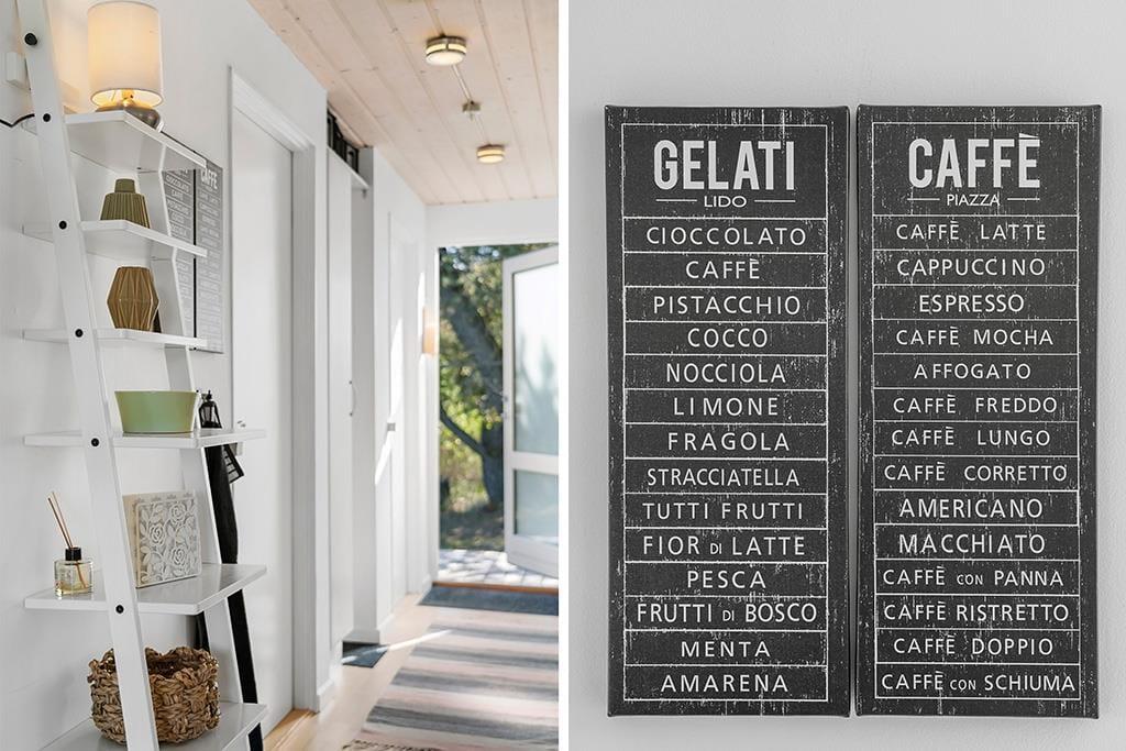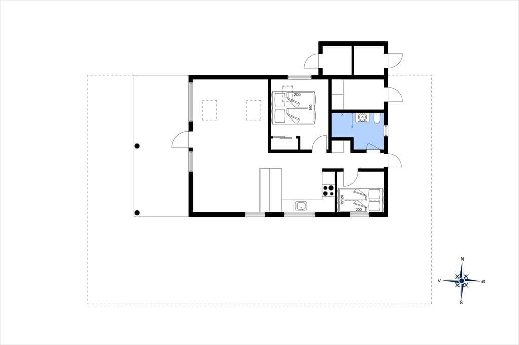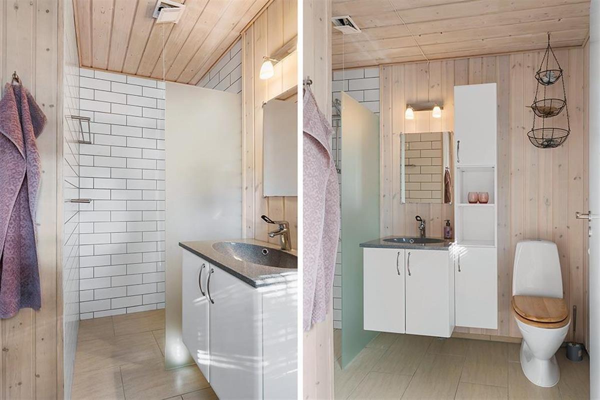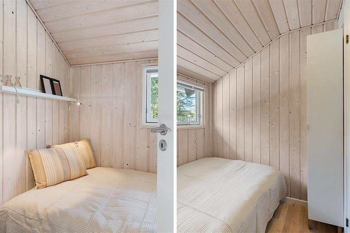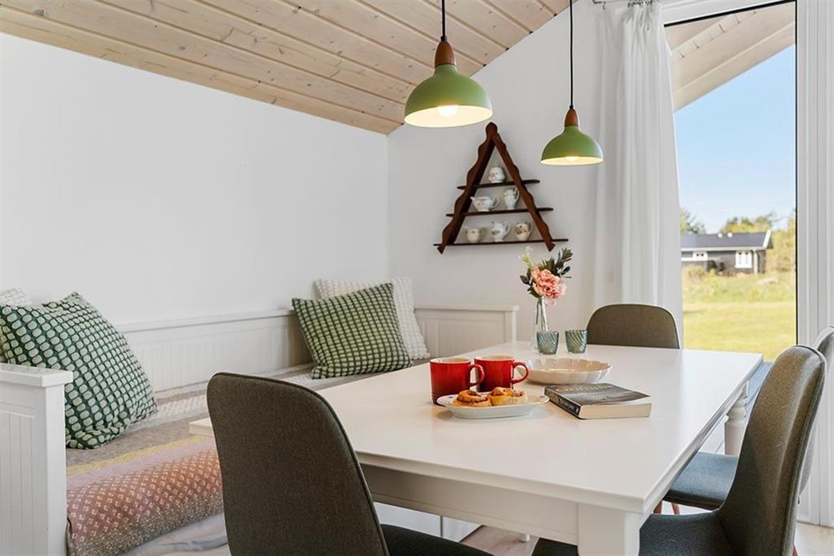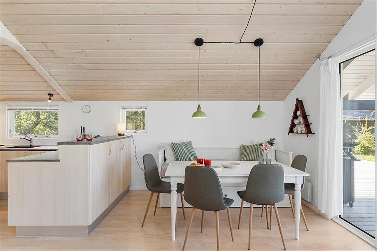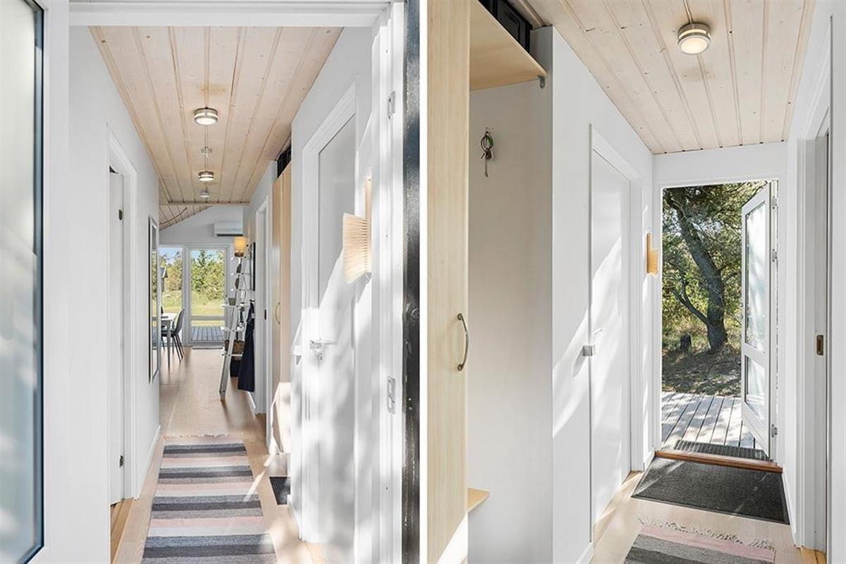 Innen erwartet euch eine gemütliche Atmosphäre mit hellen Wänden und großen Fenstern, die viel Tageslicht hereinlassen. Der Wohnbereich ist das Herzstück des Hauses, wo ihr gemeinsame Mahlzeiten genießen, ein Buch auf dem Sofa lesen oder an kühleren Abenden die Wärme des Kaminofens spüren könnt. Die offene Küche lädt zum gemeinsamen Kochen ein, während ihr weiterhin am Familienleben teilhabt. Das Ferienhaus verfügt zudem über zwei behagliche Schlafzimmer und ein Badezimmer mit Dusche.