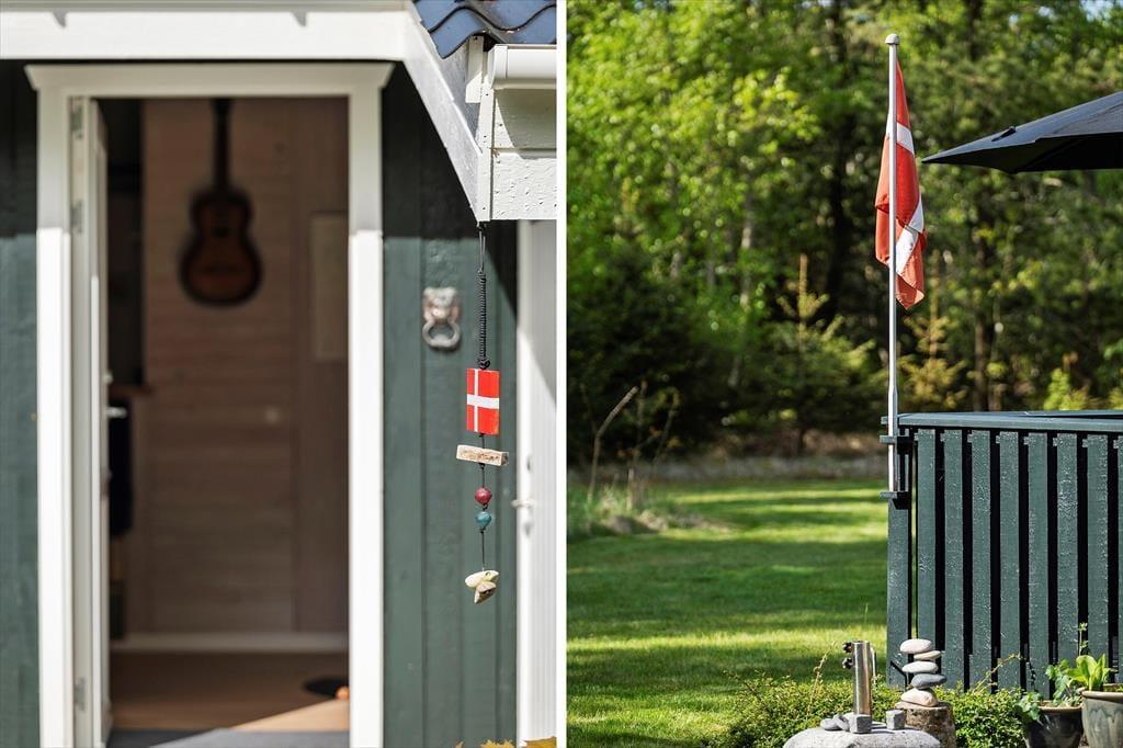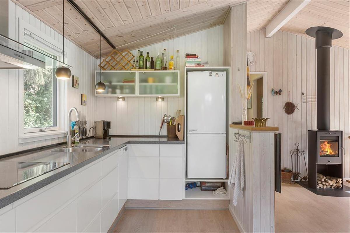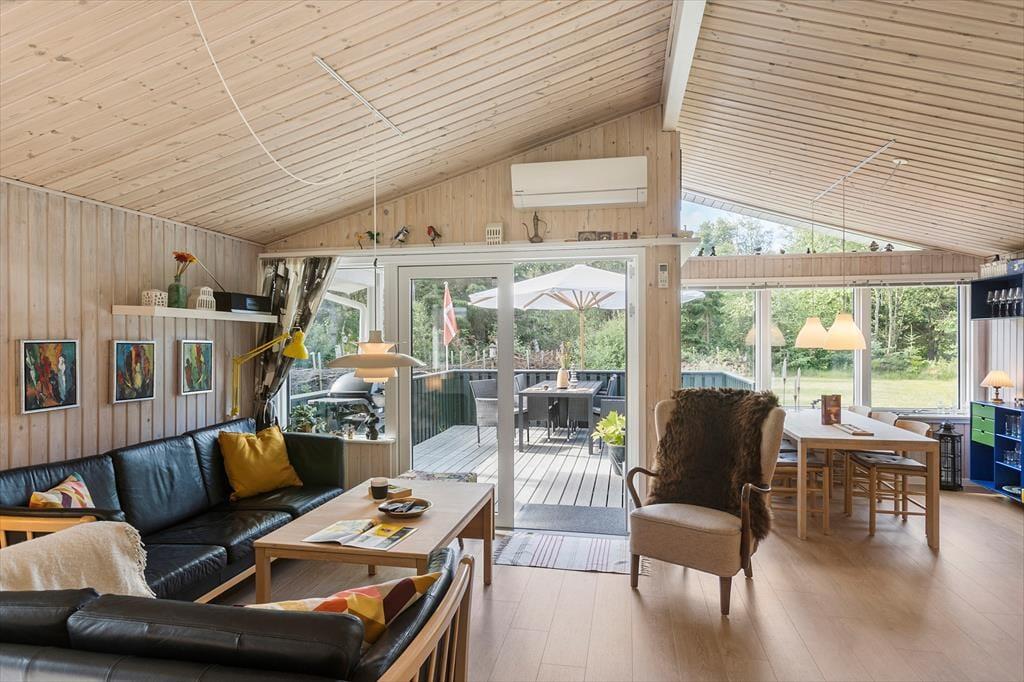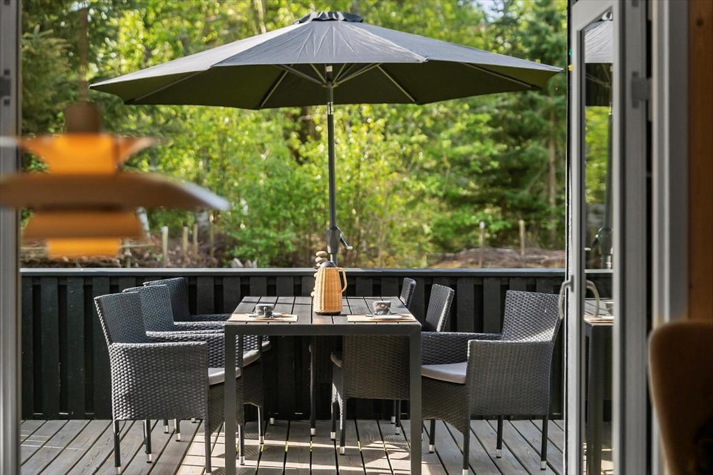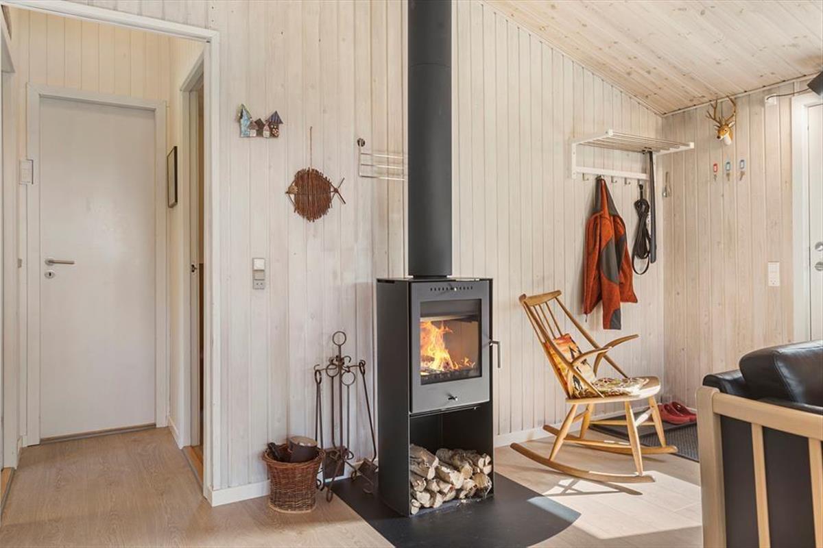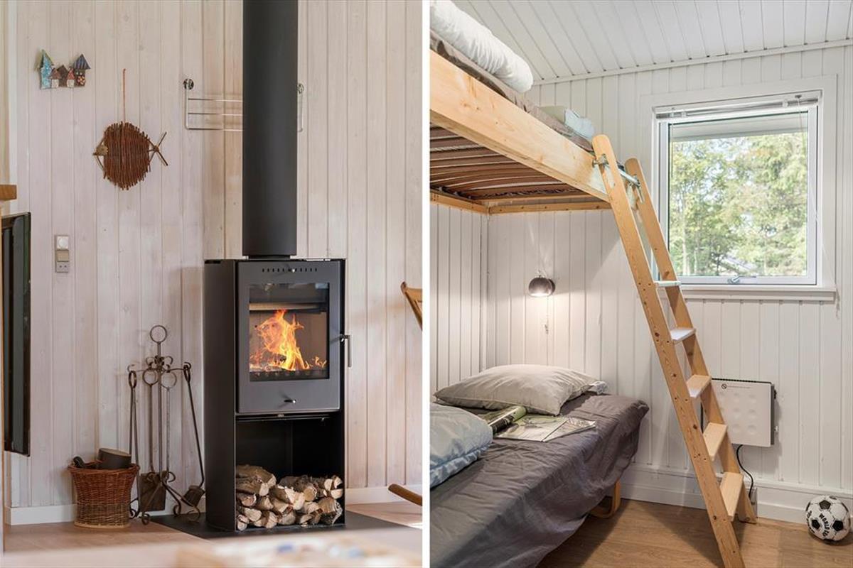 Mit seinen drei Schlafräumen eignet sich das Ferienhaus gut für sechs Personen. Einer der Schlafräume befindet sich im Nebengebäude, direkt neben dem Hauseingang. Ein Duschbadezimmer steht für Sie bereit. Die Küche und der Wohnraum bilden eine offene Einheit, die als gemütlicher Aufenthaltsbereich fungiert, der zum gemeinsamen Kochen, zum gemeinsamen Essen und zum Entspannen einlädt. An kühlen Tagen garantieren der Kaminofen und die Wärmepumpe angenehme Temperaturen. An warmen Sommertagen stellen Sie hingegen die Terrassentüren weit auf, sodass eine offene Verbindung zwischen dem Hausinnerem und der schönen Holzterrasse geschaffen wird.