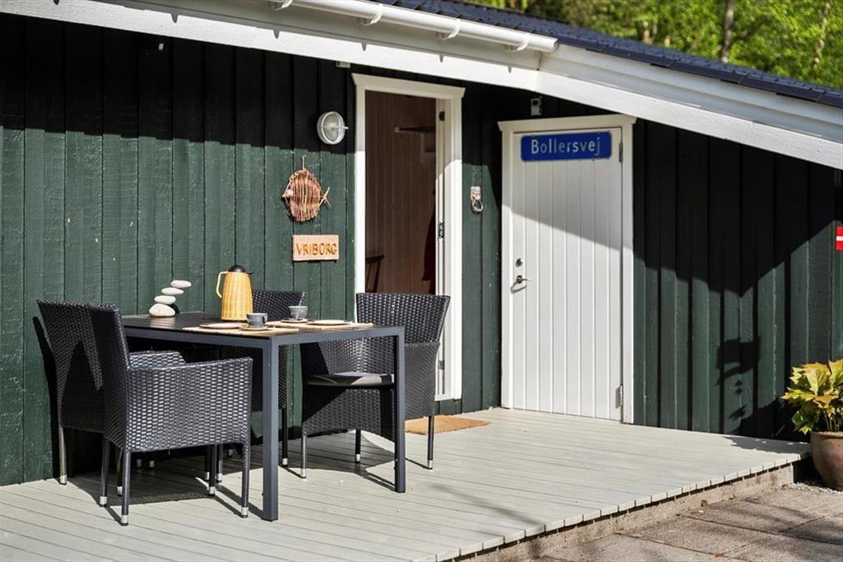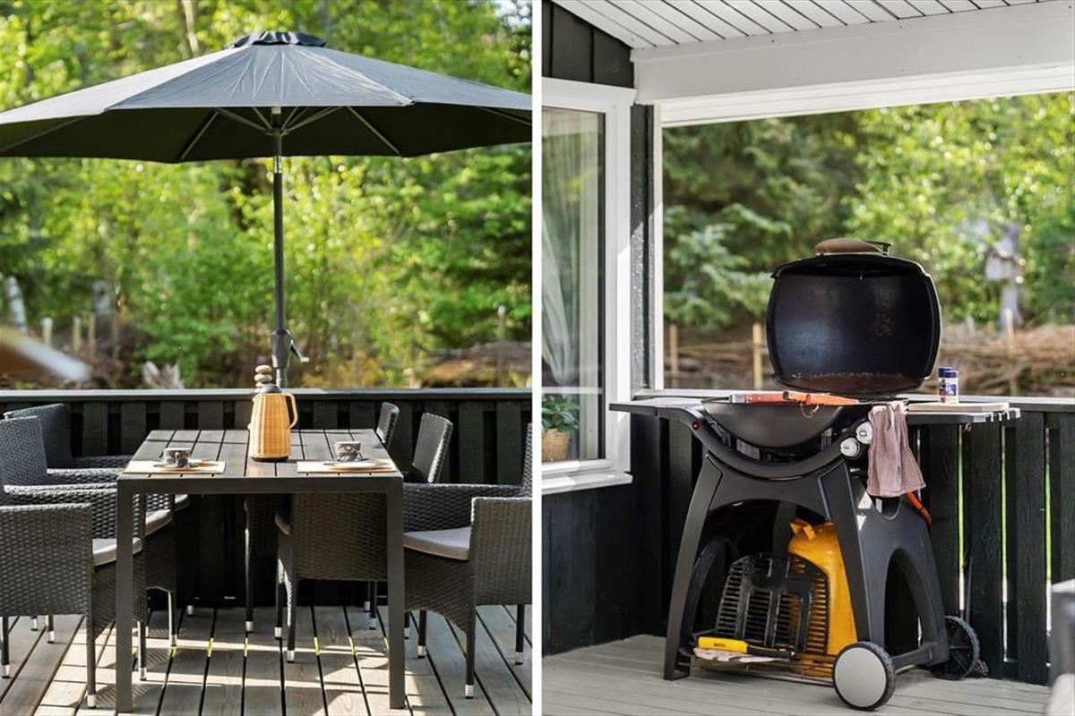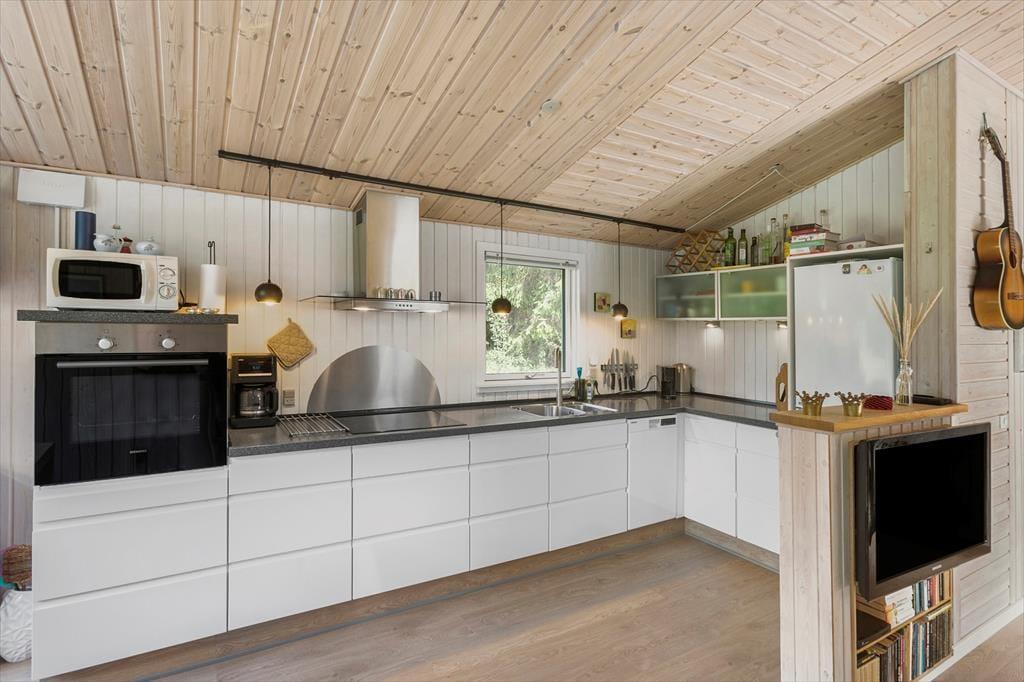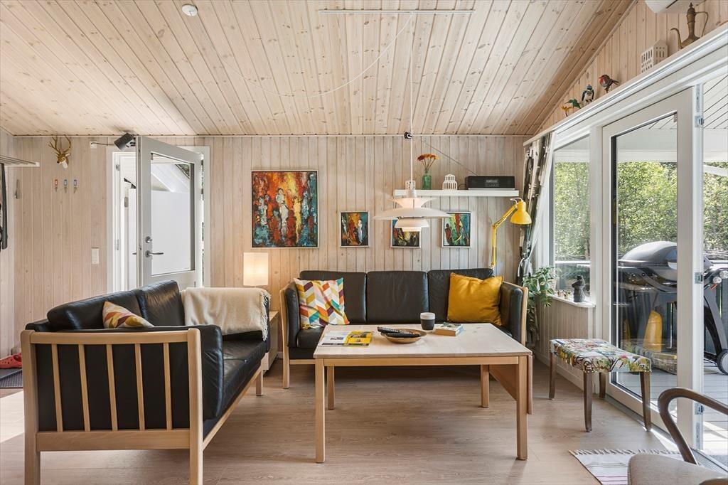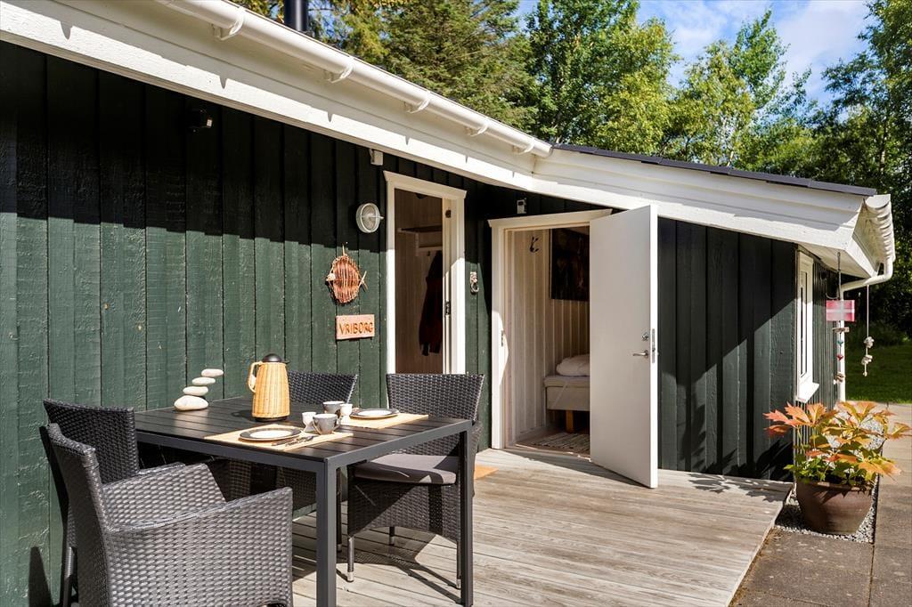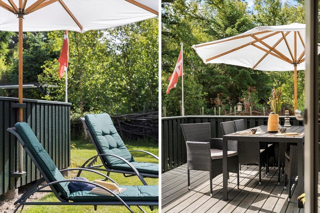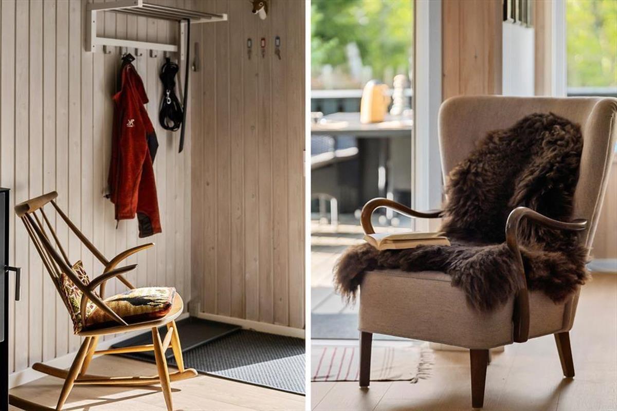 Mit seinen drei Schlafräumen eignet sich das Ferienhaus gut für sechs Personen. Einer der Schlafräume befindet sich im Nebengebäude, direkt neben dem Hauseingang. Ein Duschbadezimmer steht für Sie bereit. Die Küche und der Wohnraum bilden eine offene Einheit, die als gemütlicher Aufenthaltsbereich fungiert, der zum gemeinsamen Kochen, zum gemeinsamen Essen und zum Entspannen einlädt. An kühlen Tagen garantieren der Kaminofen und die Wärmepumpe angenehme Temperaturen. An warmen Sommertagen stellen Sie hingegen die Terrassentüren weit auf, sodass eine offene Verbindung zwischen dem Hausinnerem und der schönen Holzterrasse geschaffen wird.