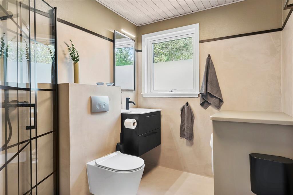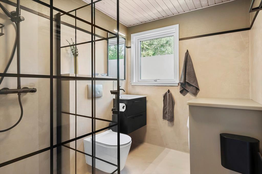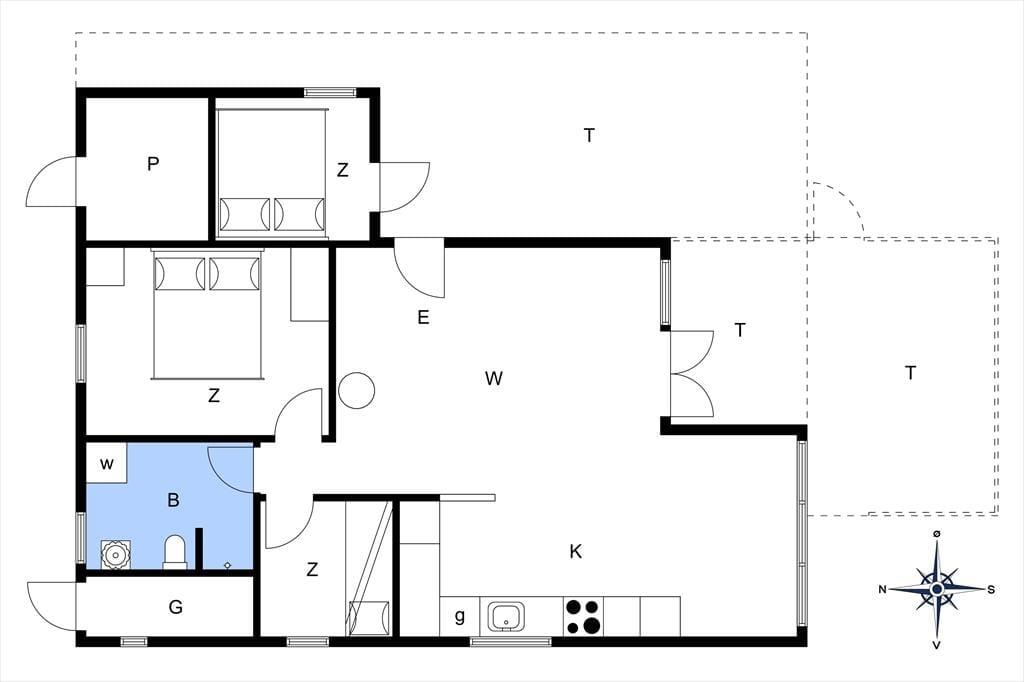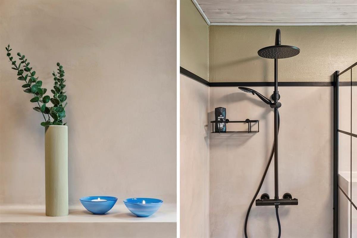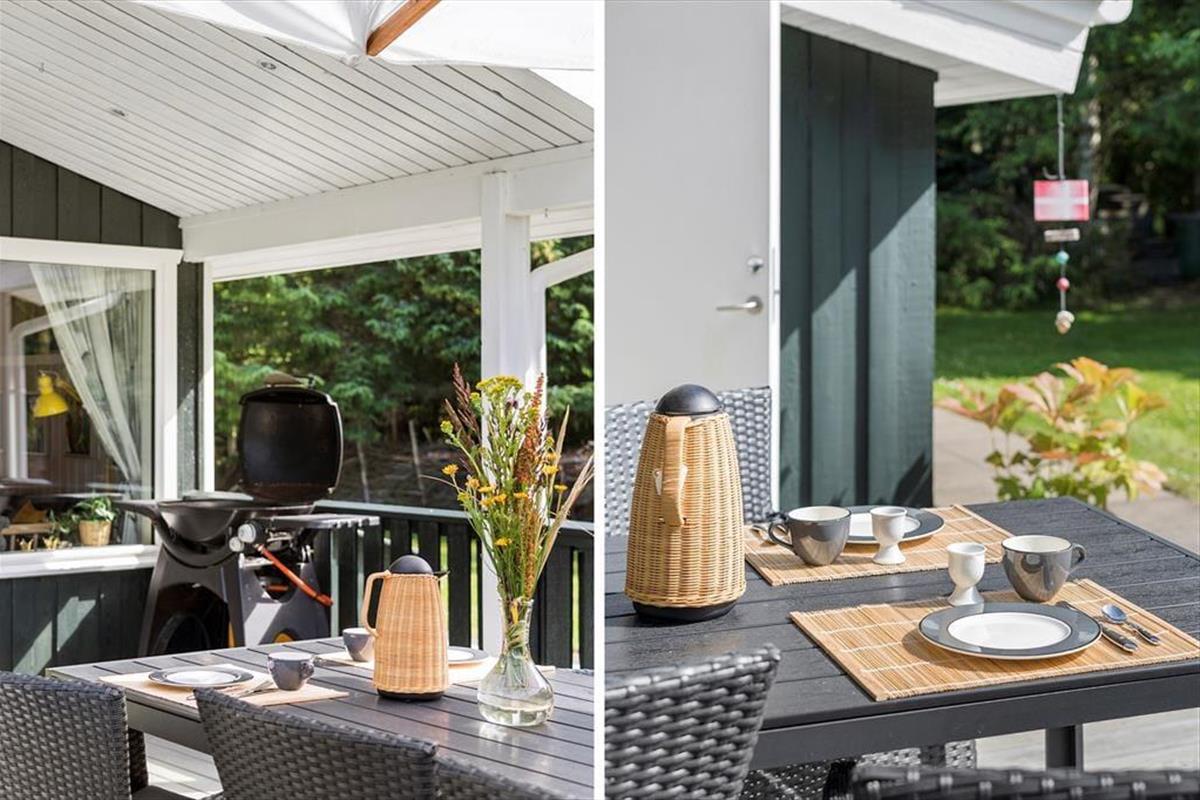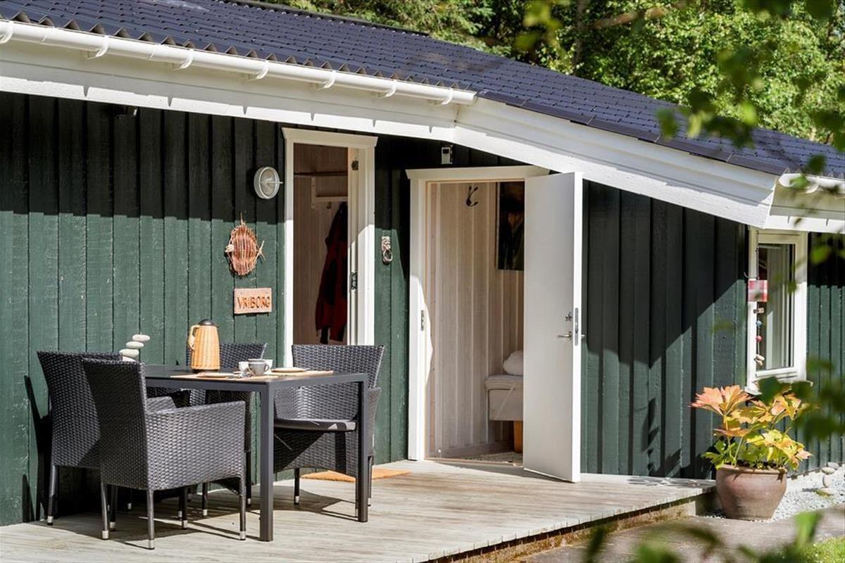 Mit seinen drei Schlafräumen eignet sich das Ferienhaus gut für sechs Personen. Einer der Schlafräume befindet sich im Nebengebäude, direkt neben dem Hauseingang. Ein Duschbadezimmer steht für Sie bereit. Die Küche und der Wohnraum bilden eine offene Einheit, die als gemütlicher Aufenthaltsbereich fungiert, der zum gemeinsamen Kochen, zum gemeinsamen Essen und zum Entspannen einlädt. An kühlen Tagen garantieren der Kaminofen und die Wärmepumpe angenehme Temperaturen. An warmen Sommertagen stellen Sie hingegen die Terrassentüren weit auf, sodass eine offene Verbindung zwischen dem Hausinnerem und der schönen Holzterrasse geschaffen wird.