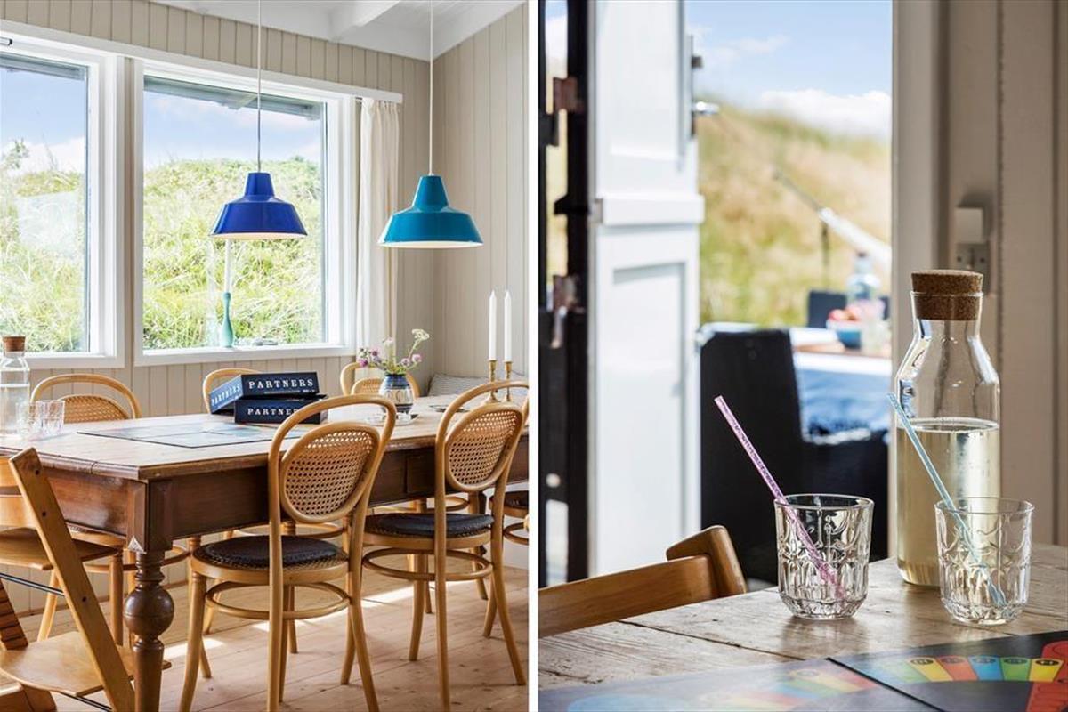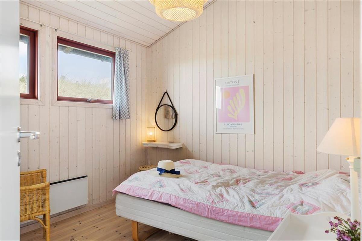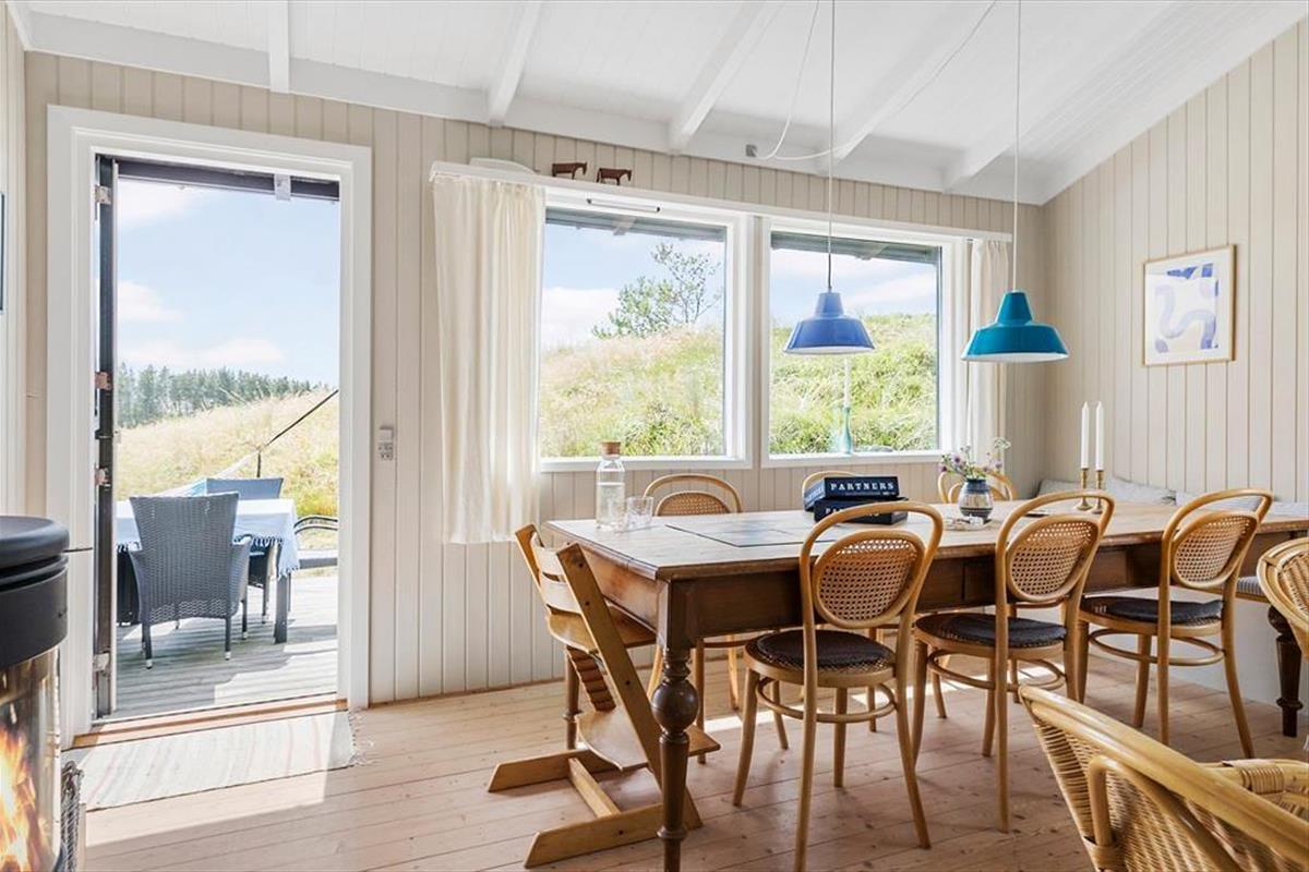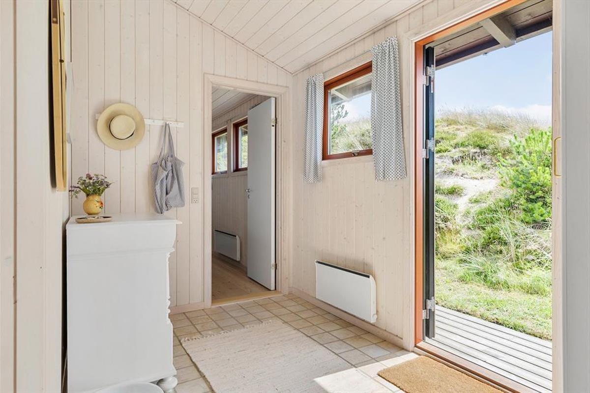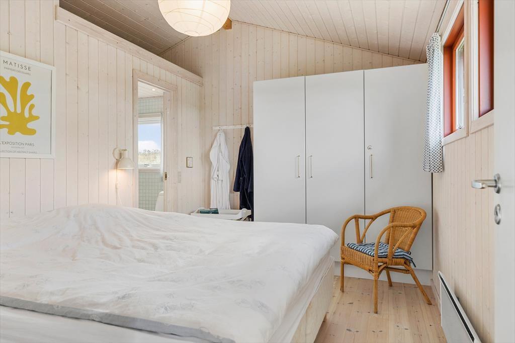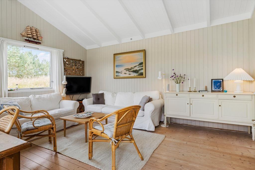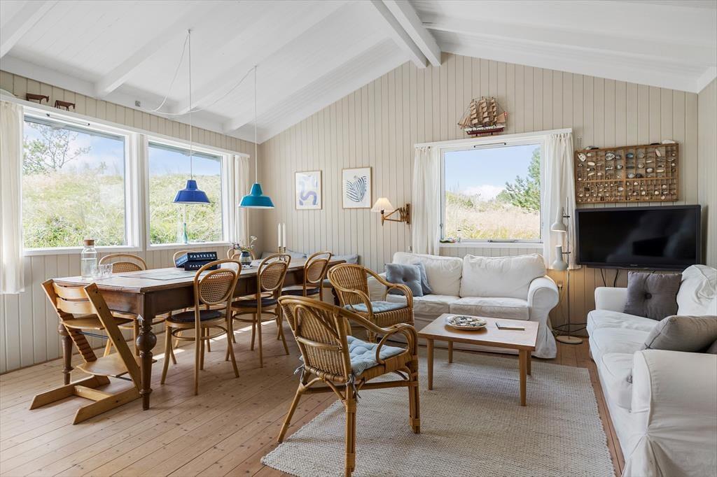 Rødhus begeistert mit einer atemberaubenden weitläufigen Landschaft. Vom Inneren dieses Ferienhauses blicken Sie über Heideflächen, Strandhafer und Dünengräser und genießen das wunderbare Gefühl, eins mit der Natur zu sein. Die klassische Einrichtung mit hohen Decken, Holzwänden und einer gemütlichen Möblierung harmoniert sehr schön mit der Naturidylle ringsum. Auf unnötigen Schnickschnack und Luxus wurde in diesem Haus bewusst verzichtet. Im Gegenzug verwöhnt Sie eine überaus gemütliche und erholsame Atmosphäre und Sie genießen angenehm viel Platz für das wertvolle Beisammensein im Familienkreis. Die Wohnfläche umfasst 100 m² und unterteilt sich in einen Wohnraum, eine Küche, einen Hauswirtschaftsbereich und zwei Badezimmer. Vier Schlafräume stehen ebenfalls zu Ihrer Verfügung. Drei der Schlafräume begrüßen Sie mit je einem Doppelbett. Im vierten Schlafraum stehen hingegen zwei Einzelbetten bereit.