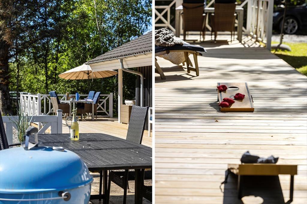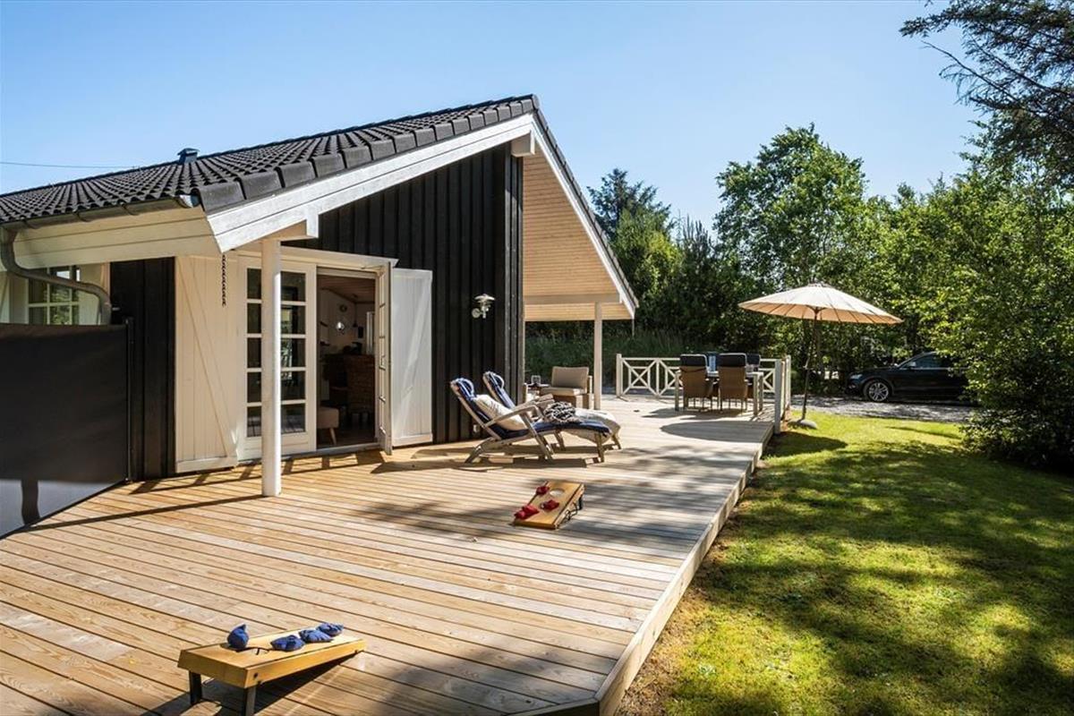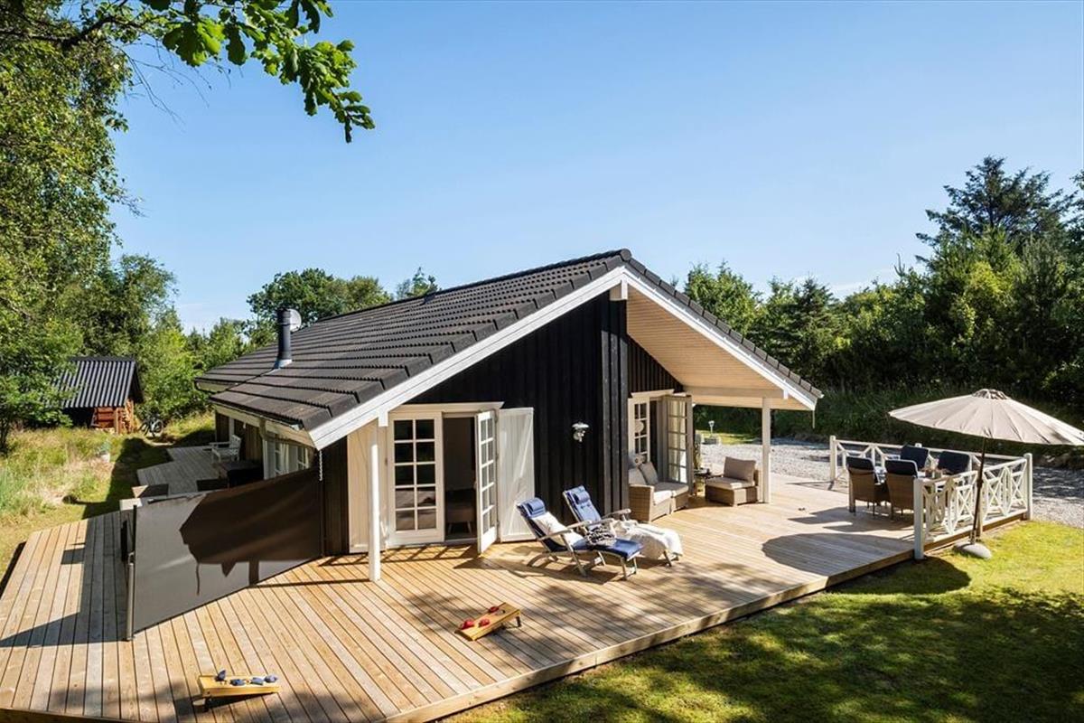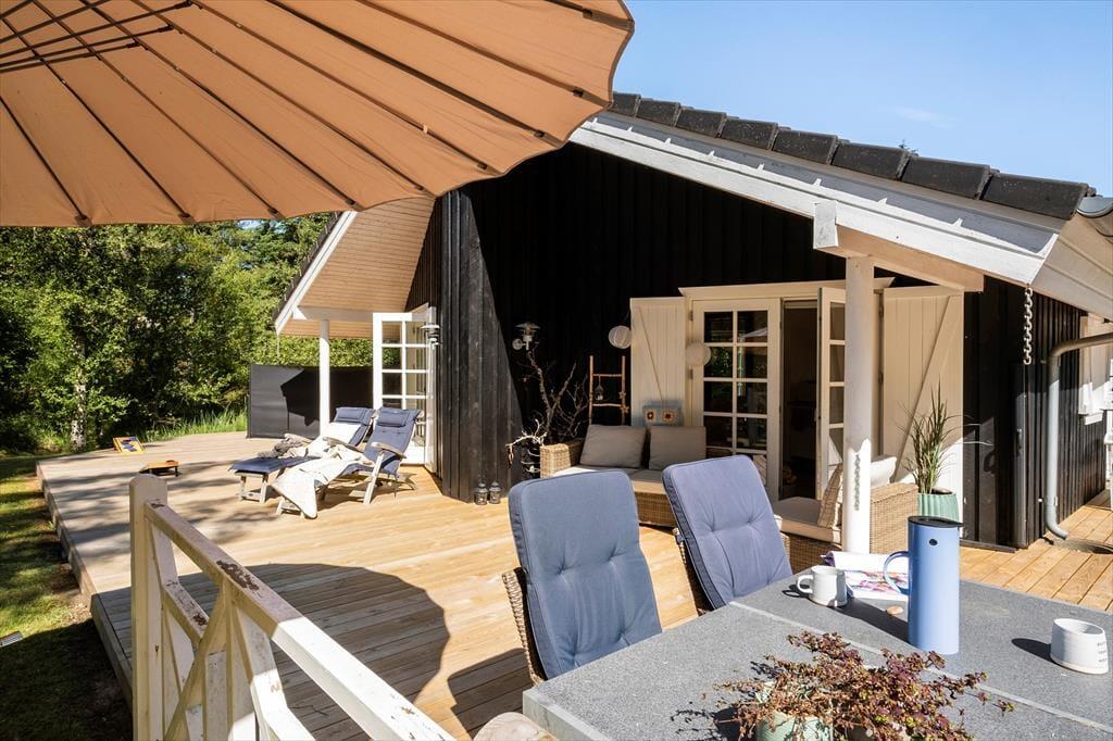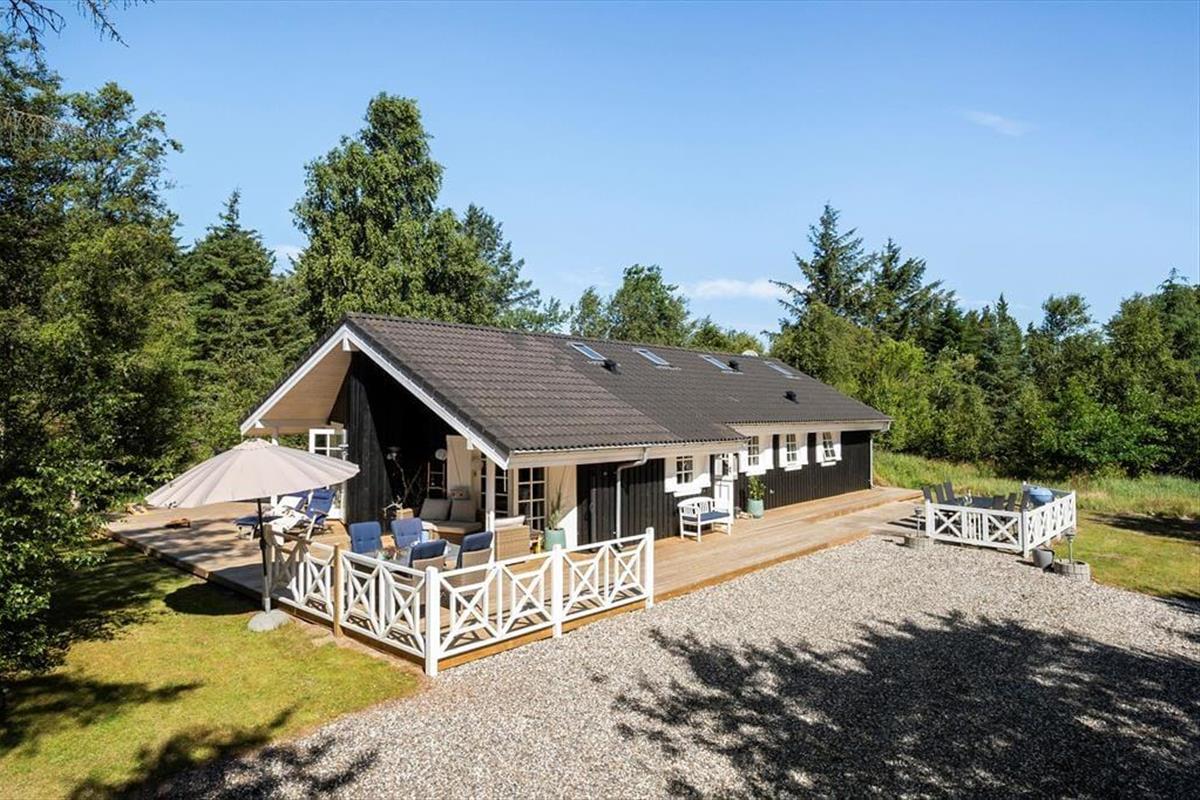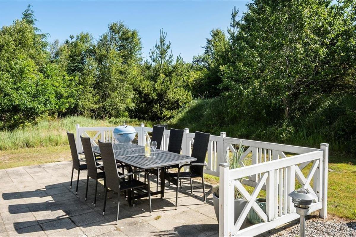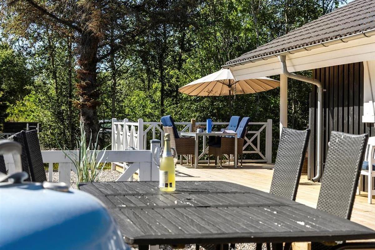 Dieses Ferienhaus liegt auf einem einmalig schönen und von Hecken und hohen Bäumen umgebenen Naturgrundstück. Das Grundstück bildet den Inbegriff für Frieden und Ruhe. Die Grasfläche bietet sich allerdings auch hervorragend für Ballspiele und dergleichen an. Drei Seiten des Hauses sind von Terrassen umgeben. Ein Terrassenbereich ist zudem überdacht. Hier können Sie es sich in aller Ruhe gemütlich machen, das Leben unter freiem Himmel in vollen Zügen genießen und den singenden Vögeln und rauschenden Baumwipfeln lauschen. An den hellen,lauen Sommerabenden laden die Terrassen zu geselligen Runden mit einem köstlichen Essen vom Grill und einem guten Glas Wein ein.