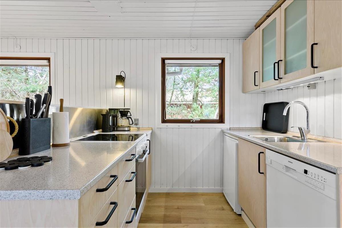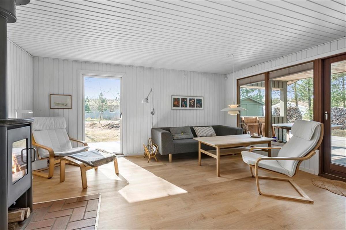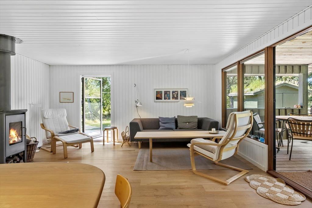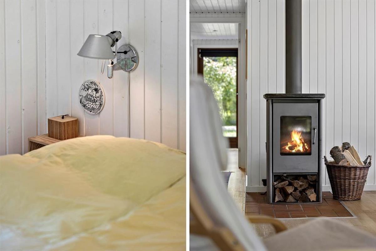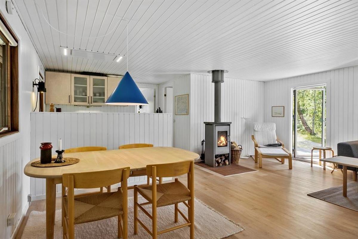 Im Inneren des Hauses ist es angenehm sich aufzuhalten Dank der hellen Einrichtung und den bewährten Bauplan. Im Wohnzimmer trägt ein Kaminofen zu der gemütlichen Atmosphäre bei, und so ist es auch hilfreich für die Ferienstimmung, dass Sie auf das schöne Naturgrundstück hinausschauen können, ungeachtet dessen ob Sie sich es im Sofa gemütlich machen, am Esstisch sitzen oder in der offenen Küche das Essen zubereiten. Im Übrigen steht im Wohnzimmer eine Couch, perfekt für einen Mittagsschlaf oder das Lesen der Zeitung. Der Nachtschlaf kann in einem der zwei Schlafzimmer stattfinden, welche insgesamt Platz für vier Personen bieten. Ein Badezimmer mit Dusche und ein Haushaltsraum mit Waschmaschine sind ebenfalls ein Plus des Hauses.