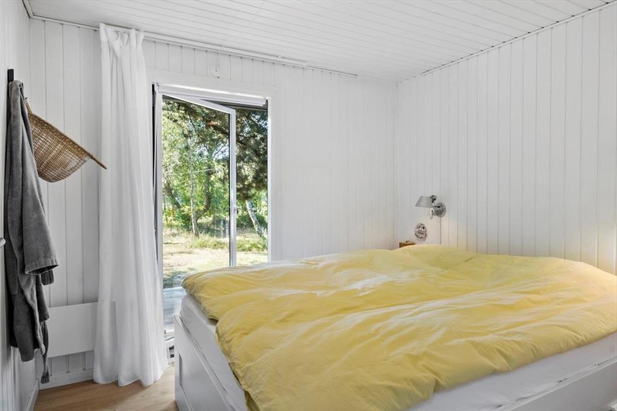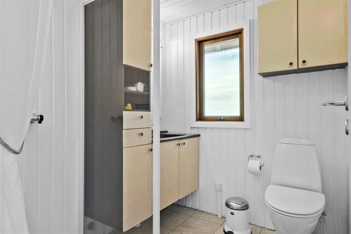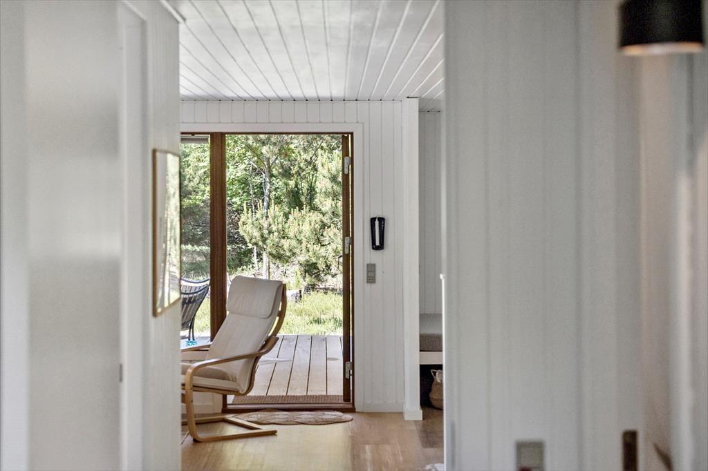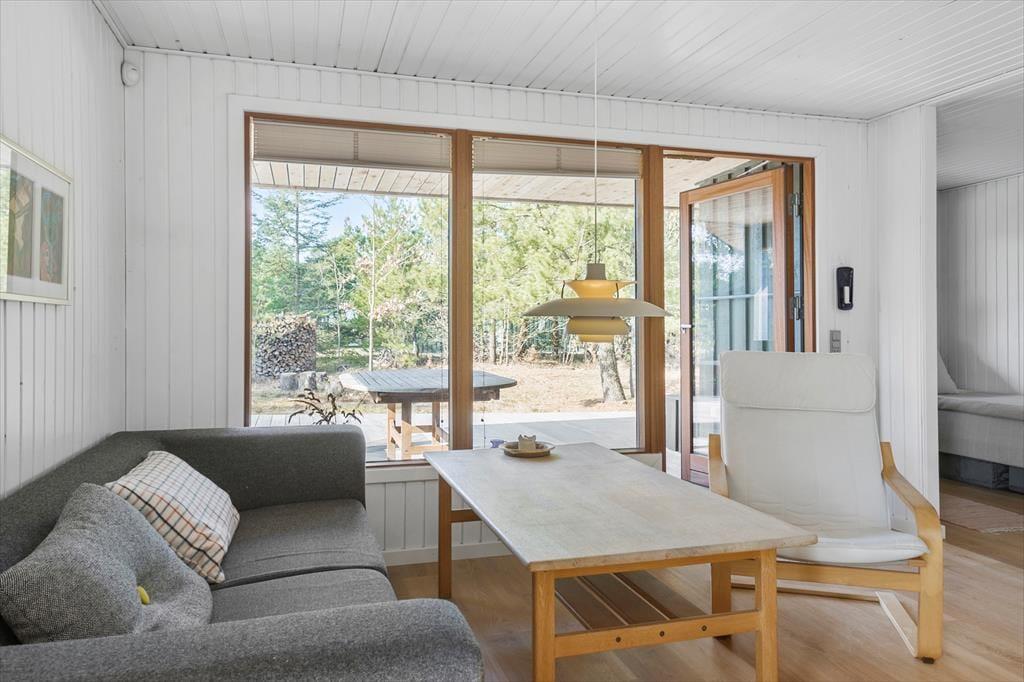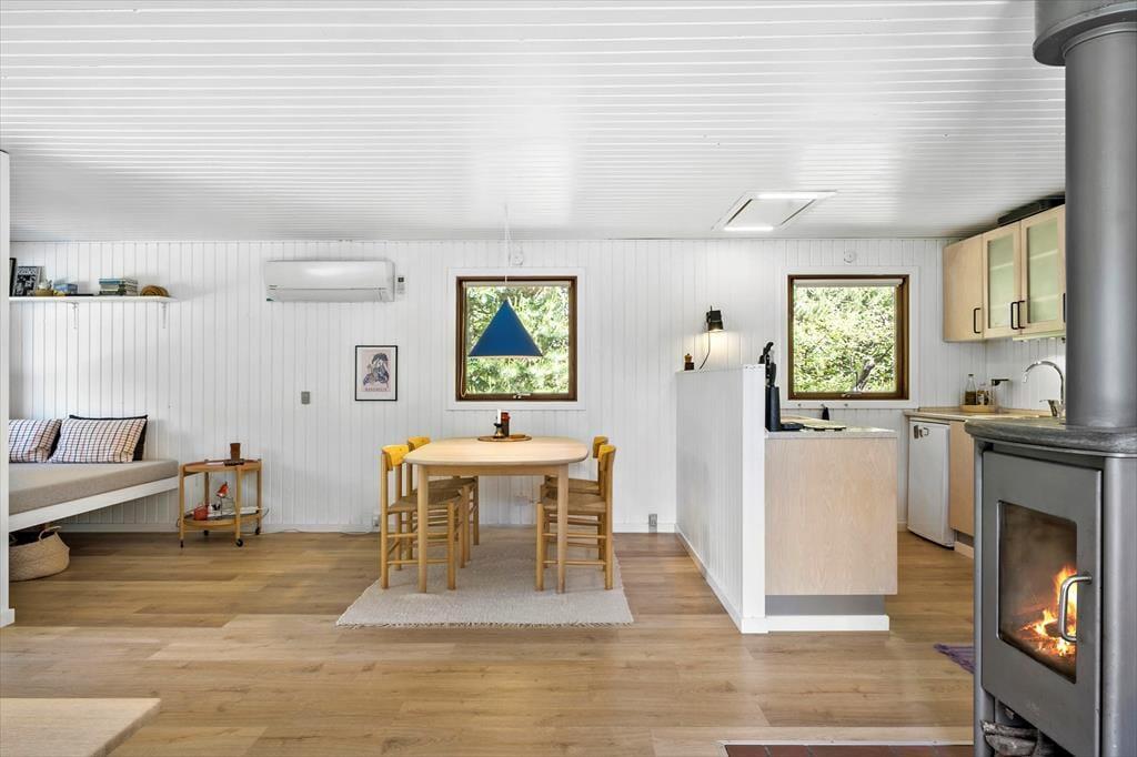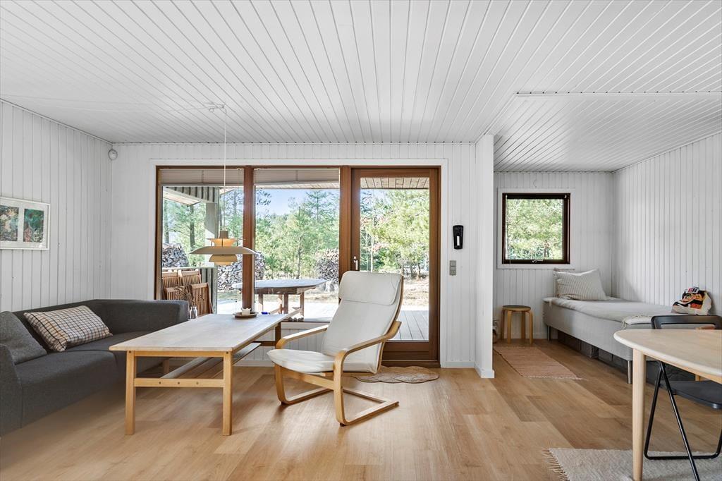Im Inneren des Hauses ist es angenehm sich aufzuhalten Dank der hellen Einrichtung und den bewährten Bauplan. Im Wohnzimmer trägt ein Kaminofen zu der gemütlichen Atmosphäre bei, und so ist es auch hilfreich für die Ferienstimmung, dass Sie auf das schöne Naturgrundstück hinausschauen können, ungeachtet dessen ob Sie sich es im Sofa gemütlich machen, am Esstisch sitzen oder in der offenen Küche das Essen zubereiten. Im Übrigen steht im Wohnzimmer eine Couch, perfekt für einen Mittagsschlaf oder das Lesen der Zeitung. Der Nachtschlaf kann in einem der zwei Schlafzimmer stattfinden, welche insgesamt Platz für vier Personen bieten. Ein Badezimmer mit Dusche und ein Haushaltsraum mit Waschmaschine sind ebenfalls ein Plus des Hauses.