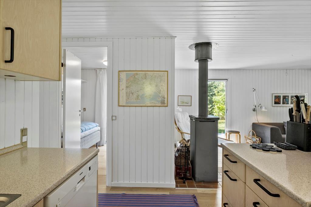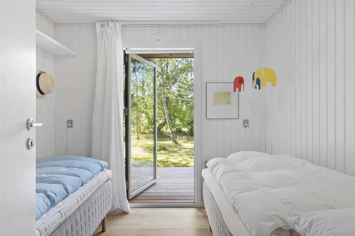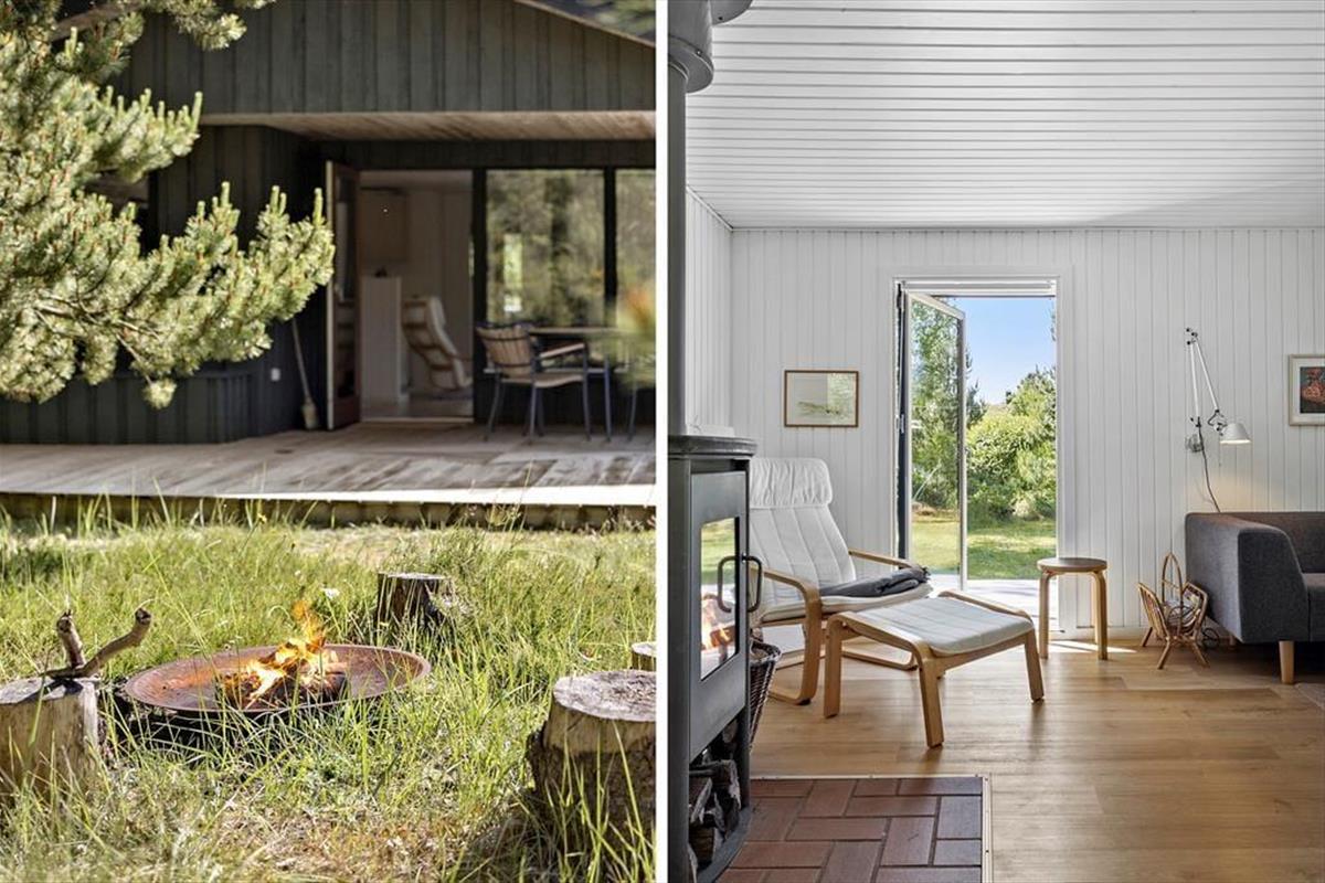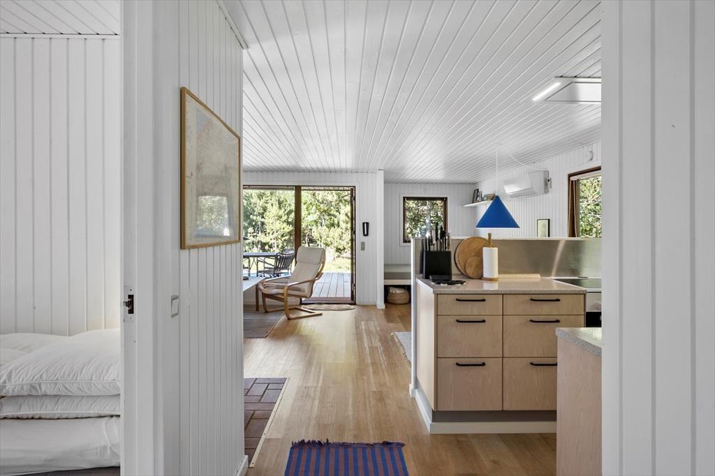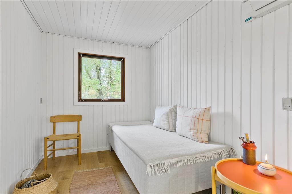Im Inneren des Hauses ist es angenehm sich aufzuhalten Dank der hellen Einrichtung und den bewährten Bauplan. Im Wohnzimmer trägt ein Kaminofen zu der gemütlichen Atmosphäre bei, und so ist es auch hilfreich für die Ferienstimmung, dass Sie auf das schöne Naturgrundstück hinausschauen können, ungeachtet dessen ob Sie sich es im Sofa gemütlich machen, am Esstisch sitzen oder in der offenen Küche das Essen zubereiten. Im Übrigen steht im Wohnzimmer eine Couch, perfekt für einen Mittagsschlaf oder das Lesen der Zeitung. Der Nachtschlaf kann in einem der zwei Schlafzimmer stattfinden, welche insgesamt Platz für vier Personen bieten. Ein Badezimmer mit Dusche und ein Haushaltsraum mit Waschmaschine sind ebenfalls ein Plus des Hauses.