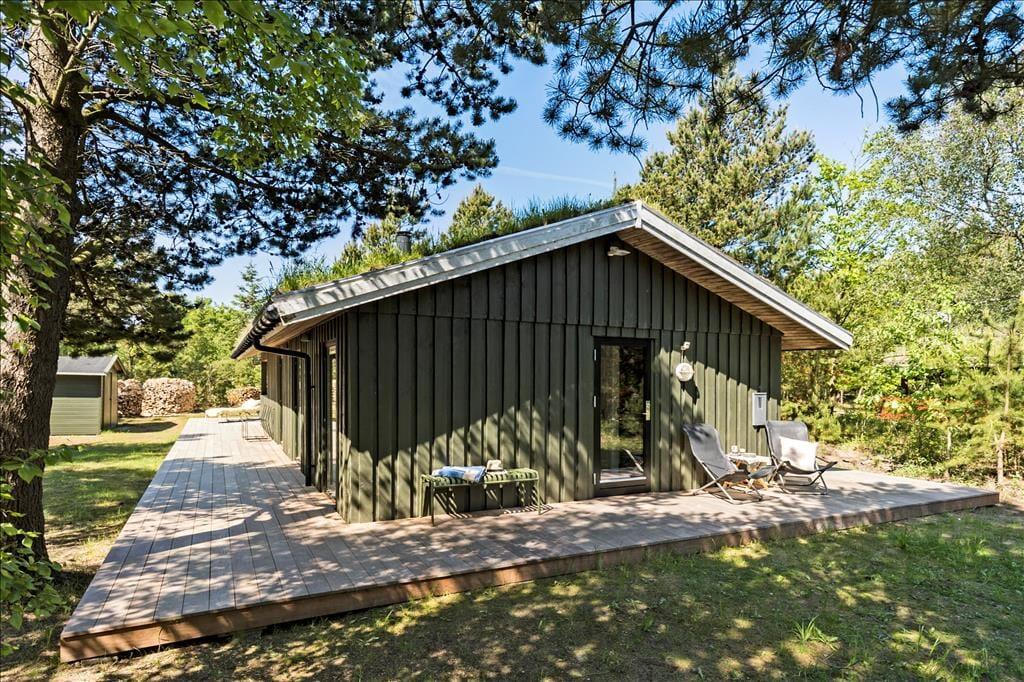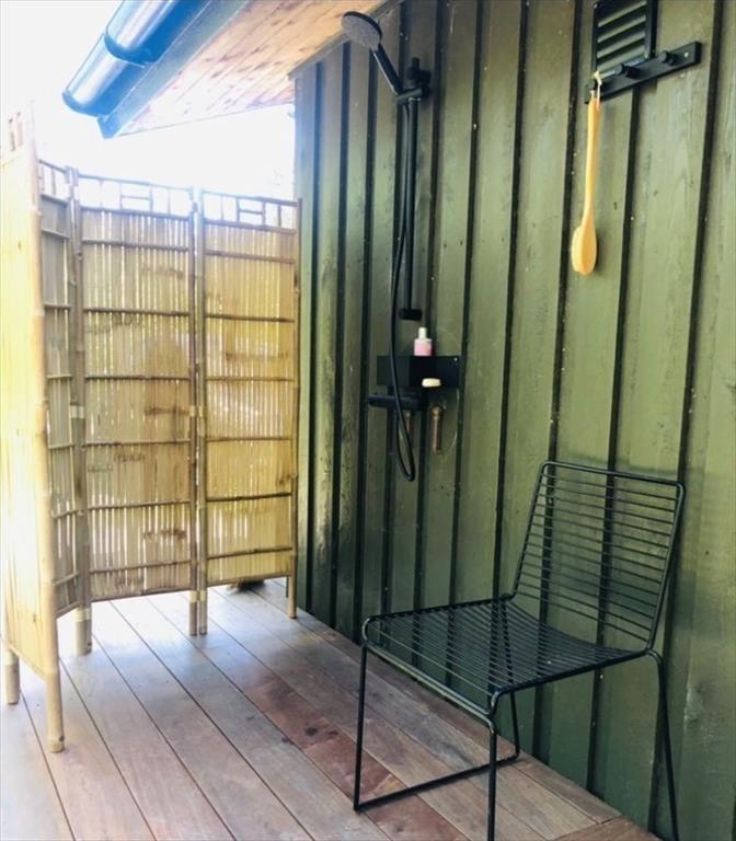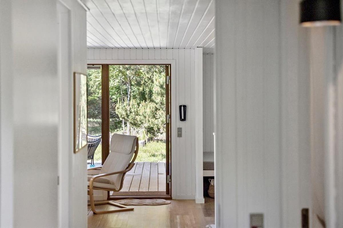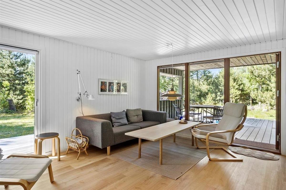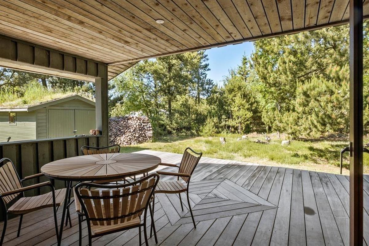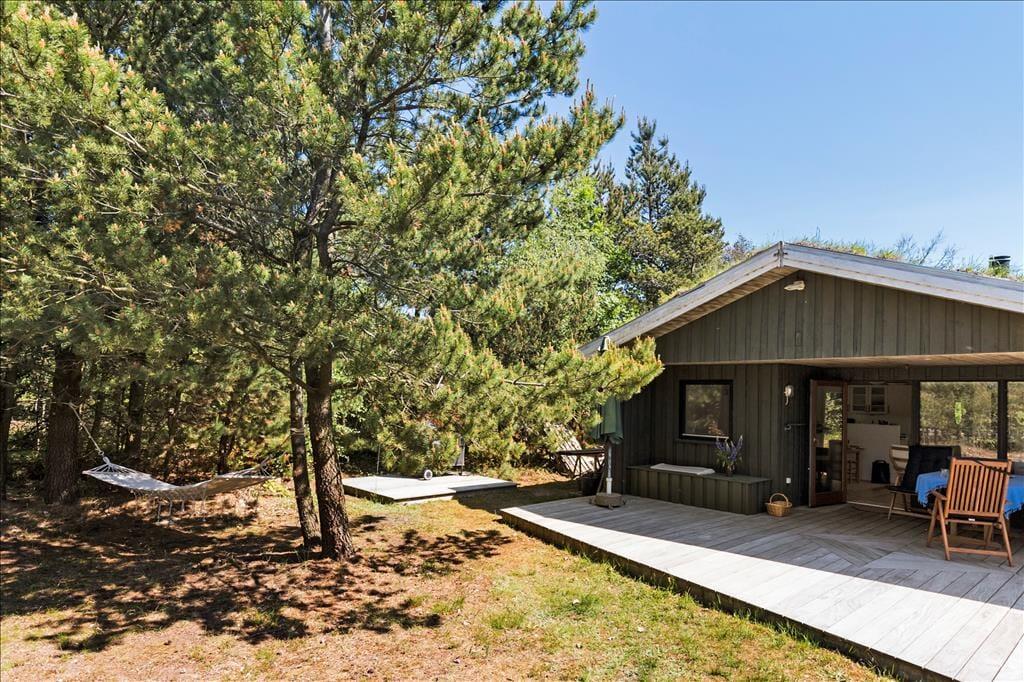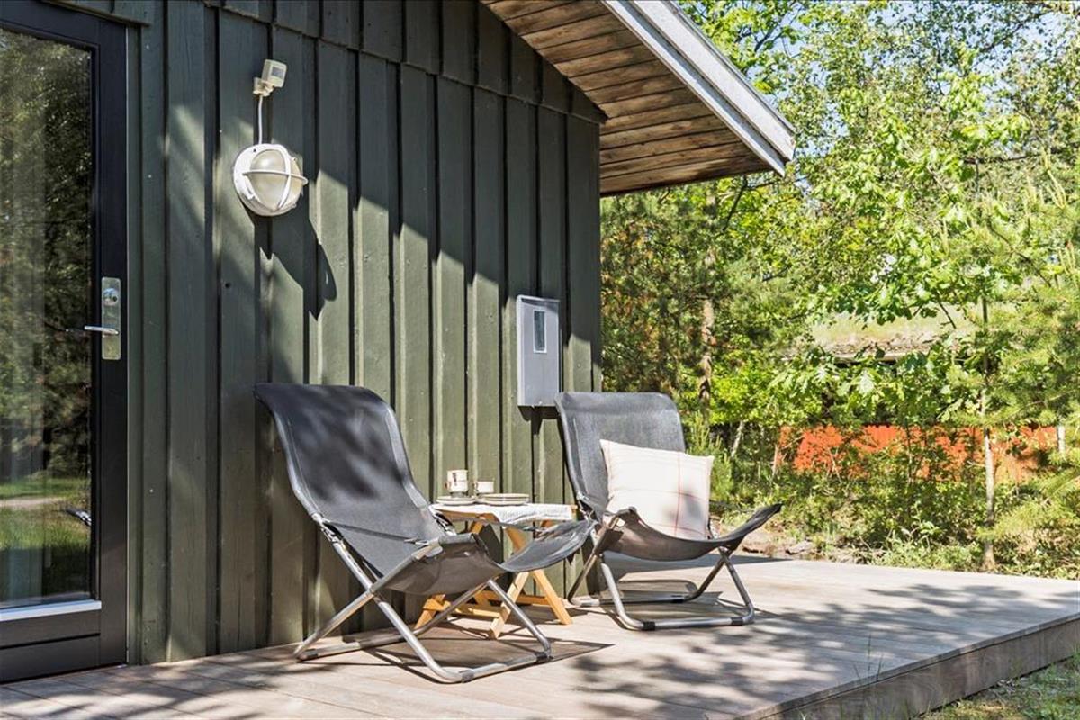 Eine große Glastür im Wohnzimmer gibt Ihnen direkten Ausgang zu einer grossen teilweise überdachten Holzterrasse, welche sich auf drei Seiten des Hauses ausbreitet. Deshalb ist es leicht den ganzen Tag über einen sonnenreichen Platz zu finden – und sogar mit Aussicht auf die hübschen Kiefern, welche auf dem Naturgrundstück stehen. Ist es sommerlich warm, gönnen Sie sich im Schatten eine Pause in der Hängematte, außerdem gibt es die Möglichkeit sich unter der Außen Dusche zu erfrischen.
