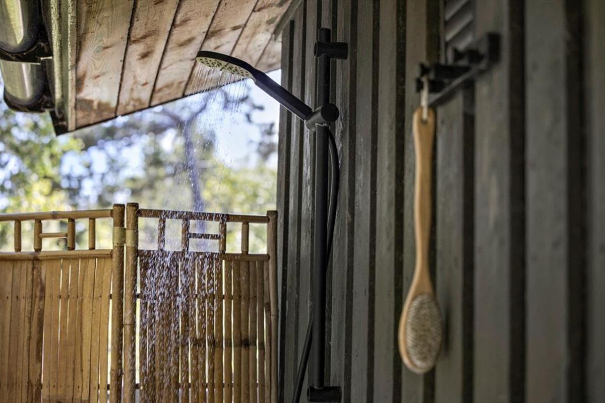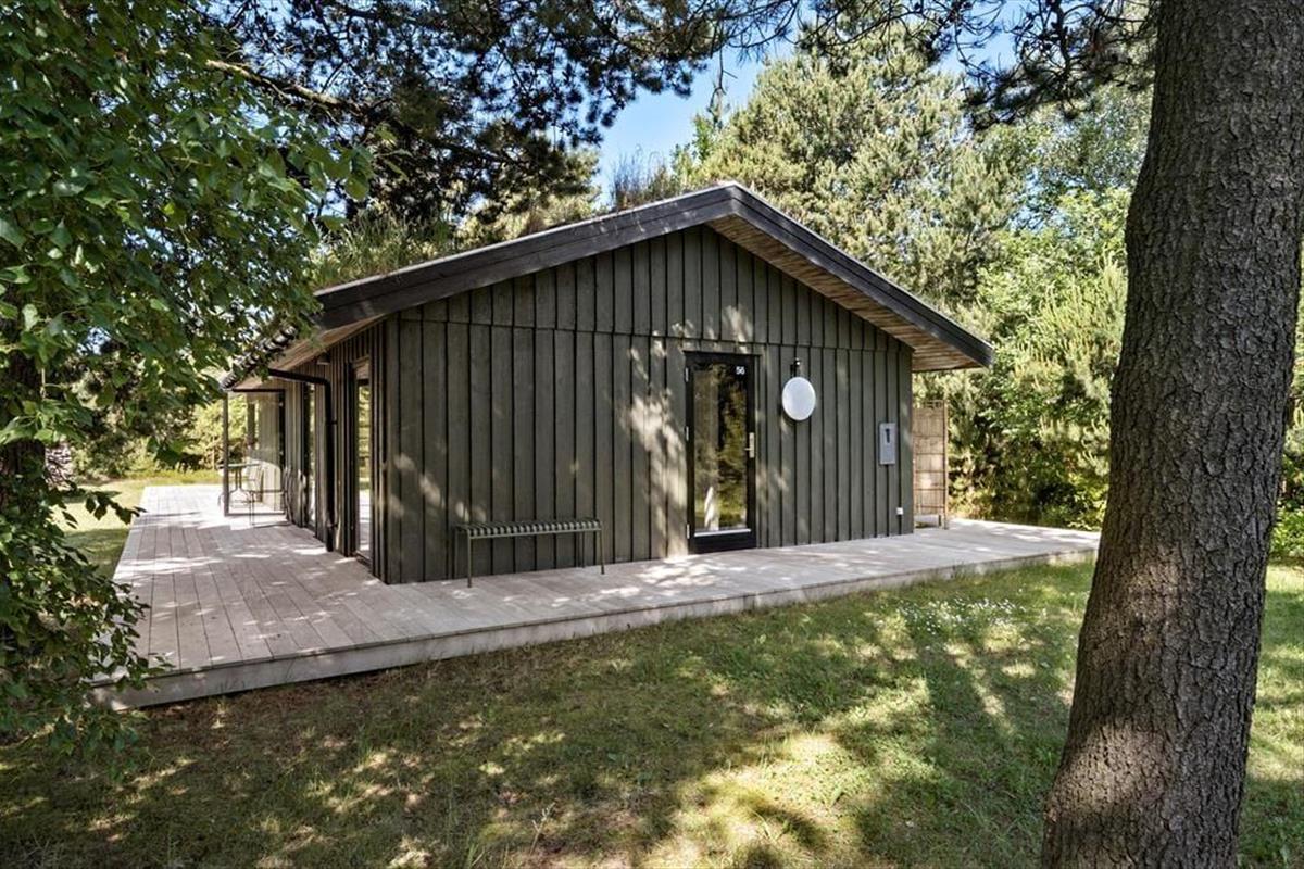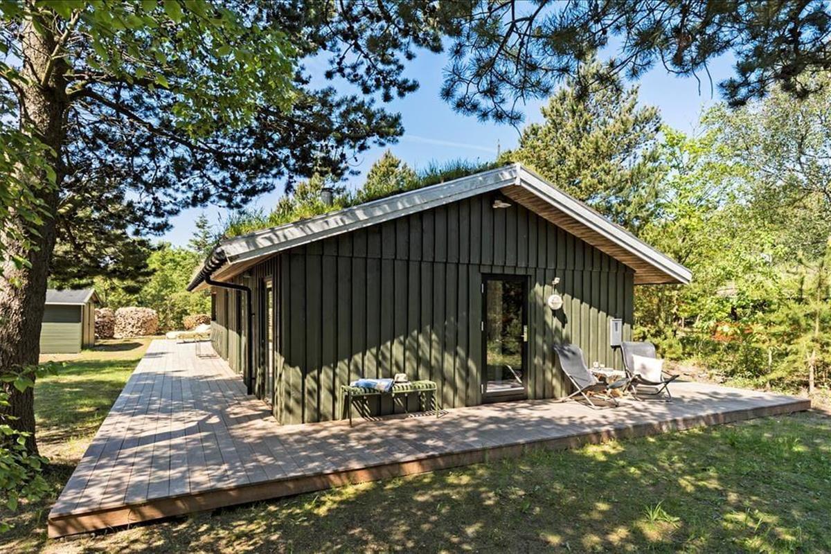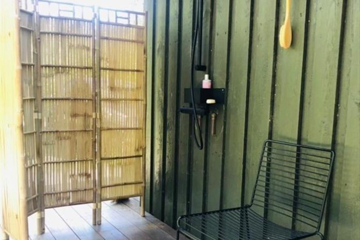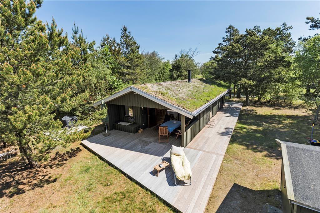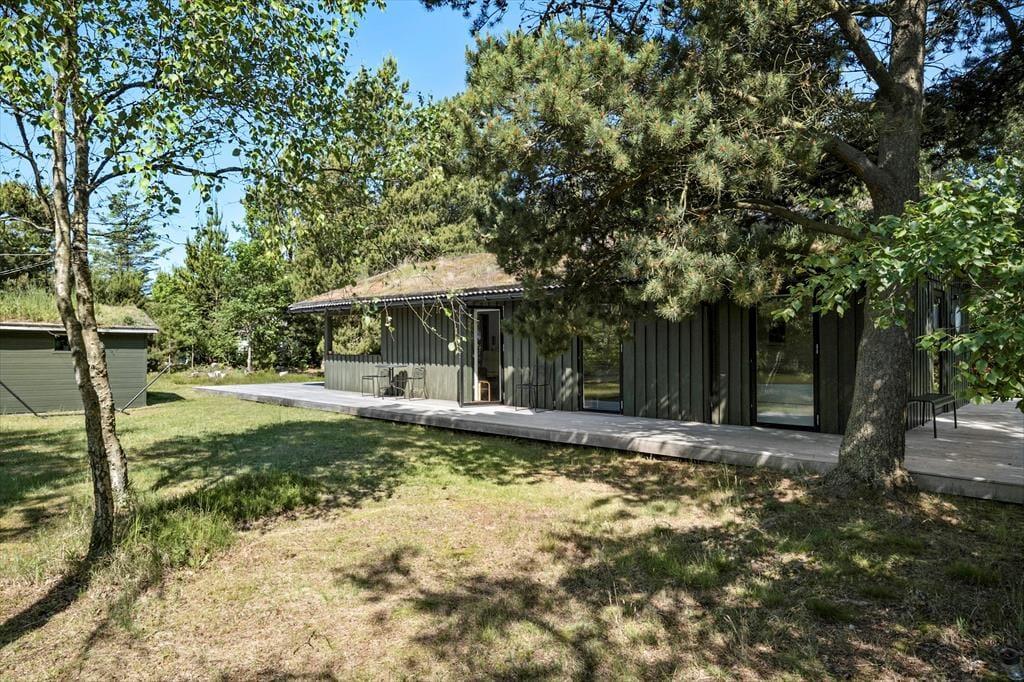 Eine große Glastür im Wohnzimmer gibt Ihnen direkten Ausgang zu einer grossen teilweise überdachten Holzterrasse, welche sich auf drei Seiten des Hauses ausbreitet. Deshalb ist es leicht den ganzen Tag über einen sonnenreichen Platz zu finden – und sogar mit Aussicht auf die hübschen Kiefern, welche auf dem Naturgrundstück stehen. Ist es sommerlich warm, gönnen Sie sich im Schatten eine Pause in der Hängematte, außerdem gibt es die Möglichkeit sich unter der Außen Dusche zu erfrischen.