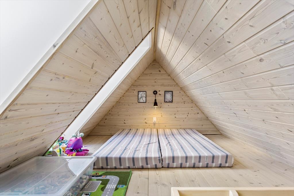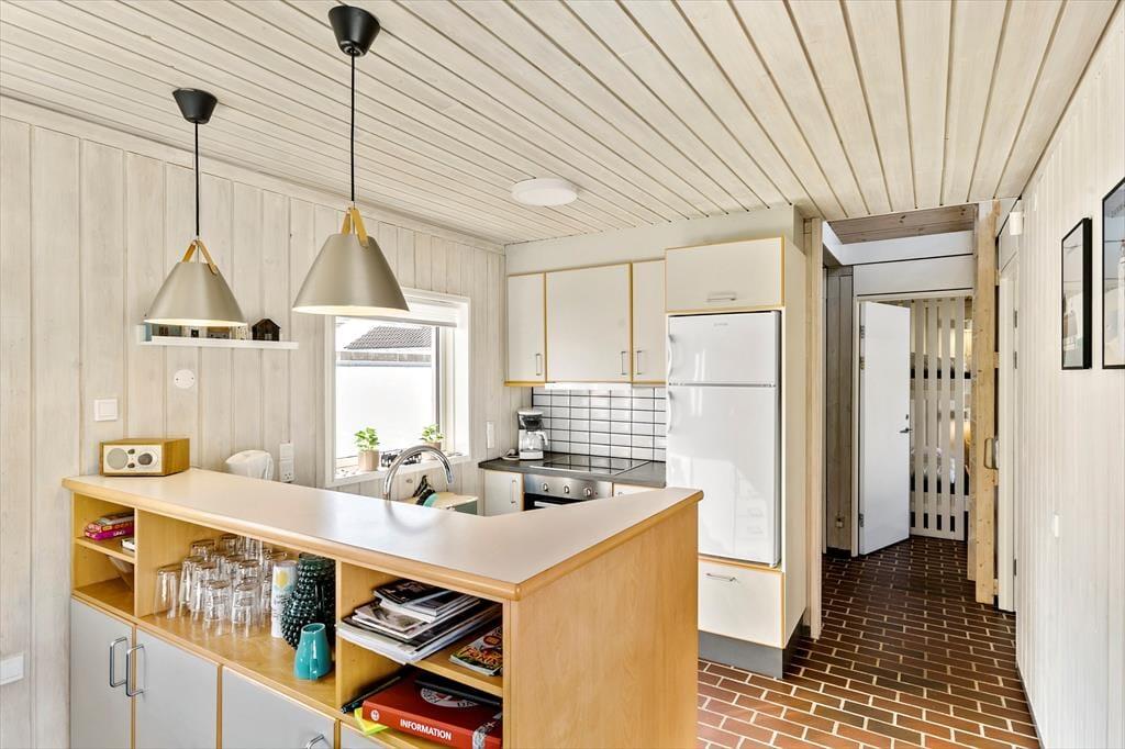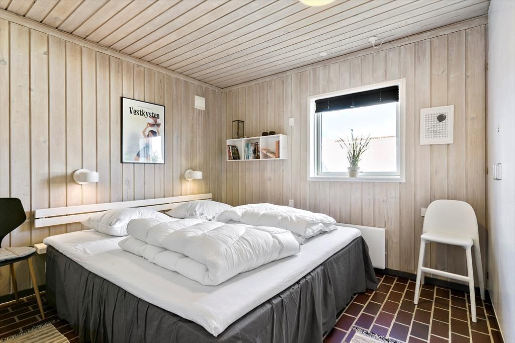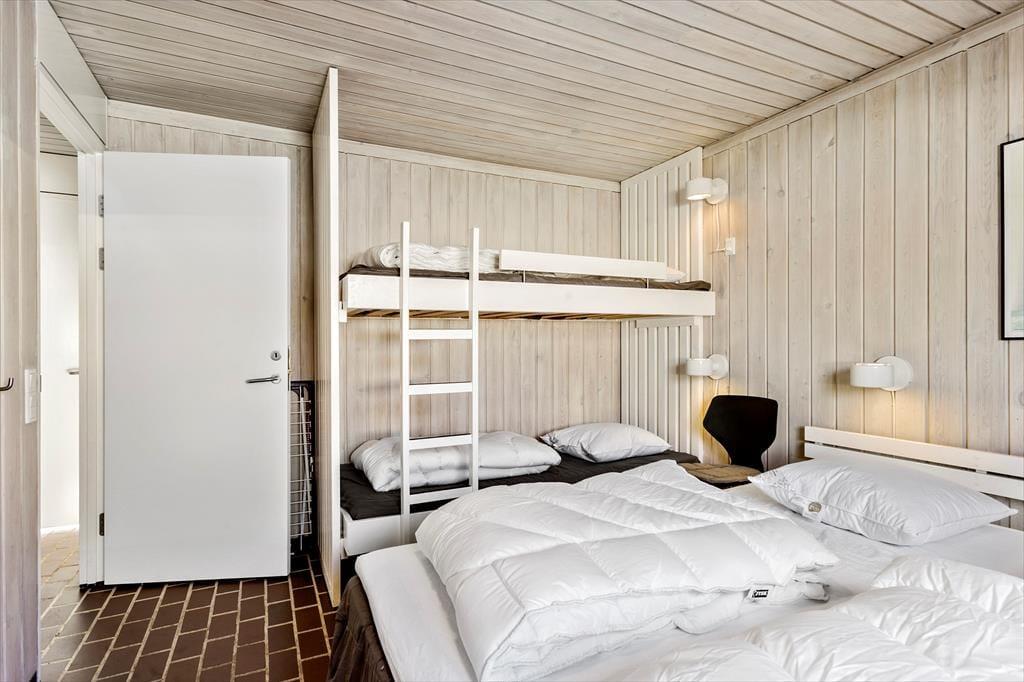 Die Atmosphäre, in dem 2017 gründlich renovierten Ferienhaus, ist hell und einladend. Im Wohnbereich, in dem Wohnzimmer und Küche offen miteinander verbunden sind, tragen der durchströmende Lichteinfall und die klassischen Ferienhauselemente, wie der Kaminofen und die helle Holzverkleidung der Wände und Decken zu einem angenehmen Raumgefühl bei. Der Grundriss des Hauses ist gut durchdacht und aufgeteilt, sodass sich sechs Personen hier wohlfühlen können. Eines der Schlafzimmer ist mit einem Doppelbett ausgestattet, während das zweite Schlafzimmer sowohl mit einem Doppelbett als auch mit einem Etagenbett eingerichtet ist – außerdem gibt es auf dem Schlafboden noch Matratzen, sodass Sie sich gut aufteilen können. Hier hört man auch das Meer. Weiterhin gibt es ein Badezimmer, das modern und funktionell mit einer Duschnische, Waschbecken und Fußbodenheizung ausgestattet ist.
